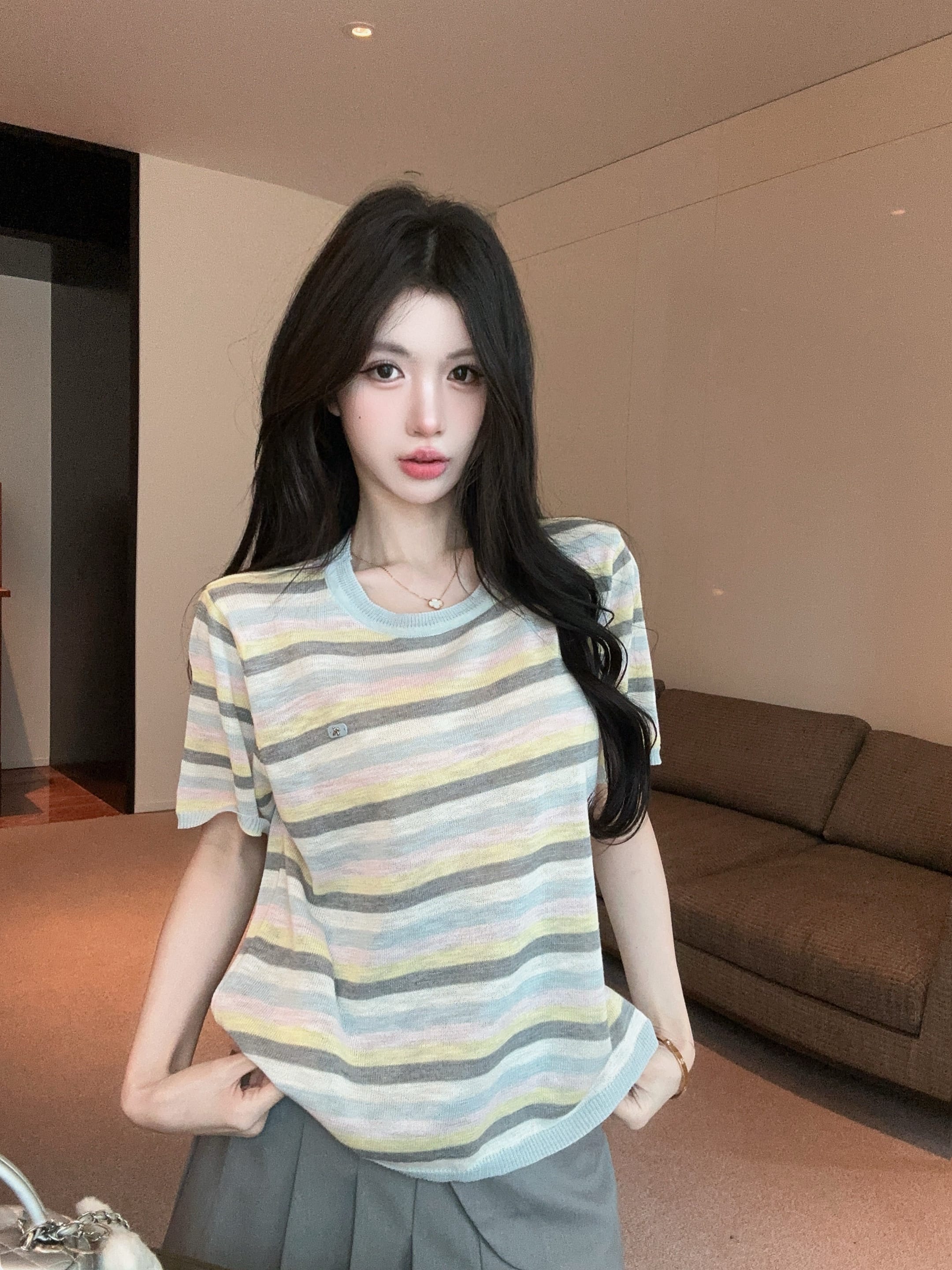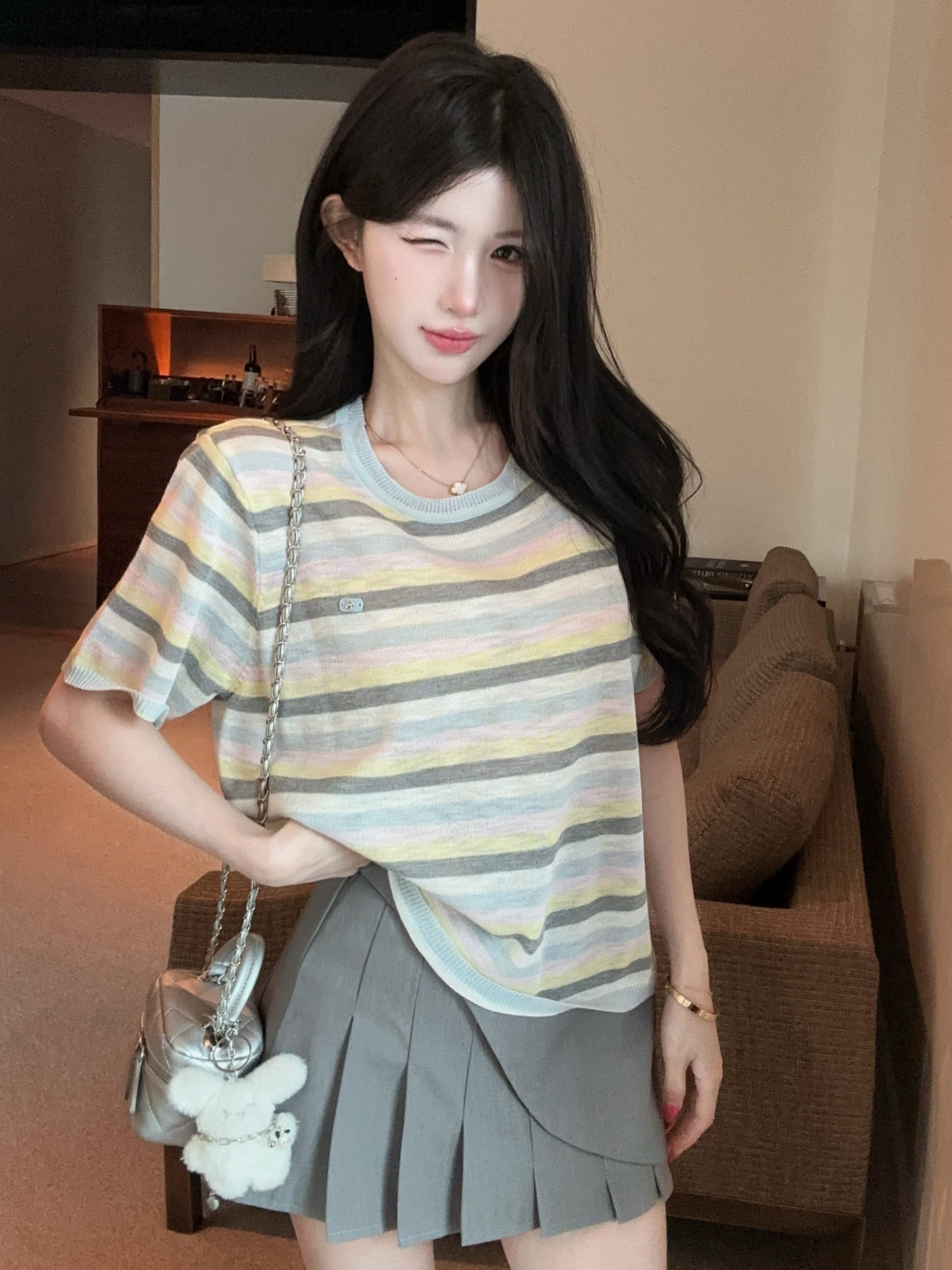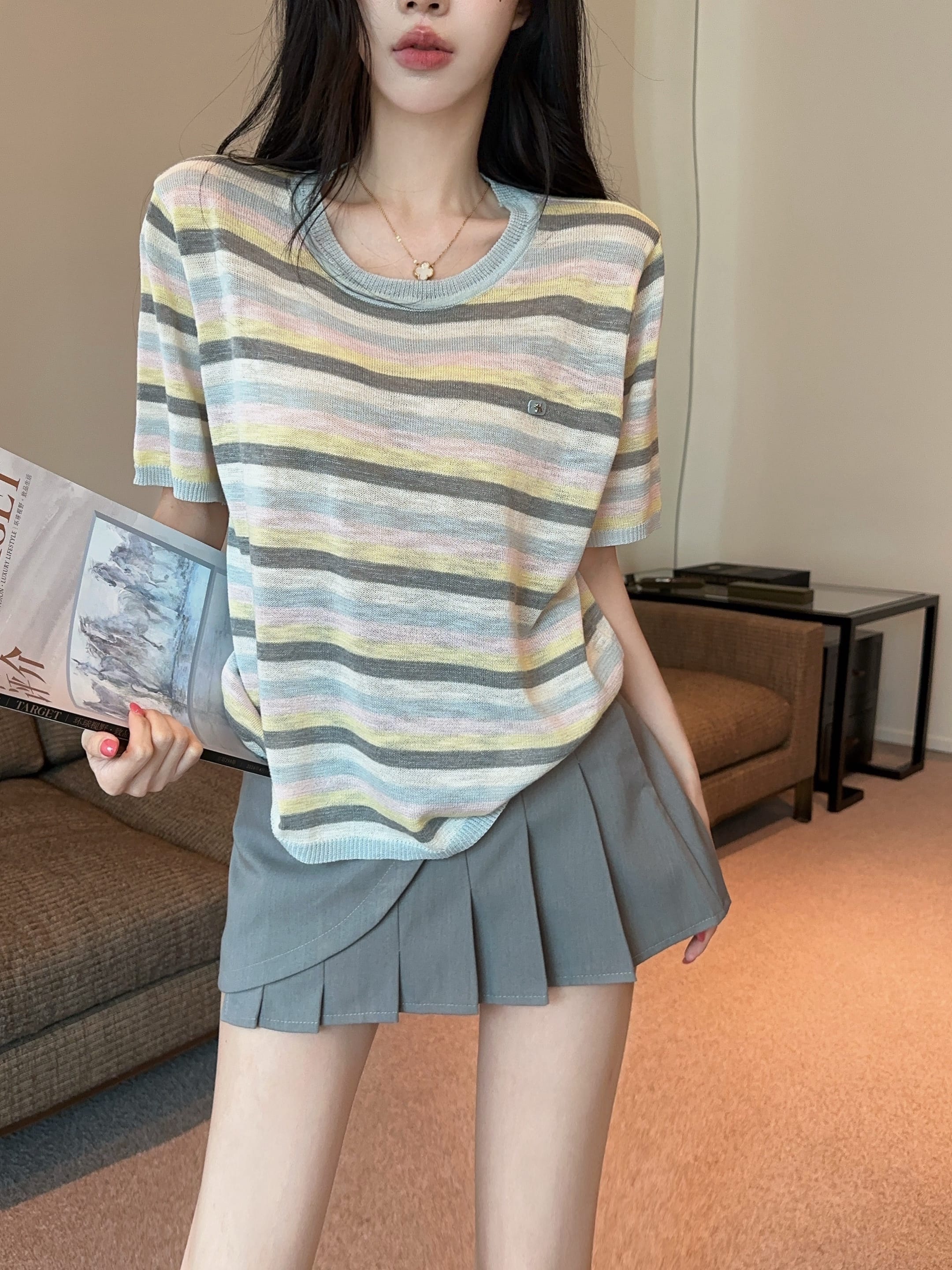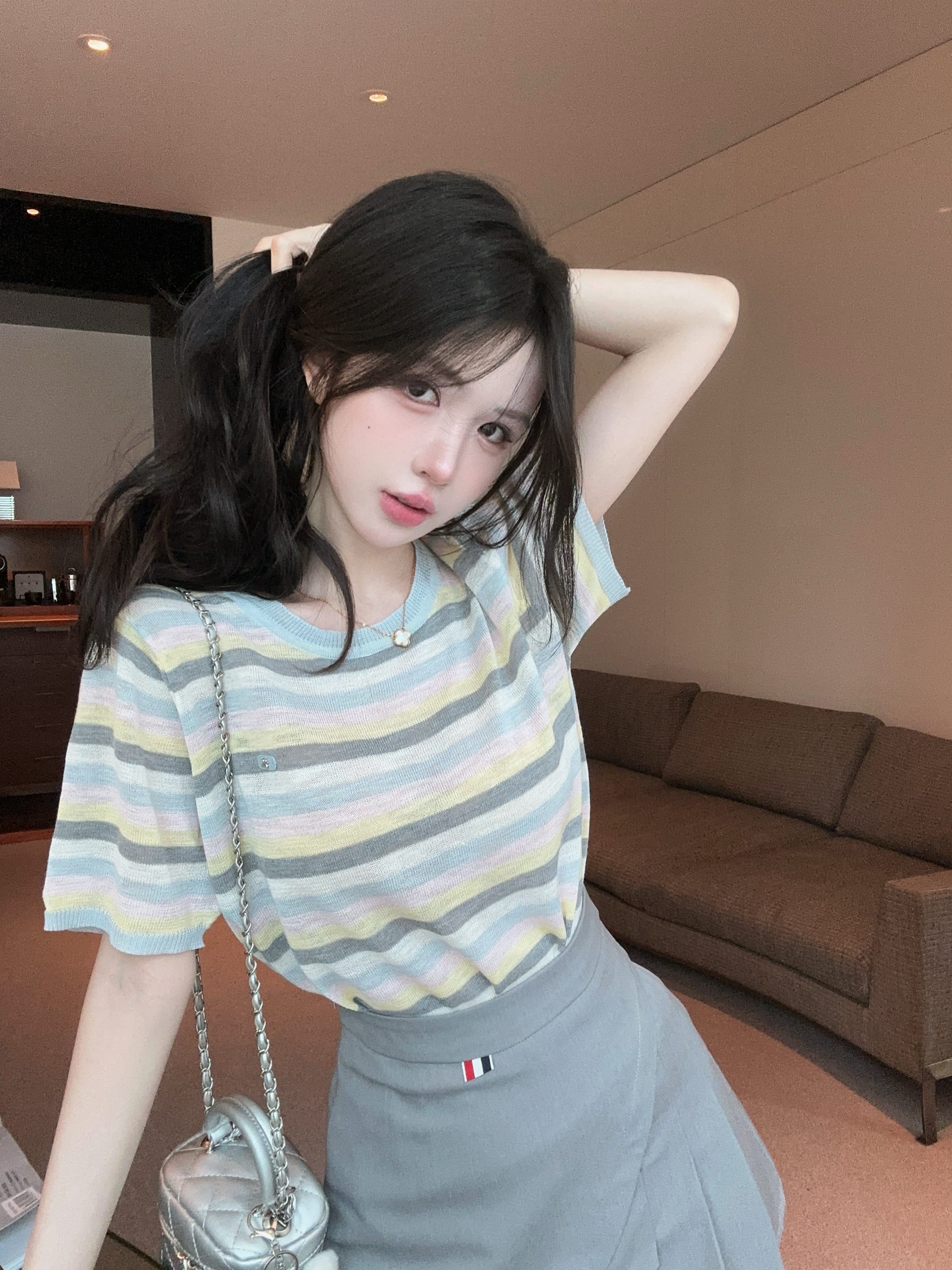 BY17998# 洋气薄款圆领柔软撞色条纹针织短袖T恤时尚短裙两件套装 服裝批發女裝批發服飾貨源