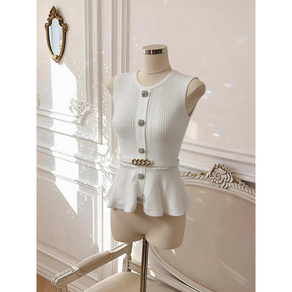 BY18032# 温柔风圆领无袖背心女收腰荷叶边单排扣针织上衣 服裝批發女裝批發服飾貨源