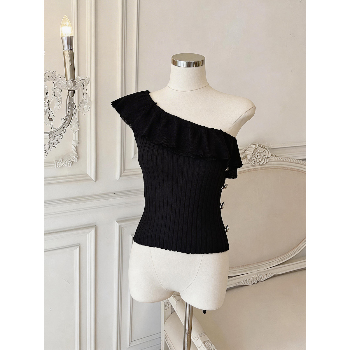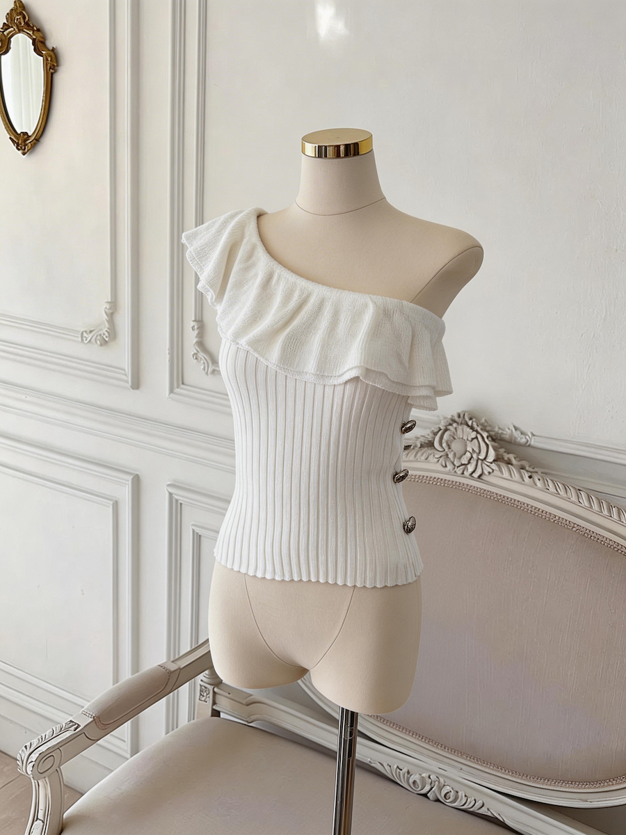 BY18033# 法式单肩荷叶边针织衫女夏新款修身无袖露背短上衣 服裝批發女裝批發服飾貨源