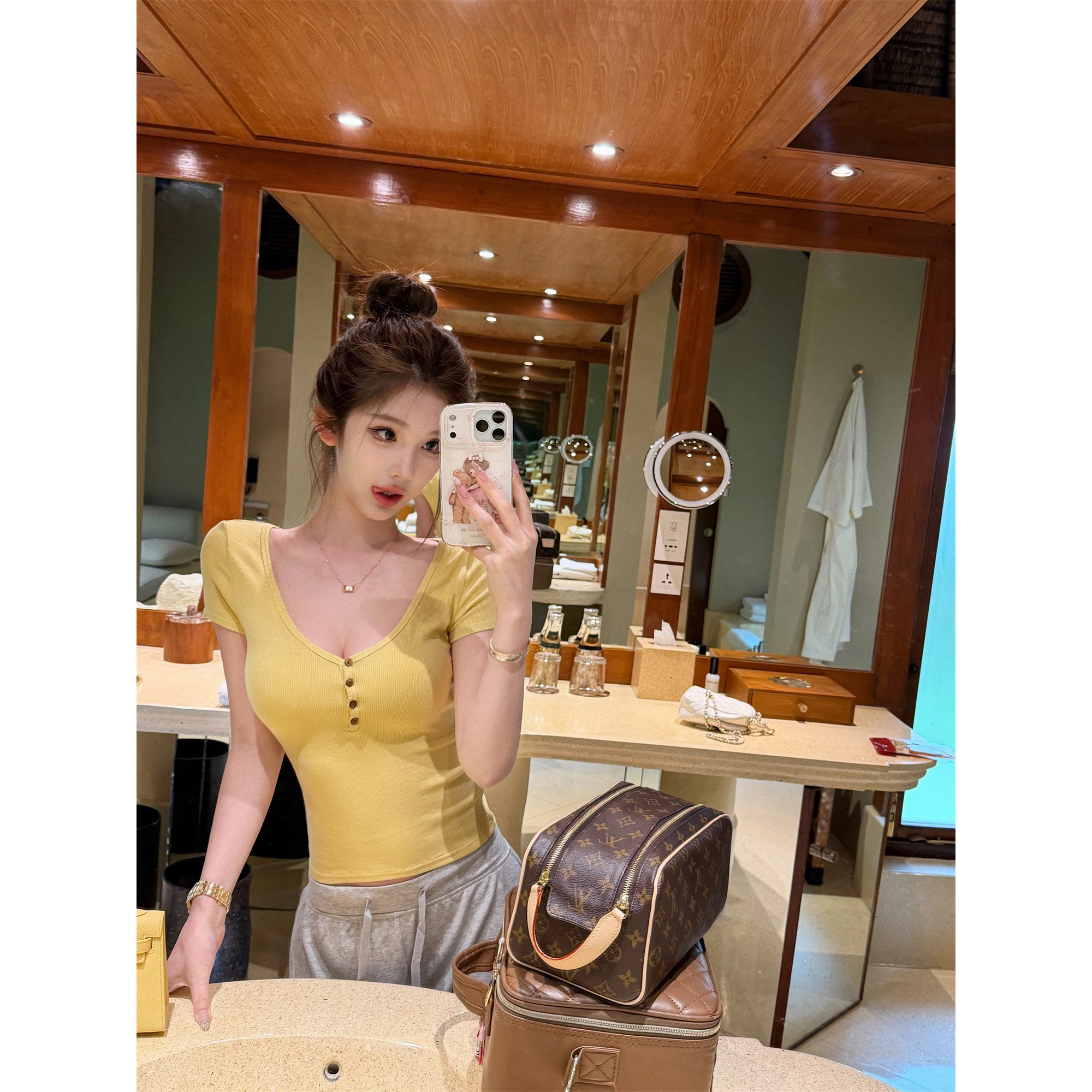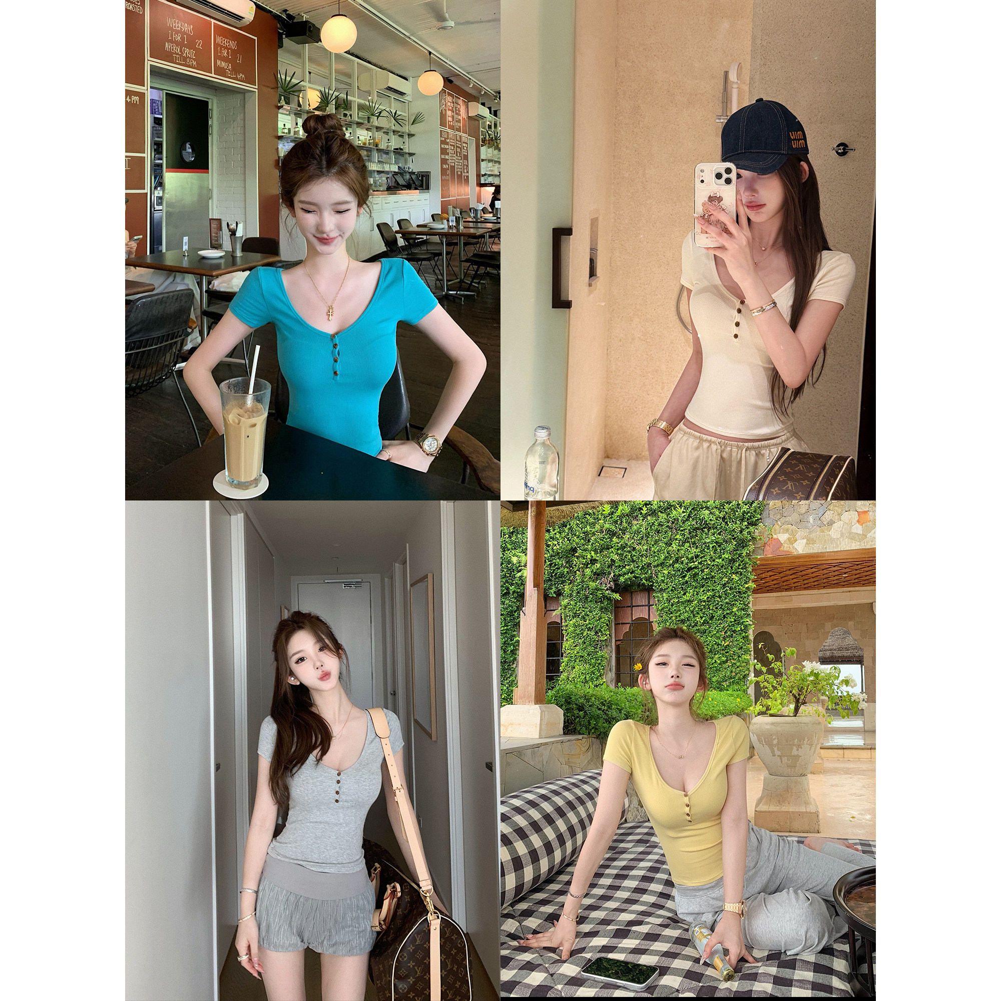 BY18161# 长期主义弹力坑条针织T恤女夏季修身显瘦V领短袖体恤上衣 服裝批發女裝批發服飾貨源