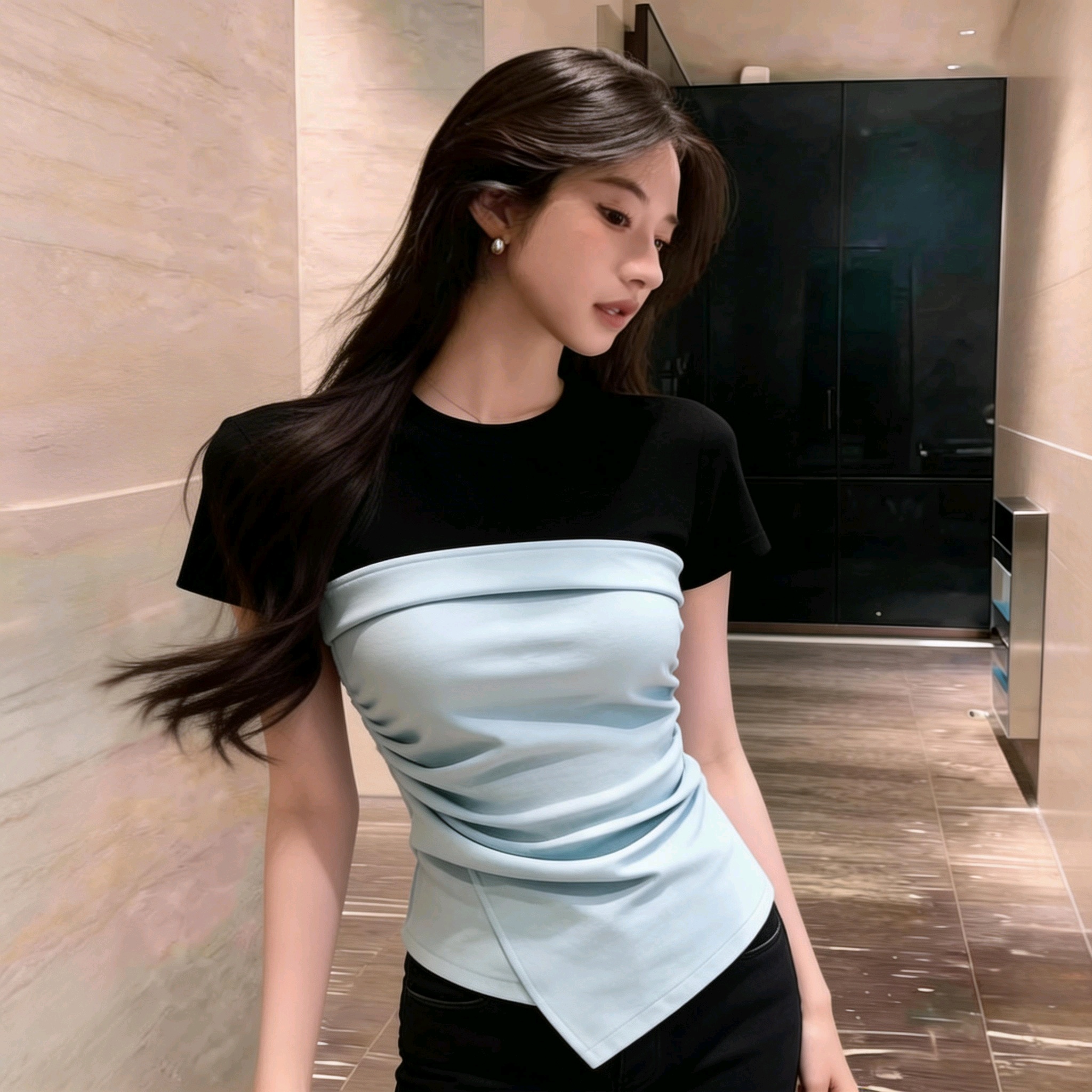 BY18164# 设计感假两件撞色拼接短袖T恤夏季新款修身显瘦法式小资上衣 服裝批發女裝批發服飾貨源