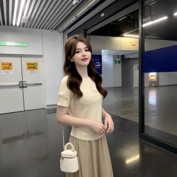 BY18166# 夏季新款轻奢风立体花朵黄色短袖上衣女宽松设计感百搭高级 服裝批發女裝批發服飾貨源