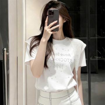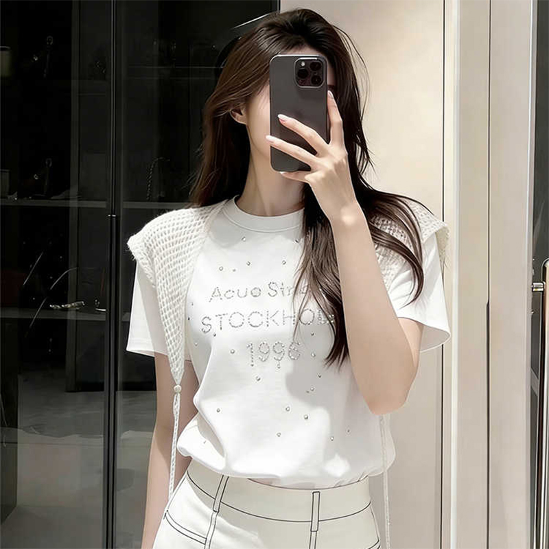 BY18168# 白色重工字母烫钻T恤女时尚夏季新款小众不撞款宽松百搭圆领上衣 服裝批發女裝批發服飾貨源
