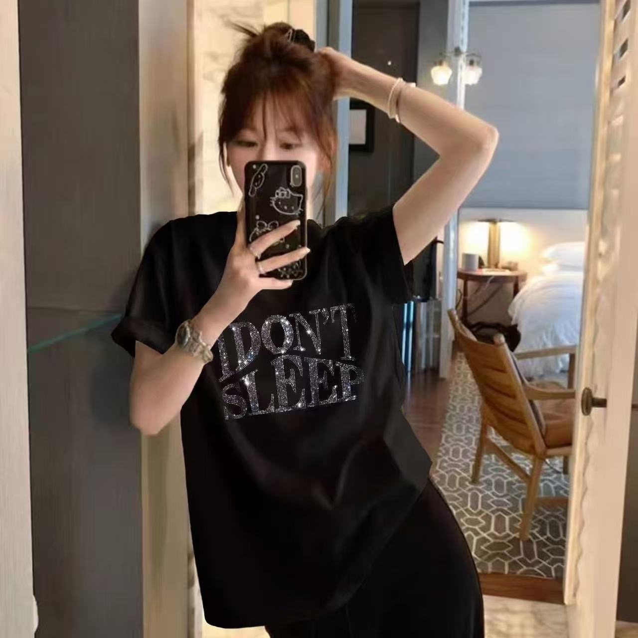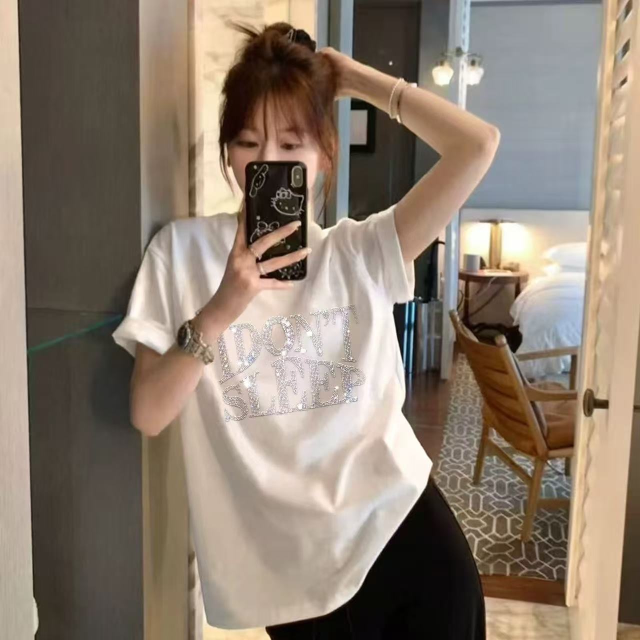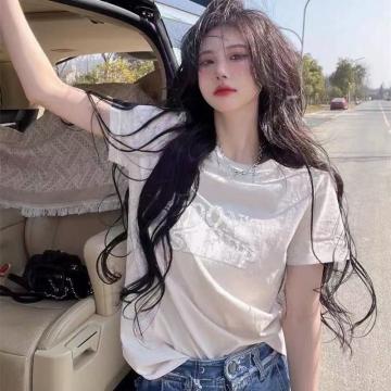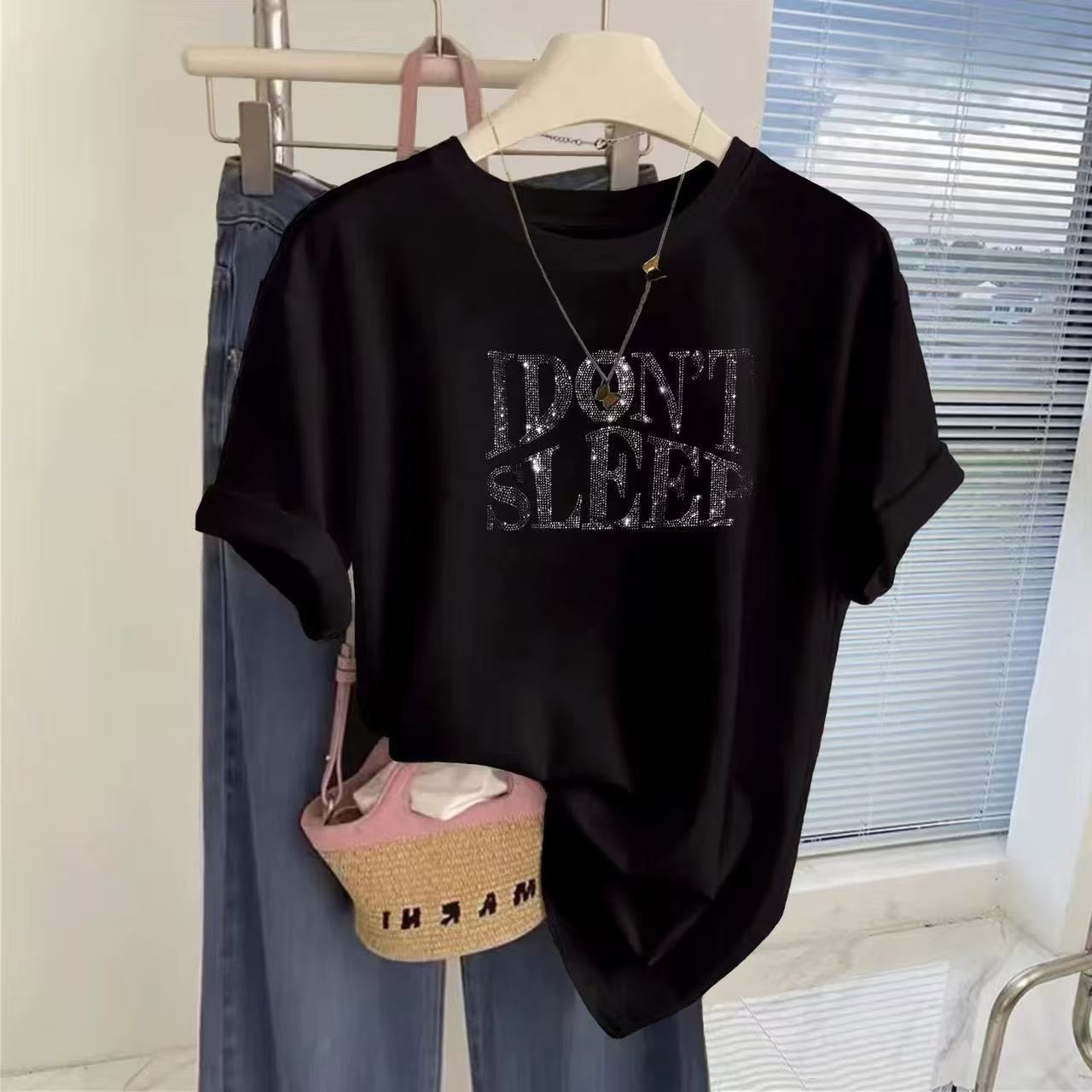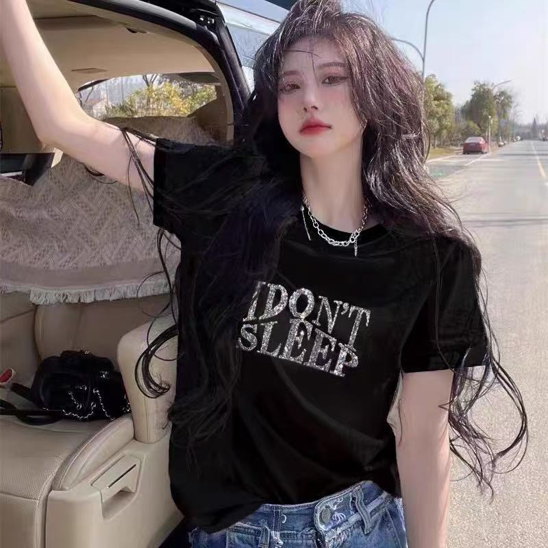 BY18185# 设计感小众字母烫钻春秋新款纯棉短袖白色oversize潮牌短袖t恤女 服裝批發女裝批發服飾貨源