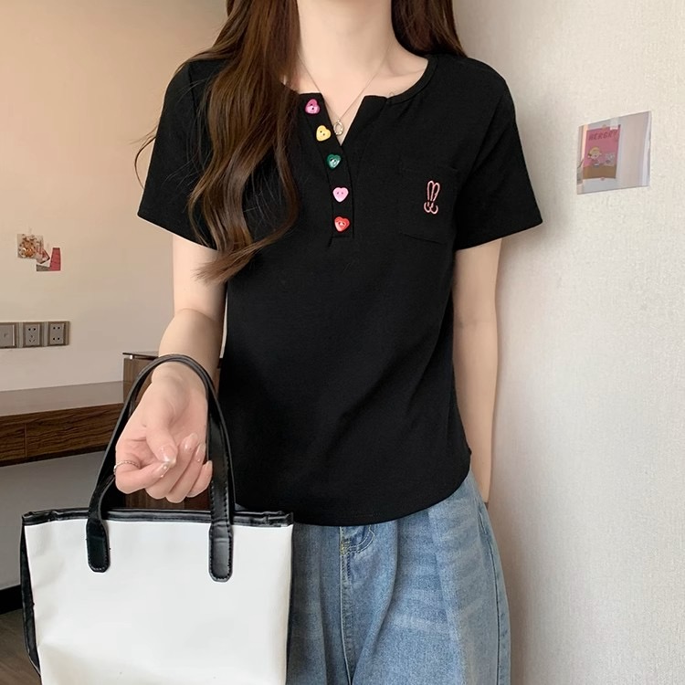 BY18265# 夏季新款韩版宽松显瘦胖mm弧形下摆纽扣短袖t恤女 服裝批發女裝批發服飾貨源