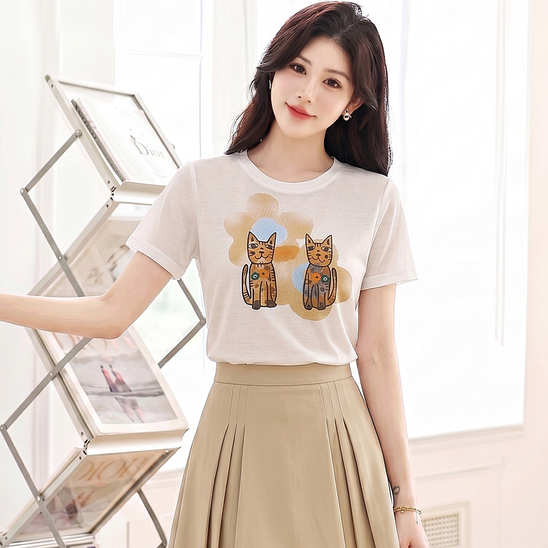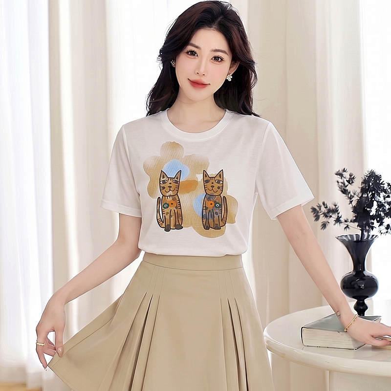 BY18648# 莱赛尔凉感防晒圆领T恤女夏季新款韩版卡通猫咪休闲印花上衣 服裝批發女裝批發服飾貨源