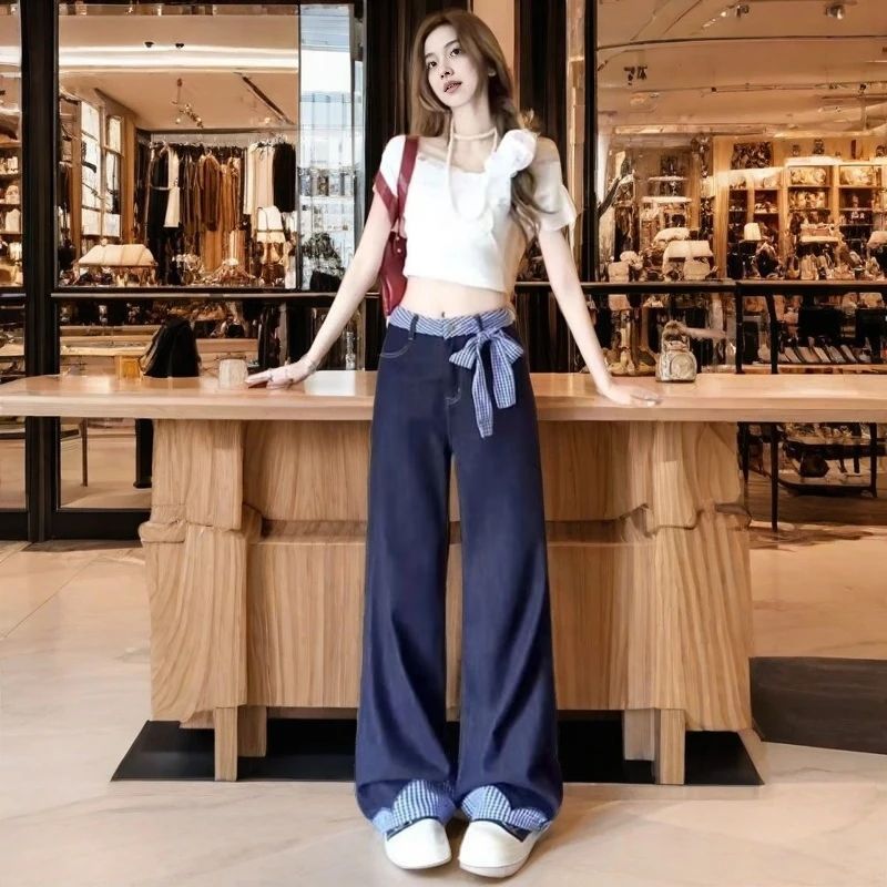 BY18866# 韩系蝴蝶结绑带阔腿牛仔裤女夏高腰宽松格子拼接直筒拖地裤子 服裝批發女裝批發服飾貨源
