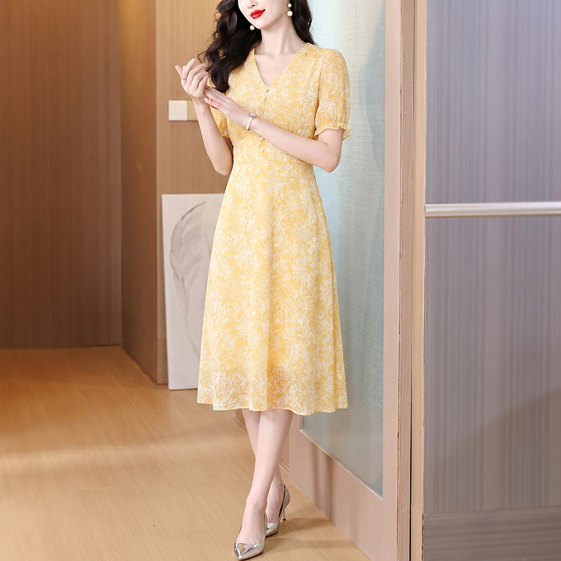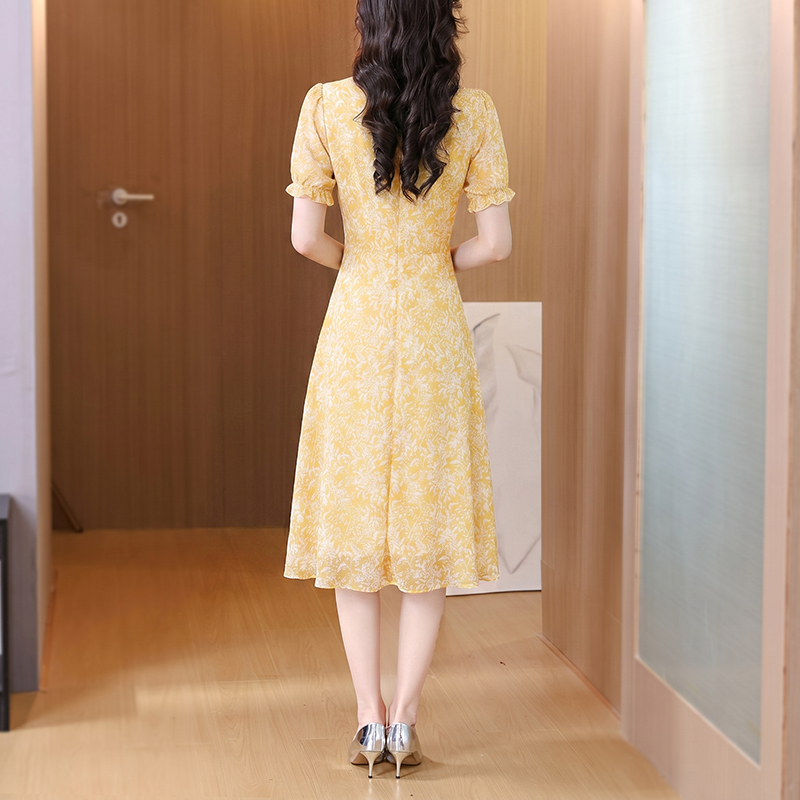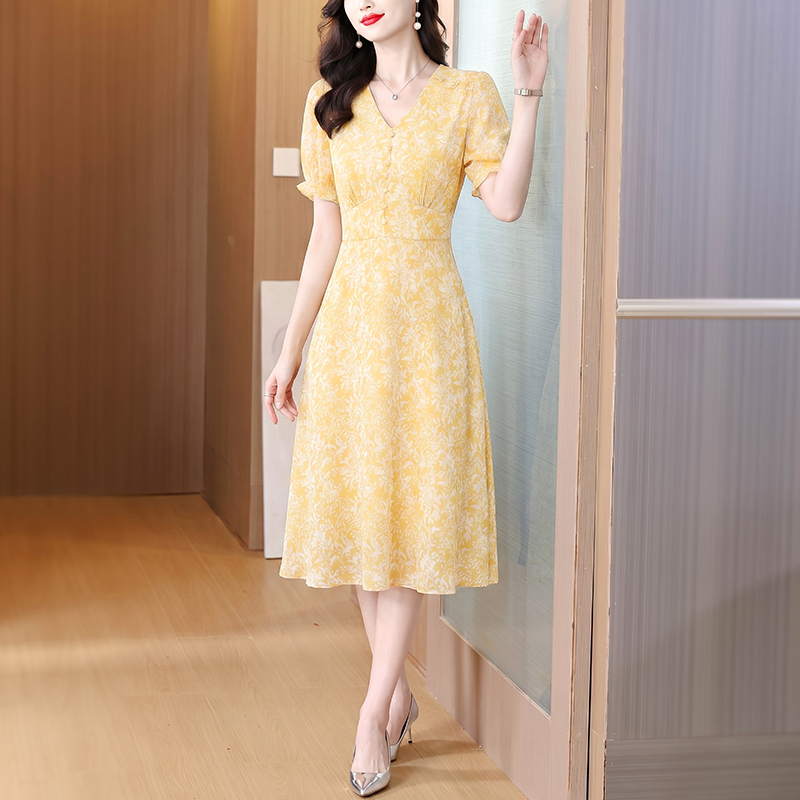 BY18888# 海边度假气质显瘦短袖V领黄色碎花连衣裙新款夏季茶歇裙 服裝批發女裝批發服飾貨源