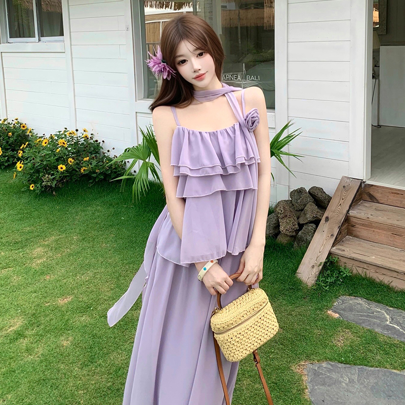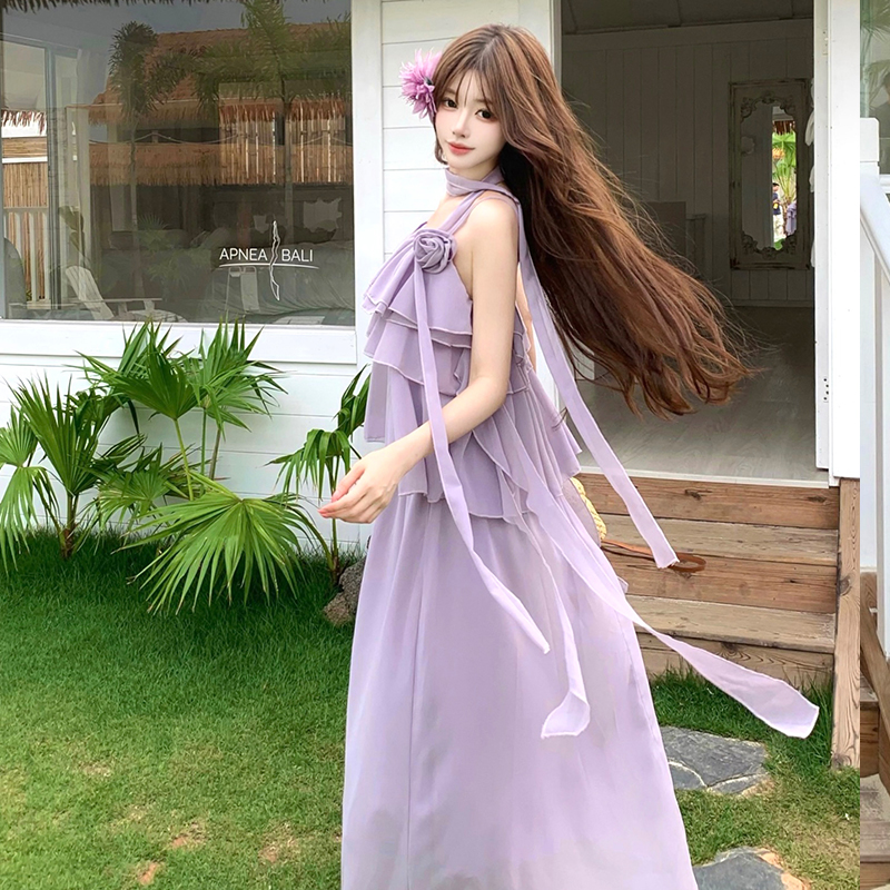 BY18912# 法式紫色吊带长裙女夏宽松显瘦慵懒风大裙摆飘逸连衣裙过膝仙女裙 服裝批發女裝批發服飾貨源