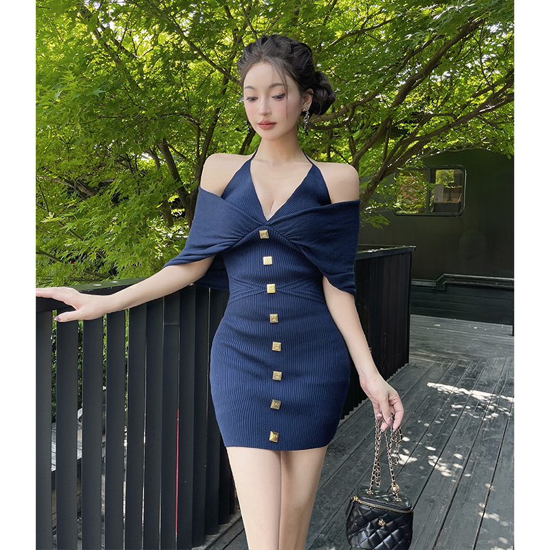 BY18932# 欧美风辣妹一字肩挂脖连衣裙V领针织修身性感包臀短裙夏 服裝批發女裝批發服飾貨源