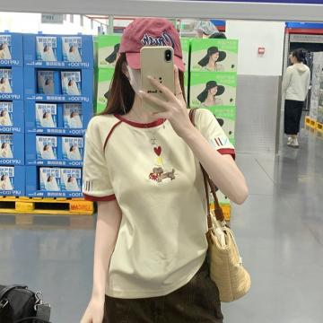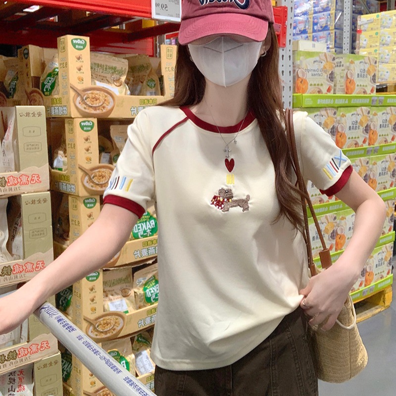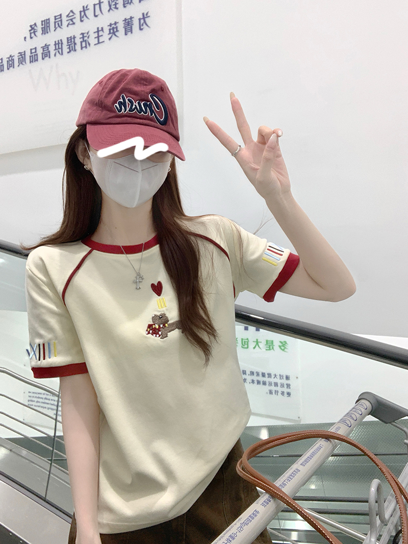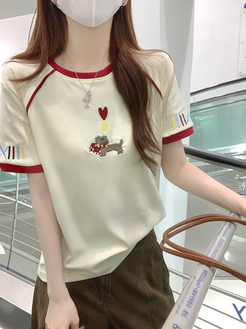 BY18971# 水柔棉双面短袖t恤夏韩系新款撞色刺绣圆领上衣女装 服裝批發女裝批發服飾貨源