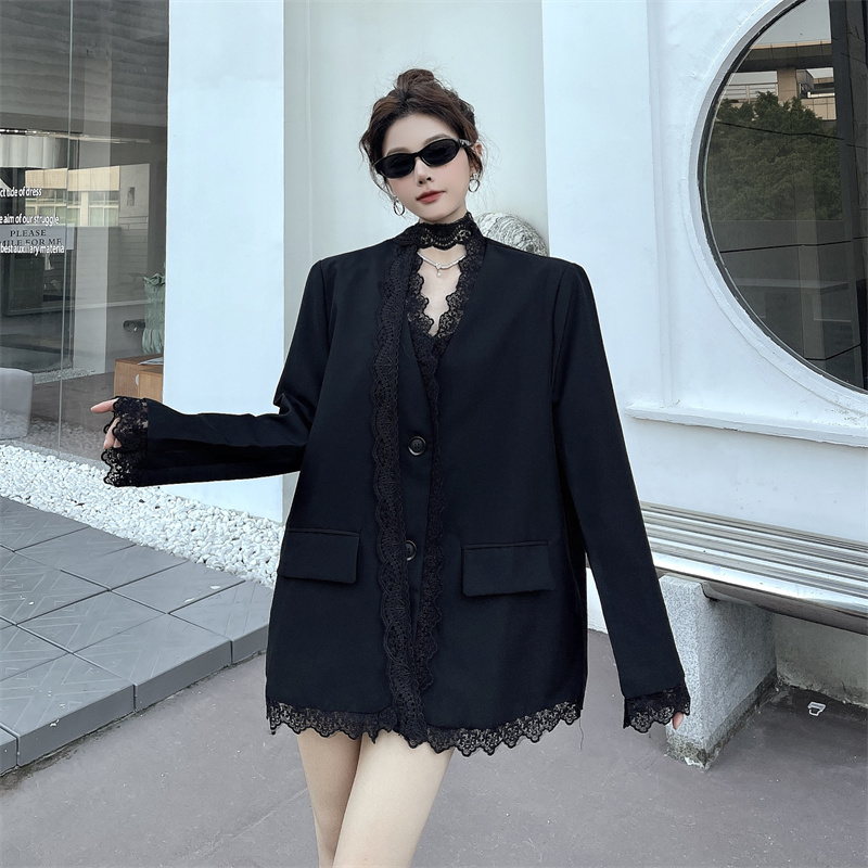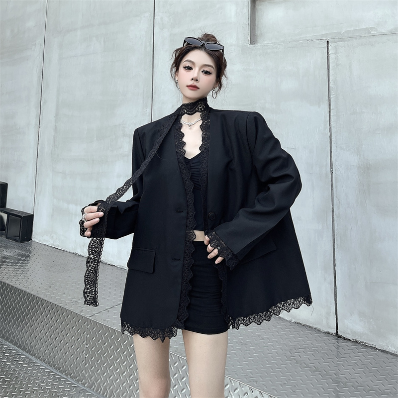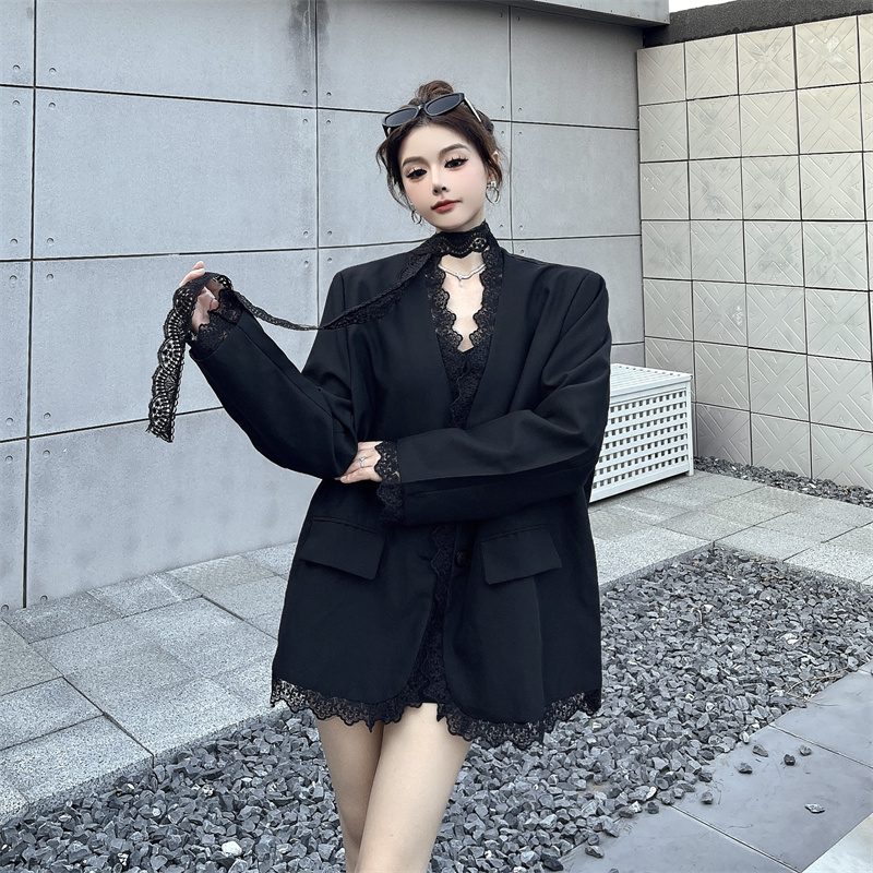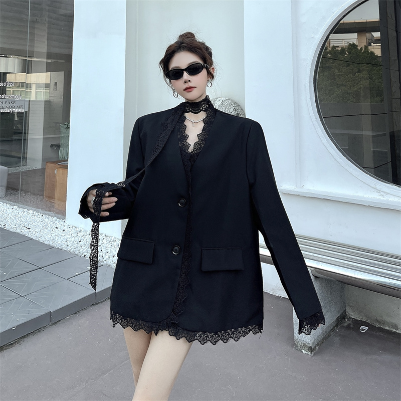 BY11432# 黑色蕾丝拼接西装外套女春秋新款气质垫肩西服上衣配飘带 服裝批發女裝批發服飾貨源