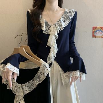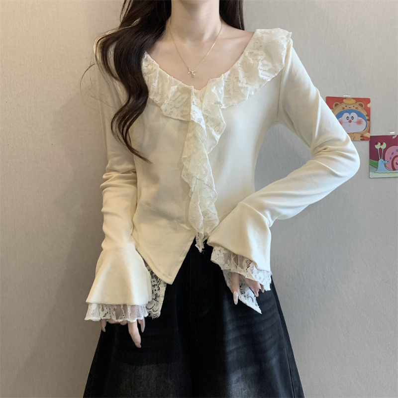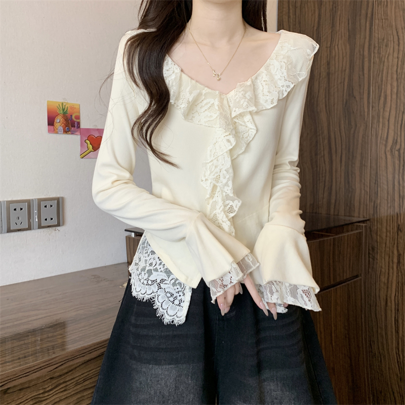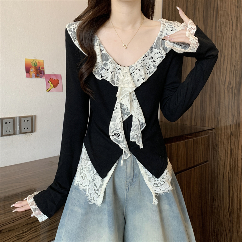 BY11443# 春季新款韩系纯欲风蕾丝拼接v领长袖T恤女设计感别致上衣 服裝批發女裝批發服飾貨源