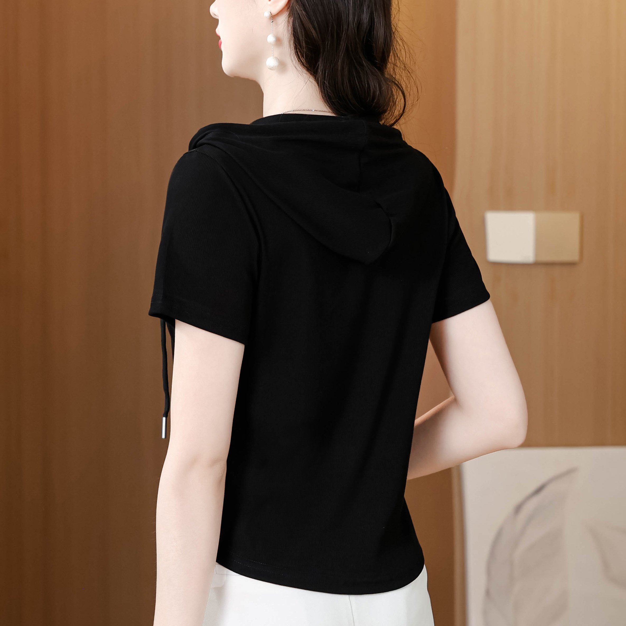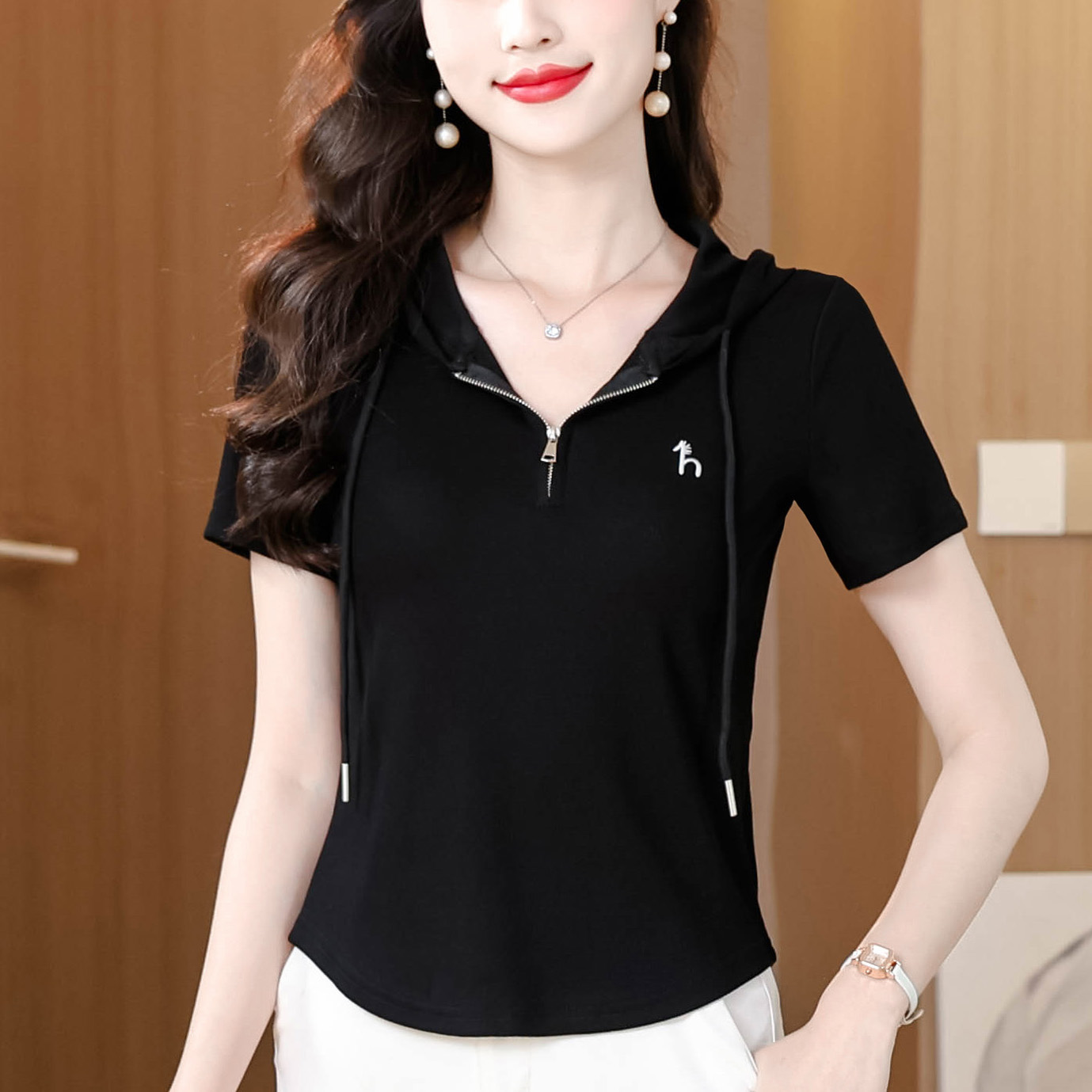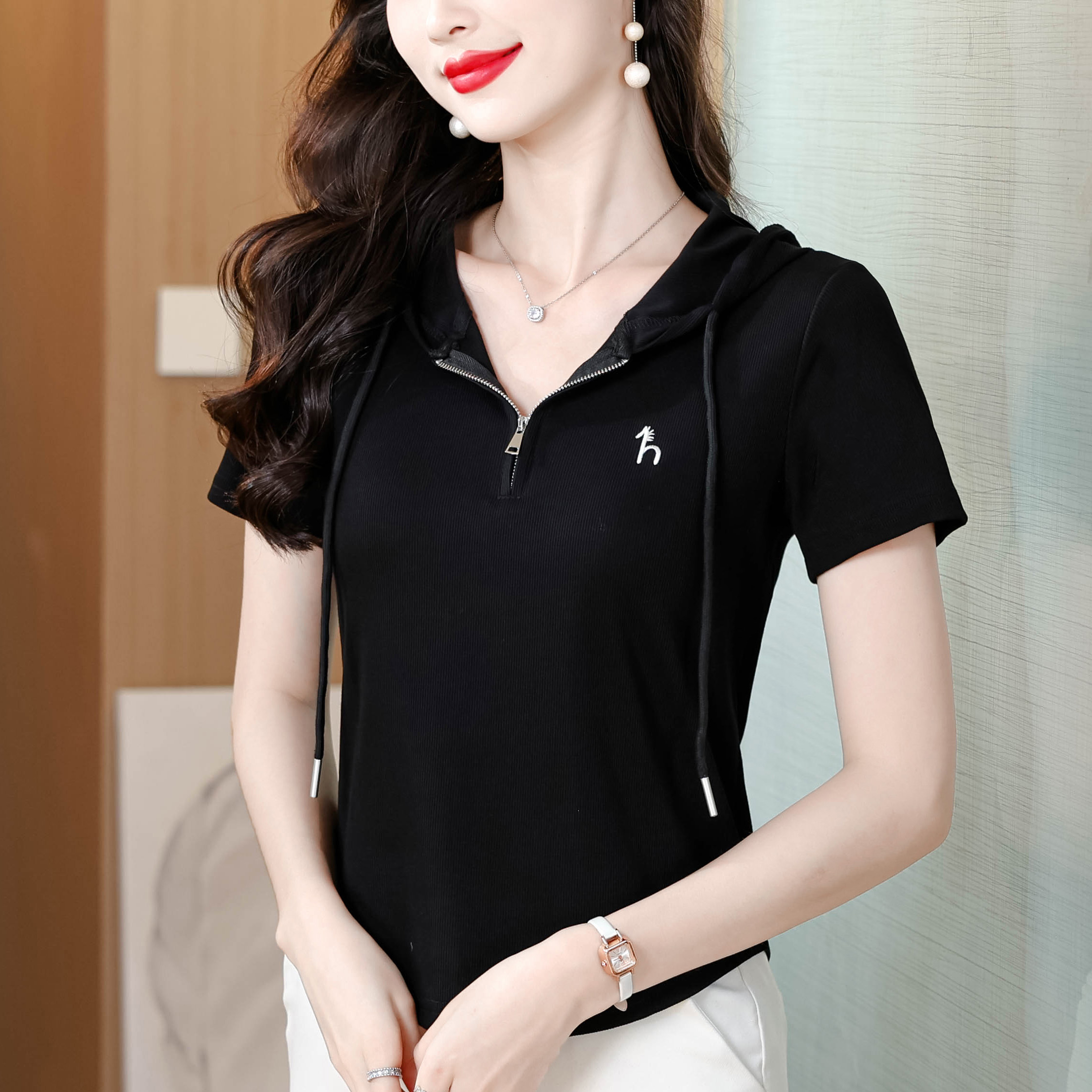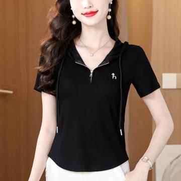 BY11671# 夏季新款连帽拉链短袖T恤女修身显瘦刺绣上衣百搭休闲小衫 服裝批發女裝批發服飾貨源