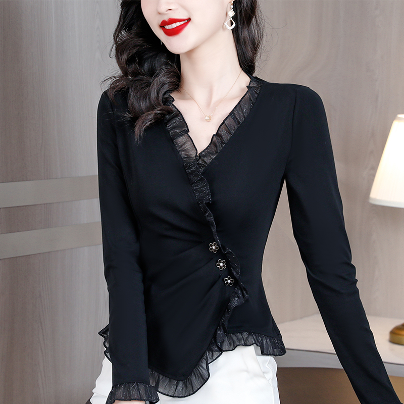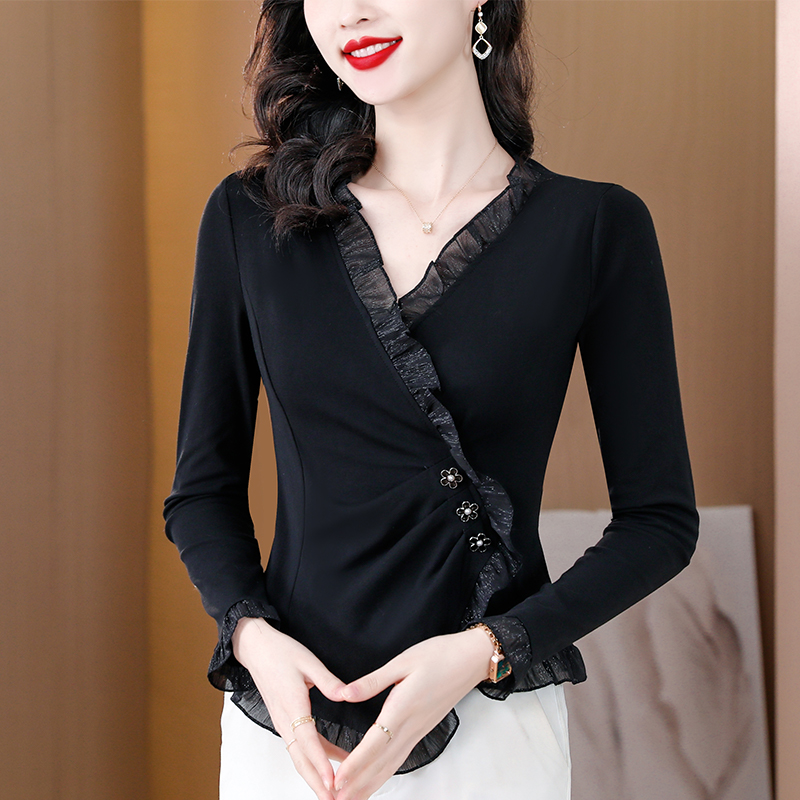 BY11684# 春新款黑色长袖打底衫女士时尚洋气T恤修身春秋显瘦荷叶边上衣 服裝批發女裝批發服飾貨源