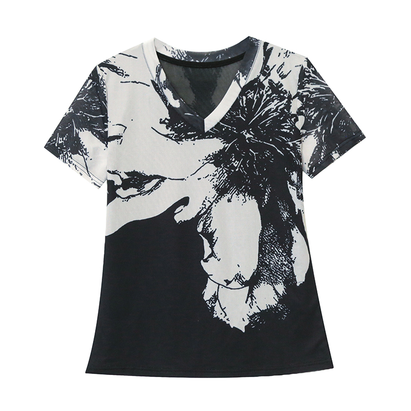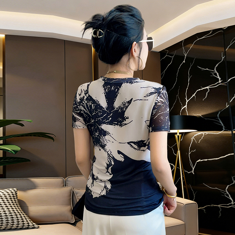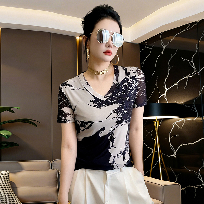BY11735# 夏新款短袖定位印花V领网纱t恤女时尚修身显瘦打底衫潮 服裝批發女裝批發服飾貨源