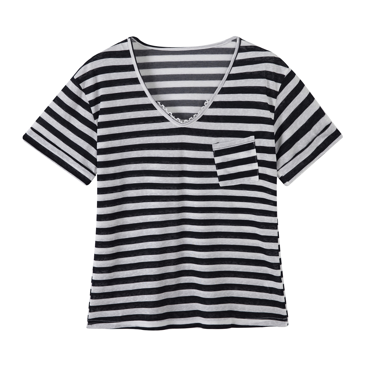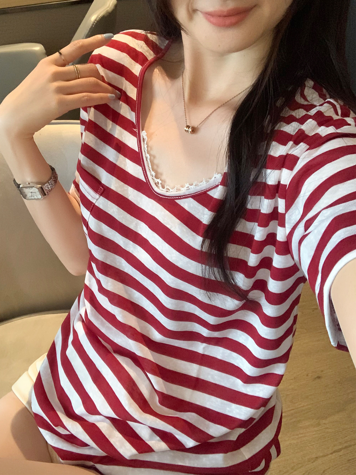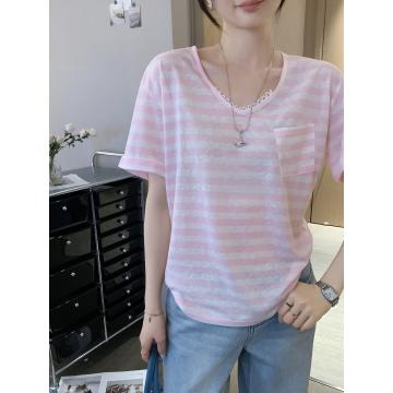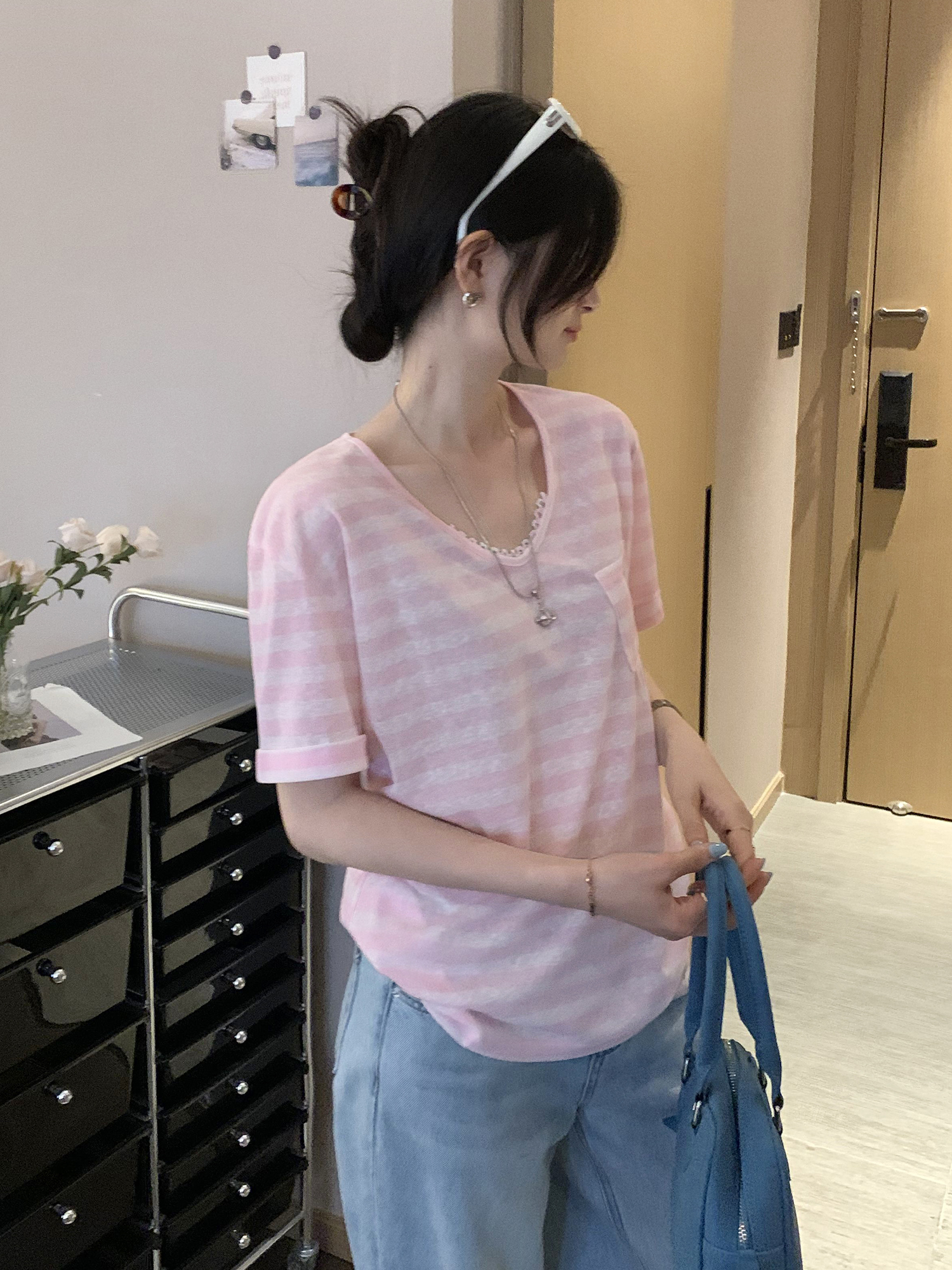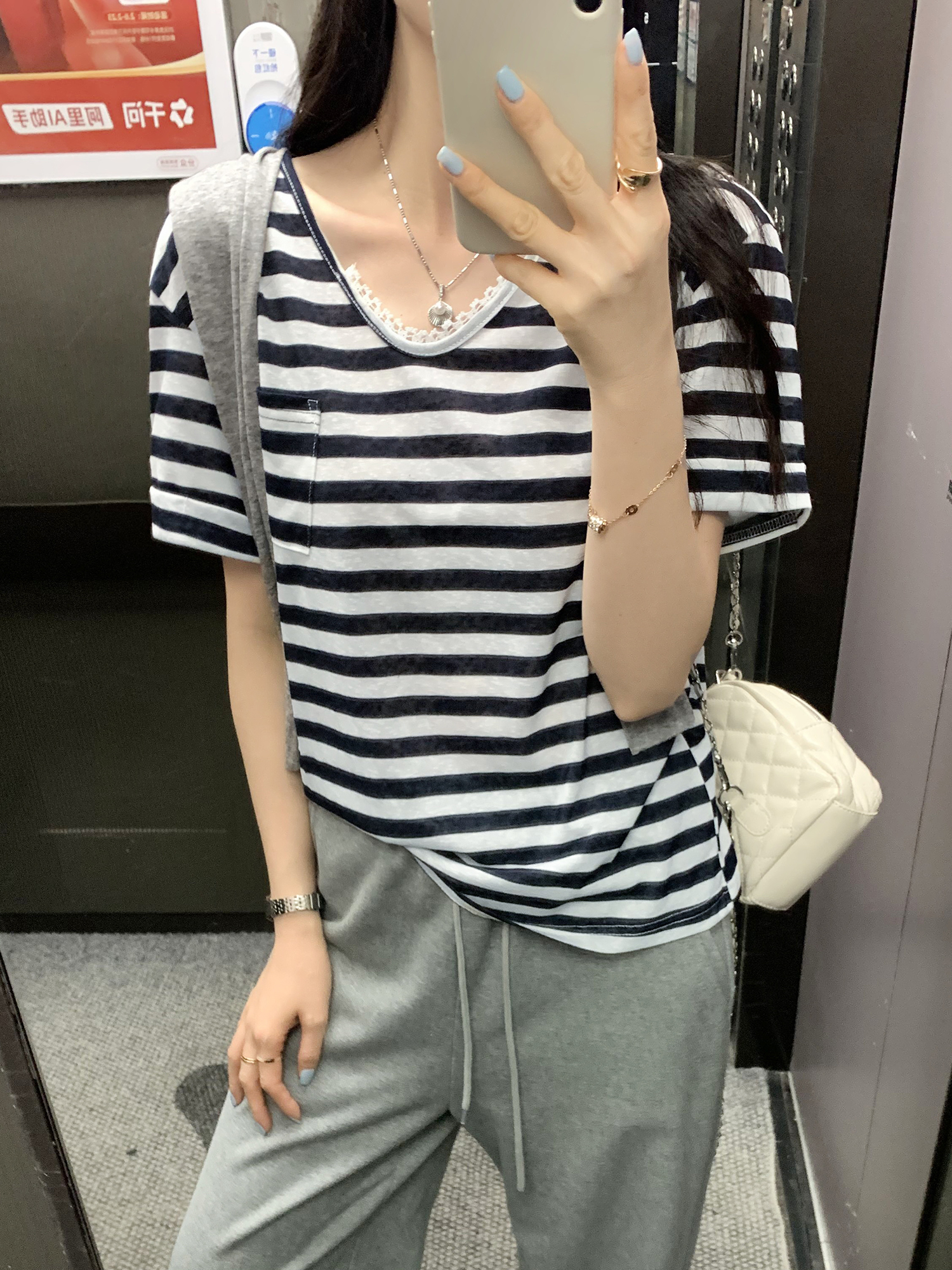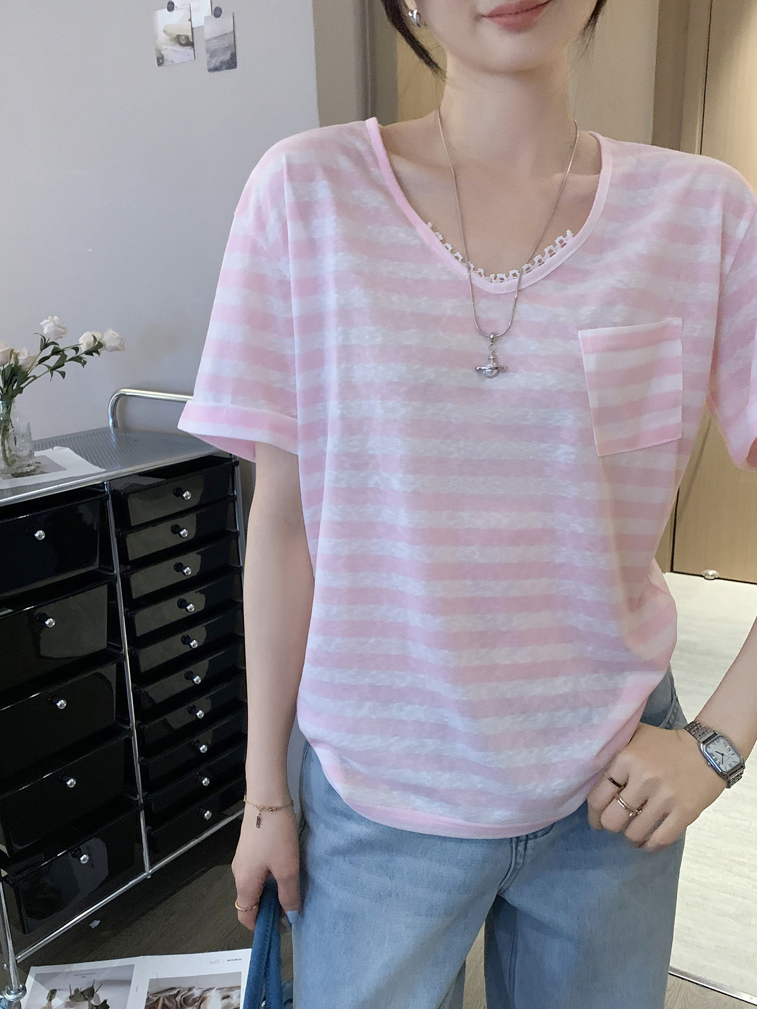 BY11766# 图多巴胺穿搭黄色条纹V领宽松短袖T恤女夏新款设计感上衣 服裝批發女裝批發服飾貨源