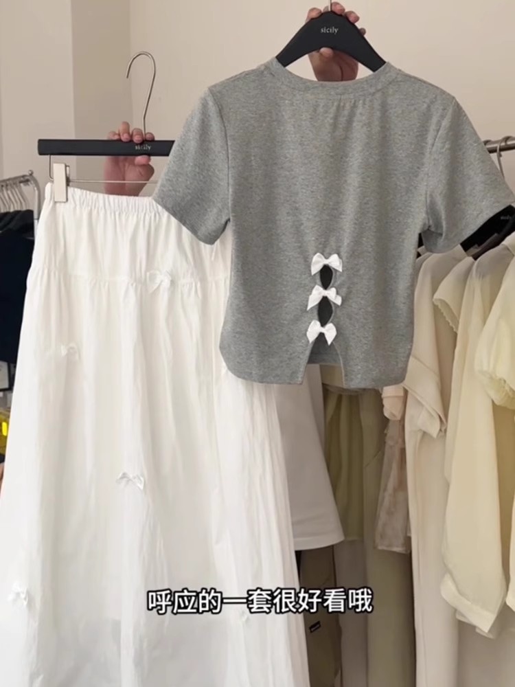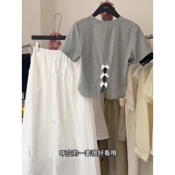 BY11777# 灰色蝴蝶结镂空短款正肩t恤女夏季后背设计感别致绝美短袖小上衣 服裝批發女裝批發服飾貨源