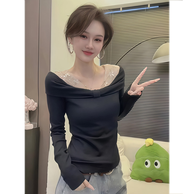 BY11807# 人棉抓毛烫钻网纱拼接长袖T恤女春蝴蝶结露肩假两件上衣 服裝批發女裝批發服飾貨源