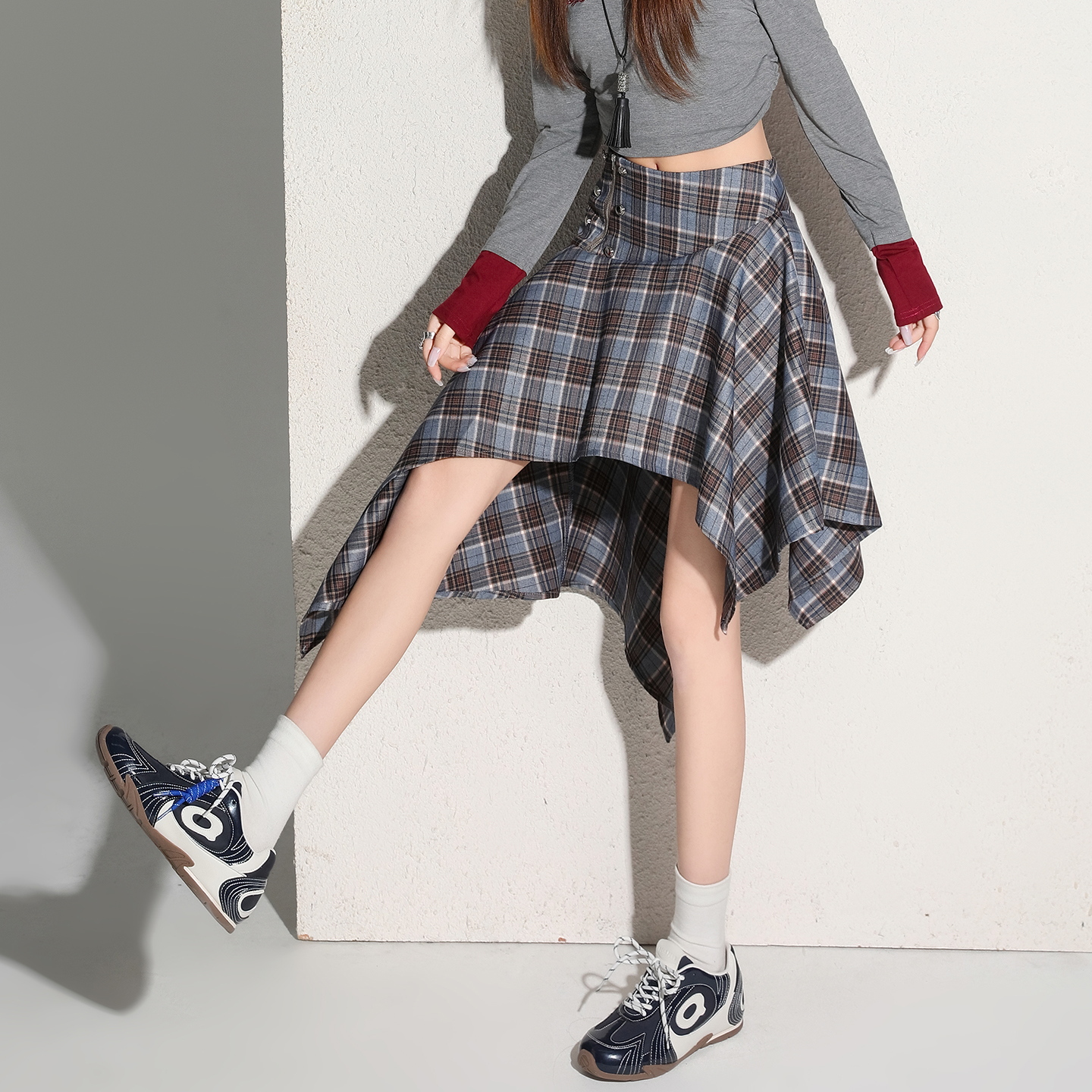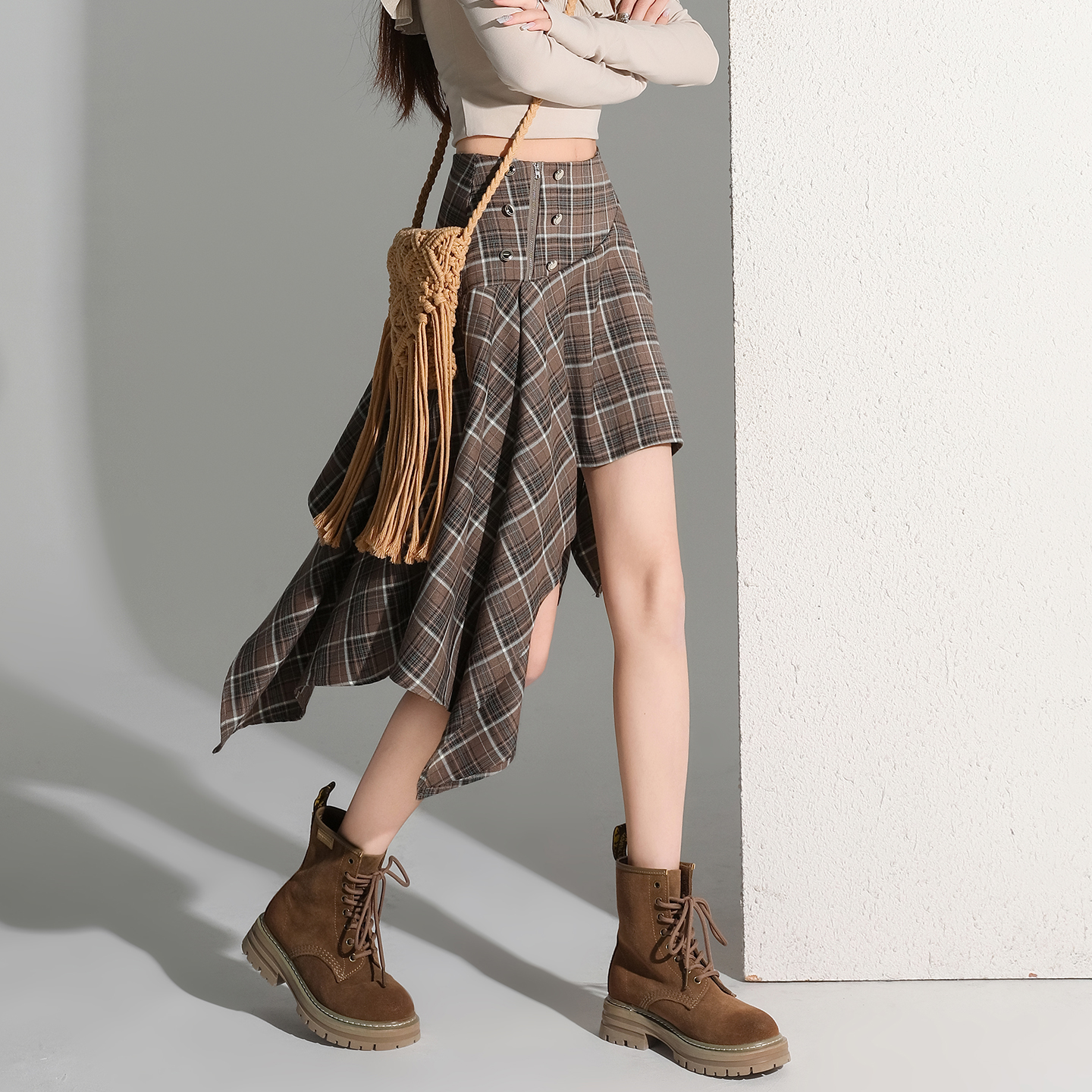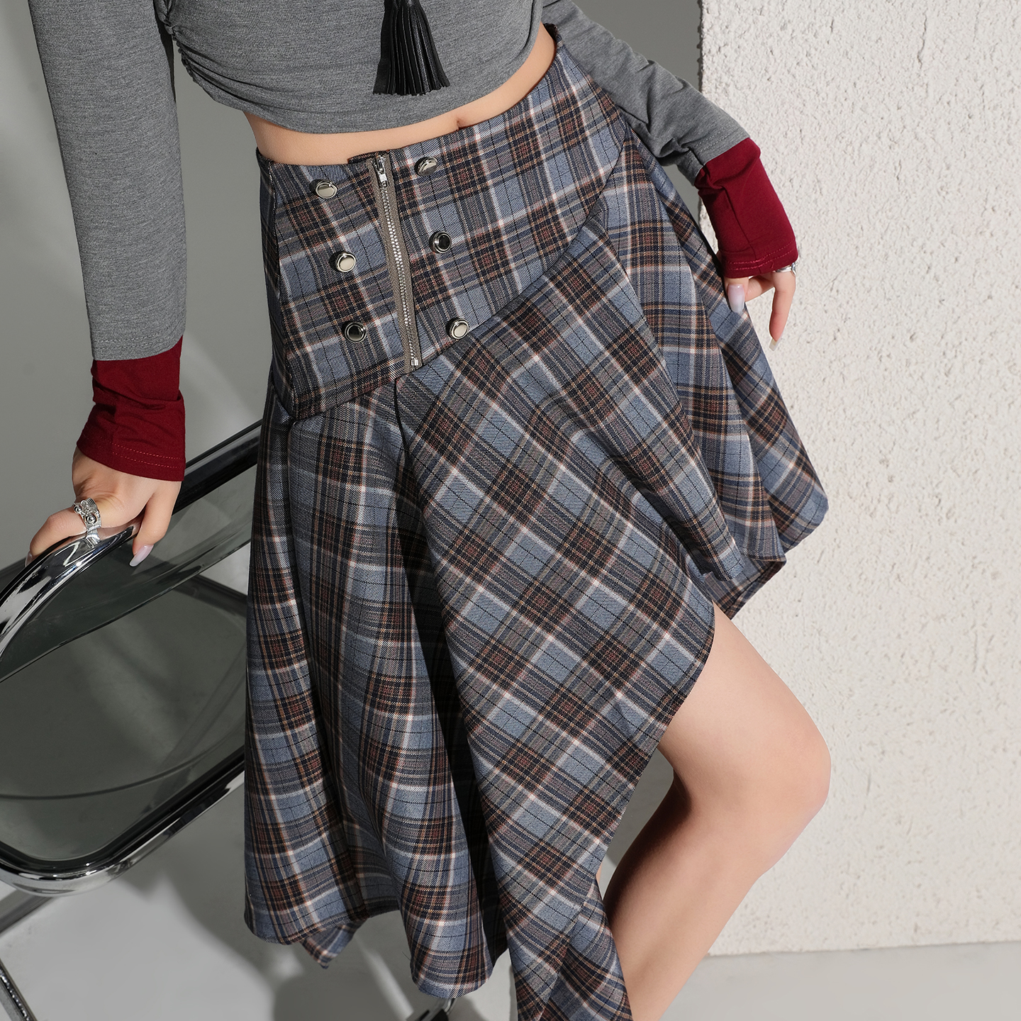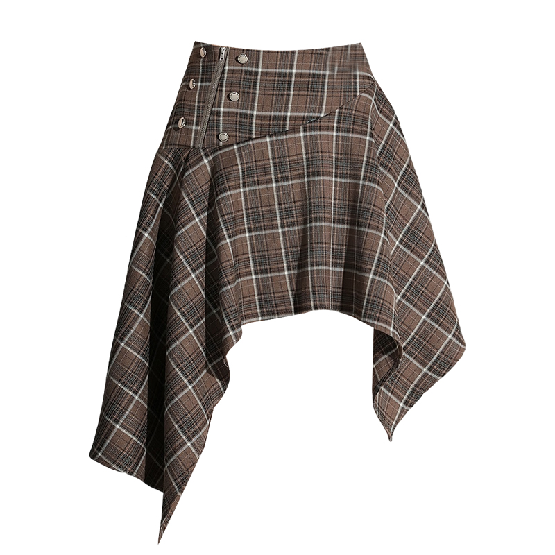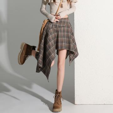 BY11986# 小个子高腰不规则格子短裙女新品通勤显瘦a字休闲半身裙 服裝批發女裝批發服飾貨源