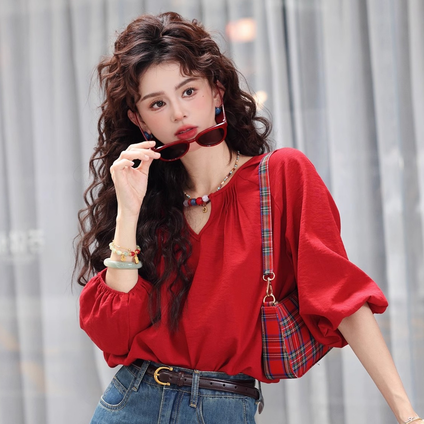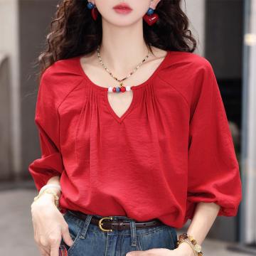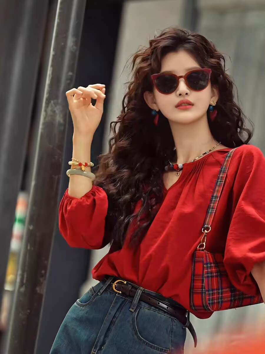 BY12004# 法式复古红色半袖衬衫女春夏新款轻奢高级感洋气独特别致上衣 服裝批發女裝批發服飾貨源