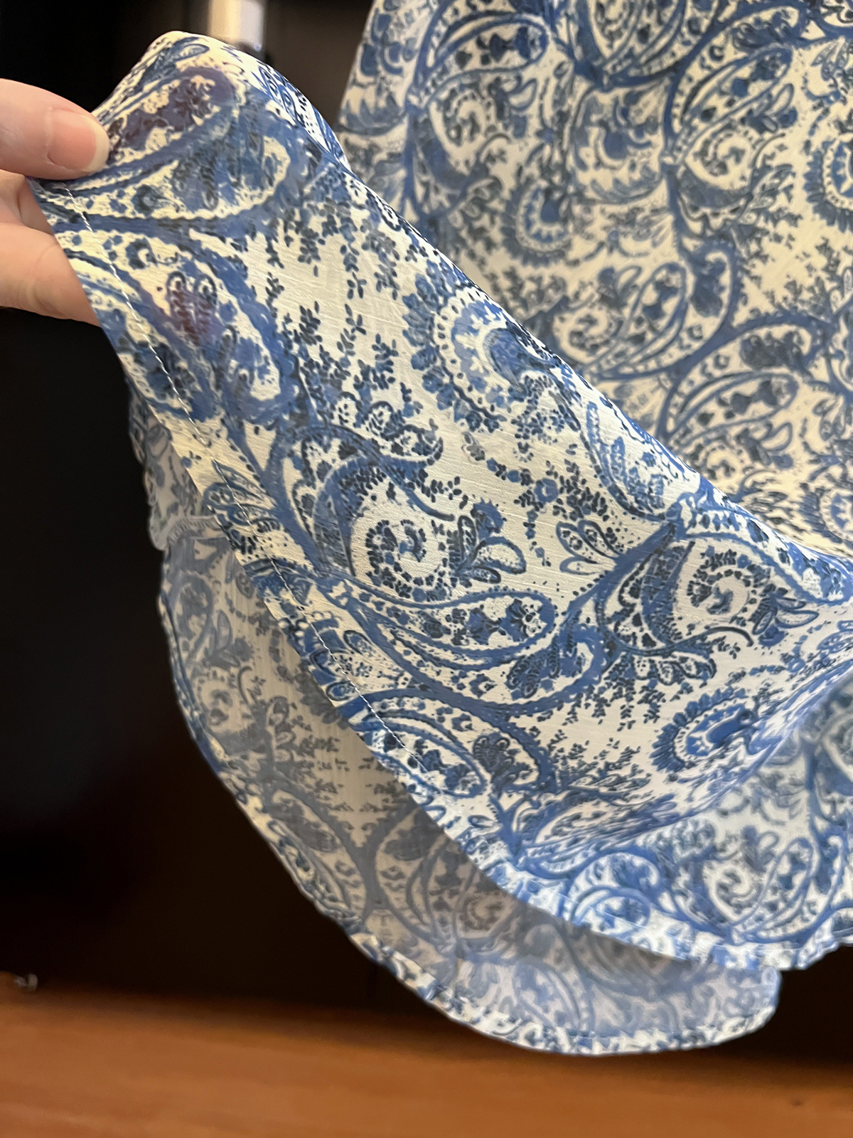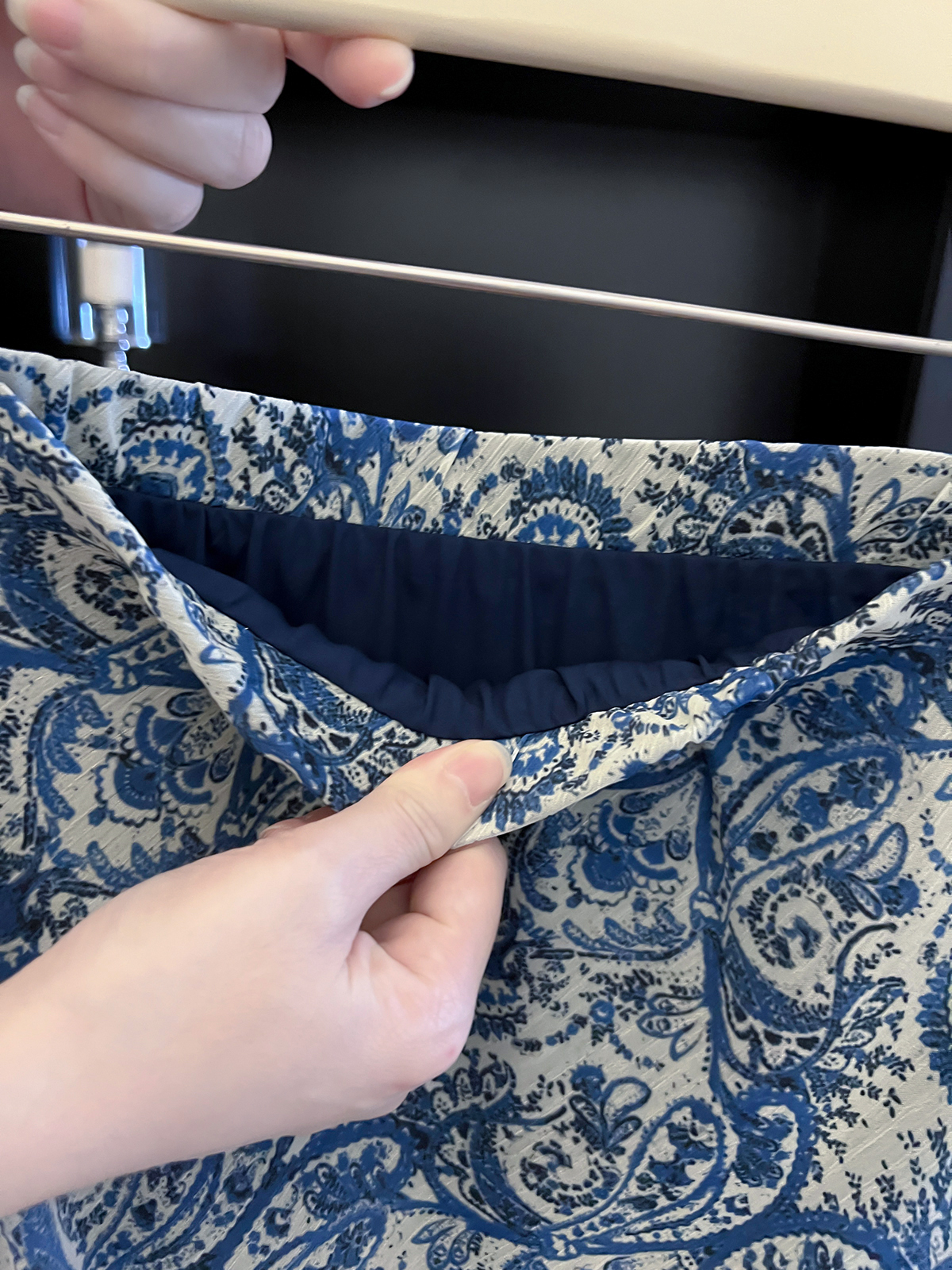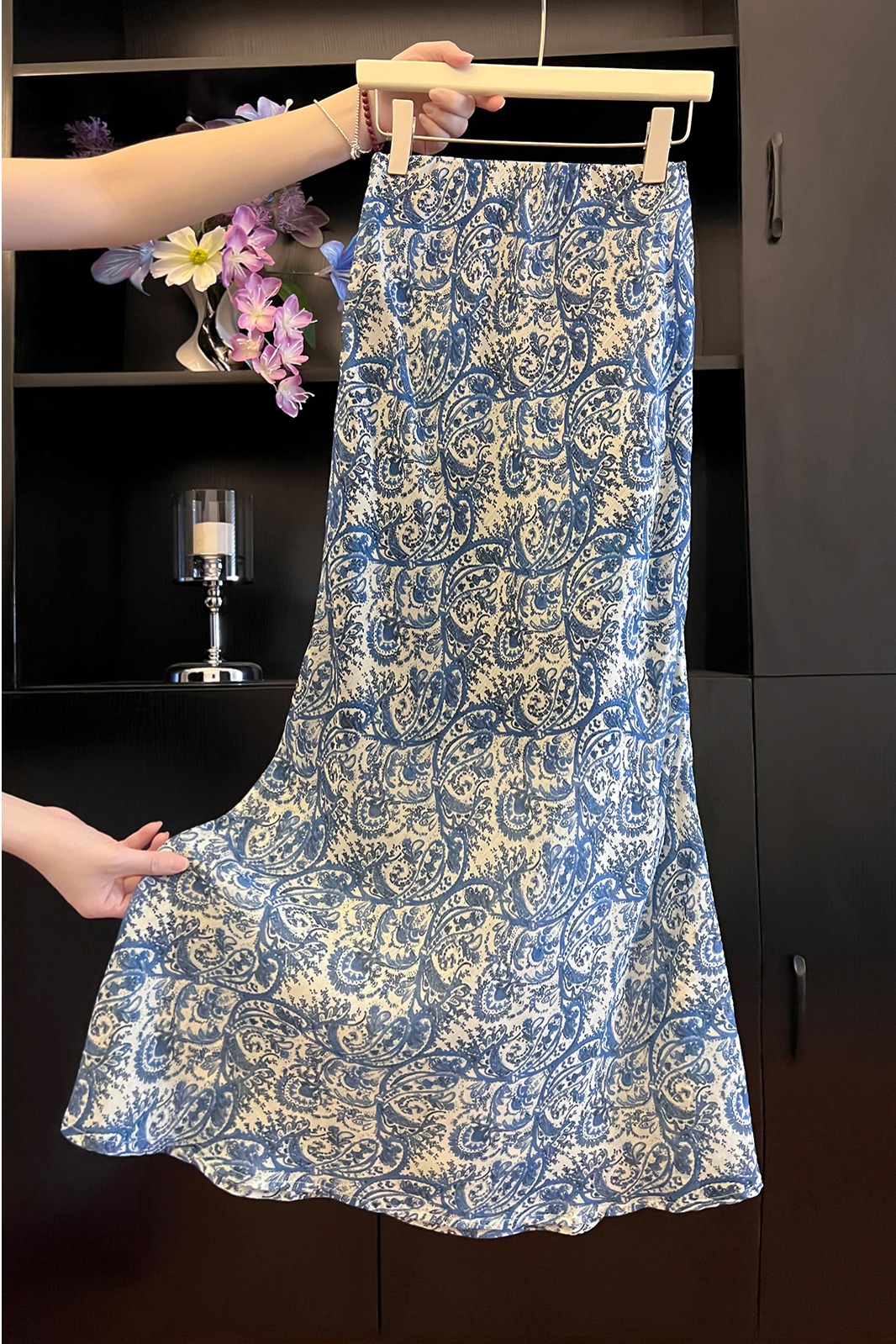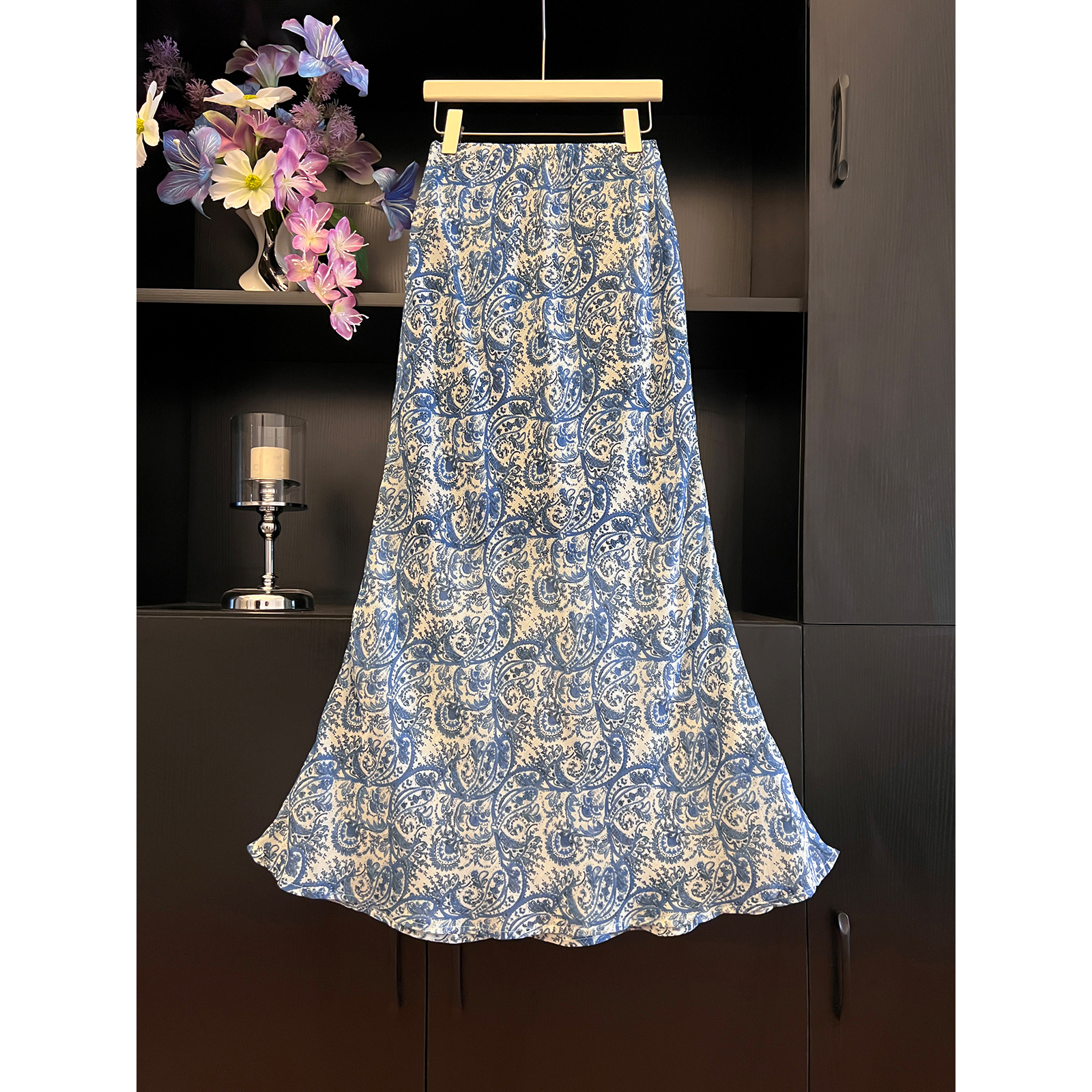 BY12132# 品质五线打边青花瓷印花透纱斜裁鱼尾半身裙 服裝批發女裝批發服飾貨源