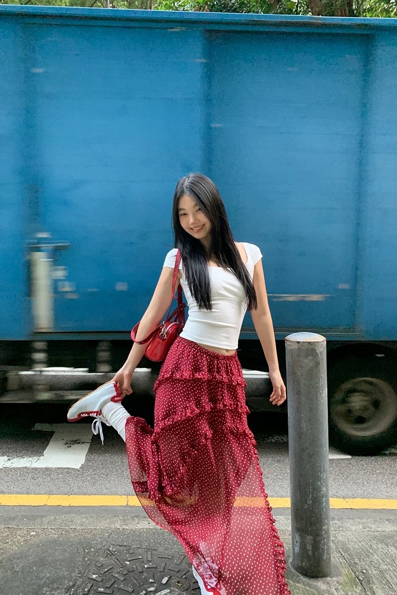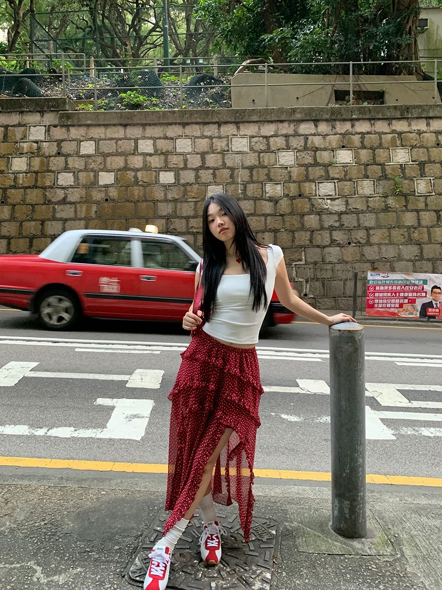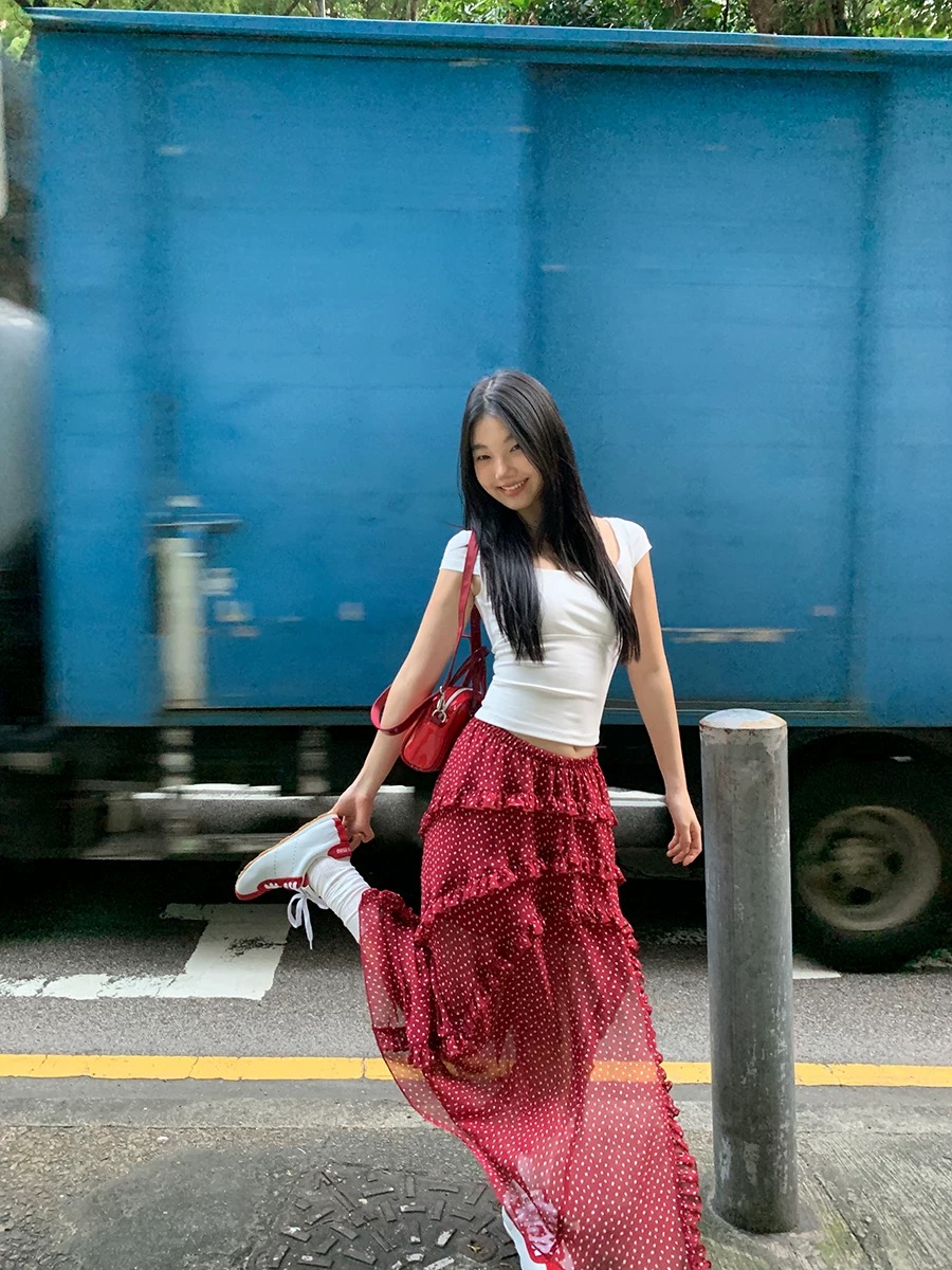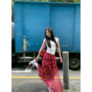 BY12137# a字半身裙女新款超火长裙不规则波点蛋糕裙红色裙子女 服裝批發女裝批發服飾貨源