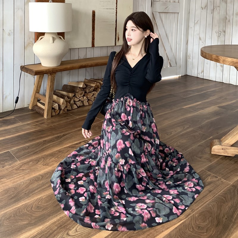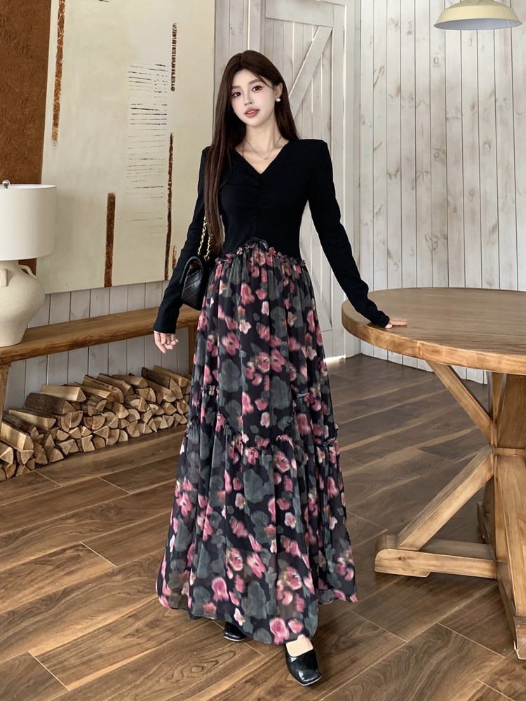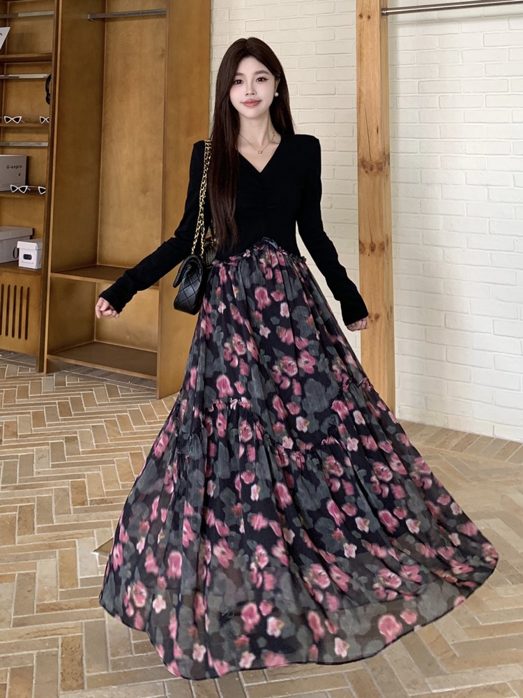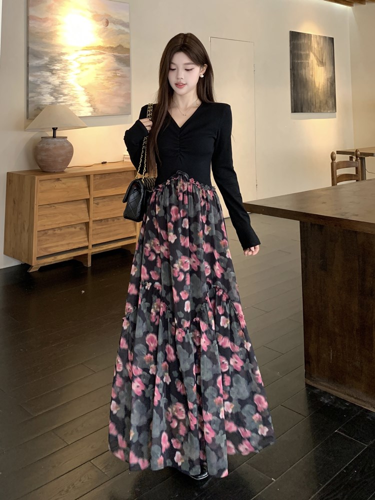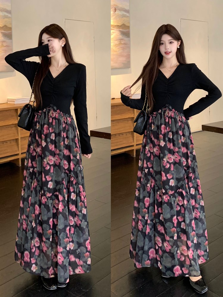 春季新款高级感假两件法式黑色碎花长袖连衣裙气质显瘦长裙子 服裝批發女裝批發服飾貨源