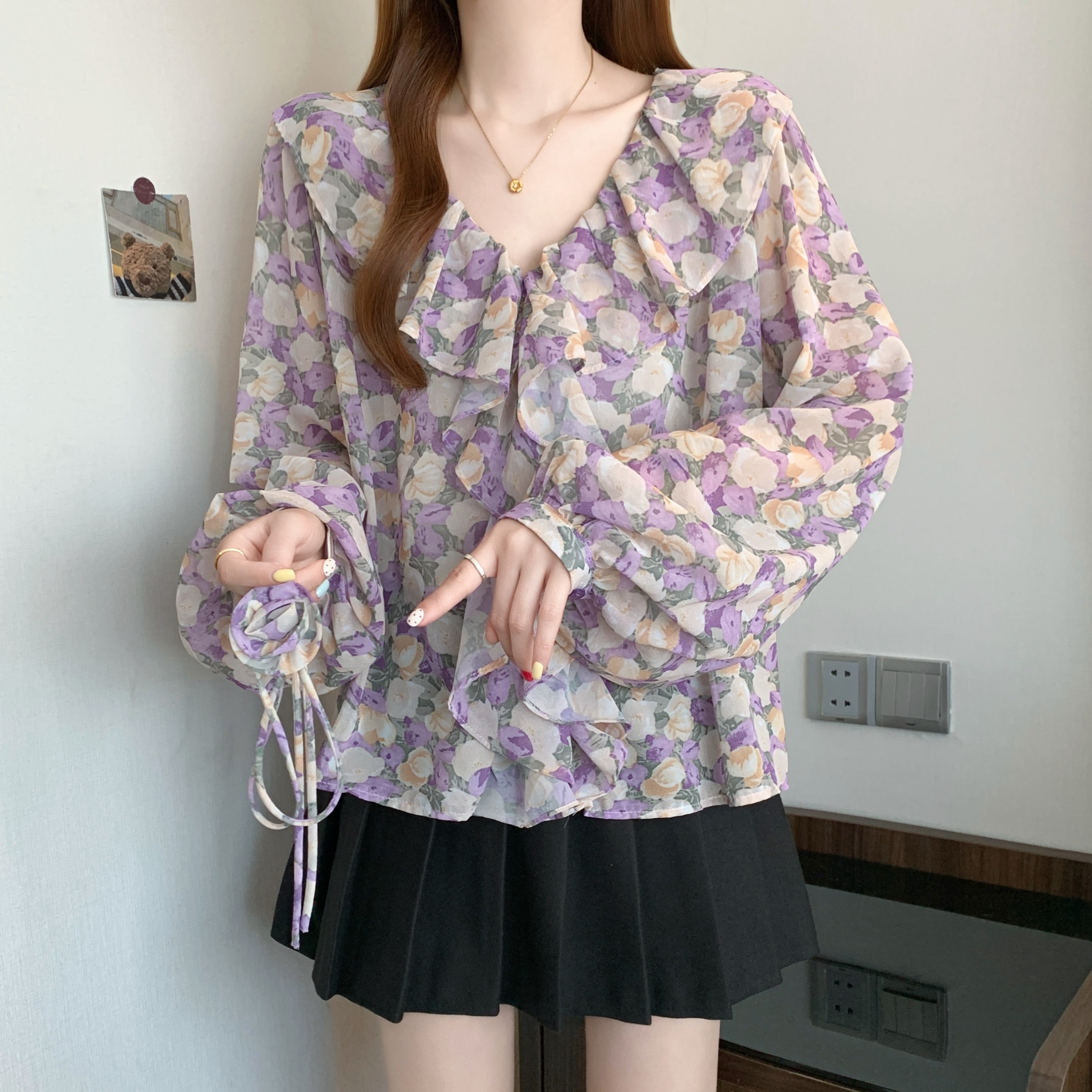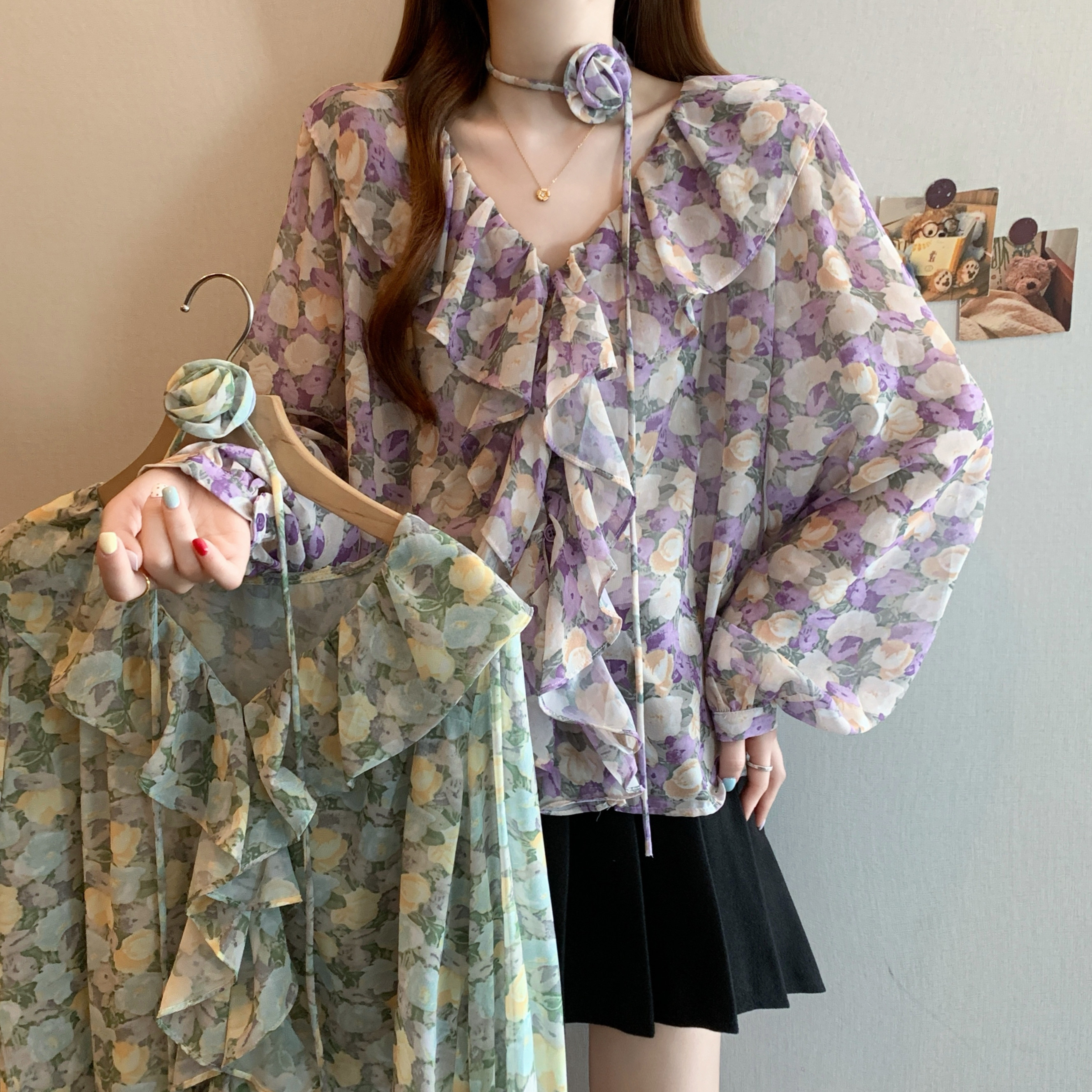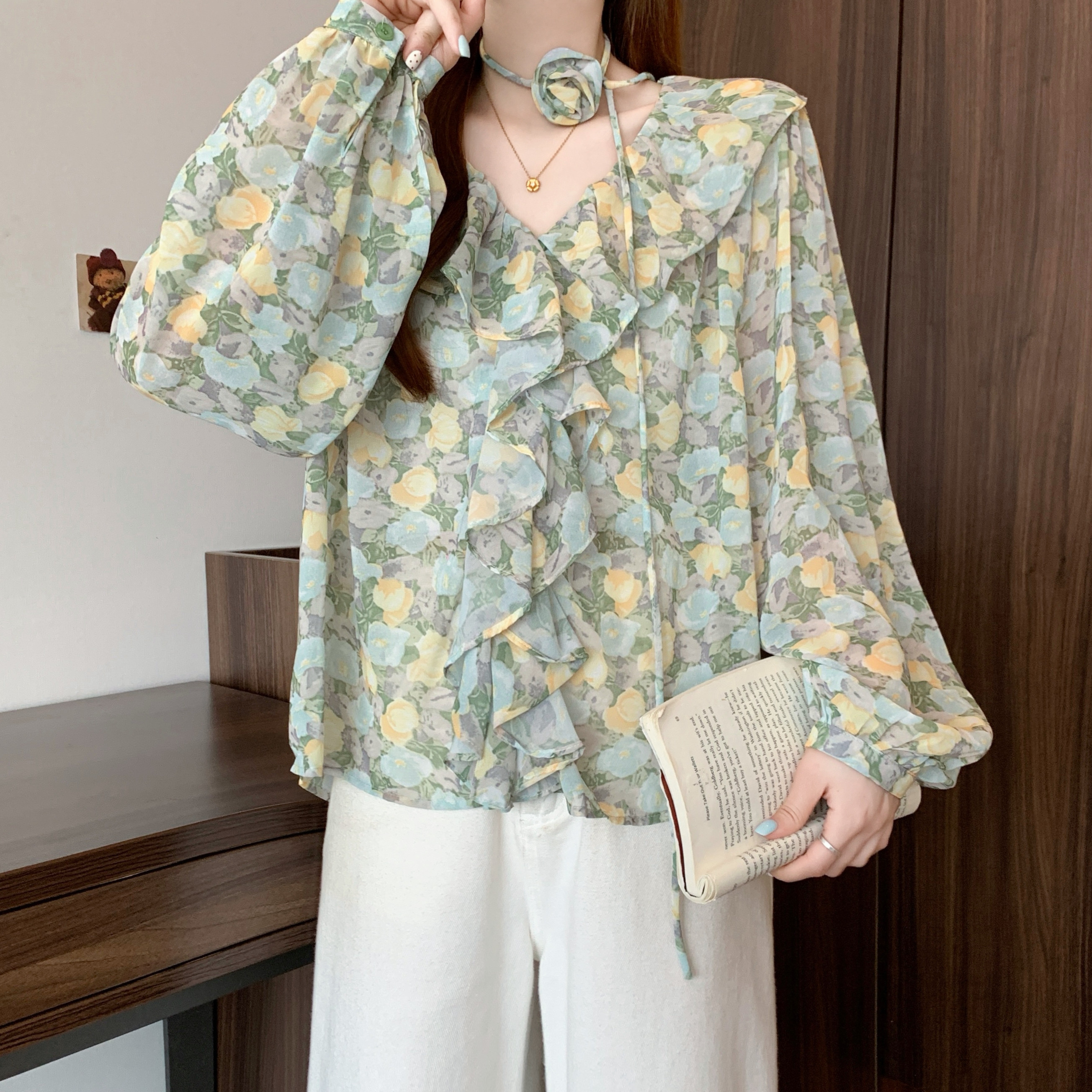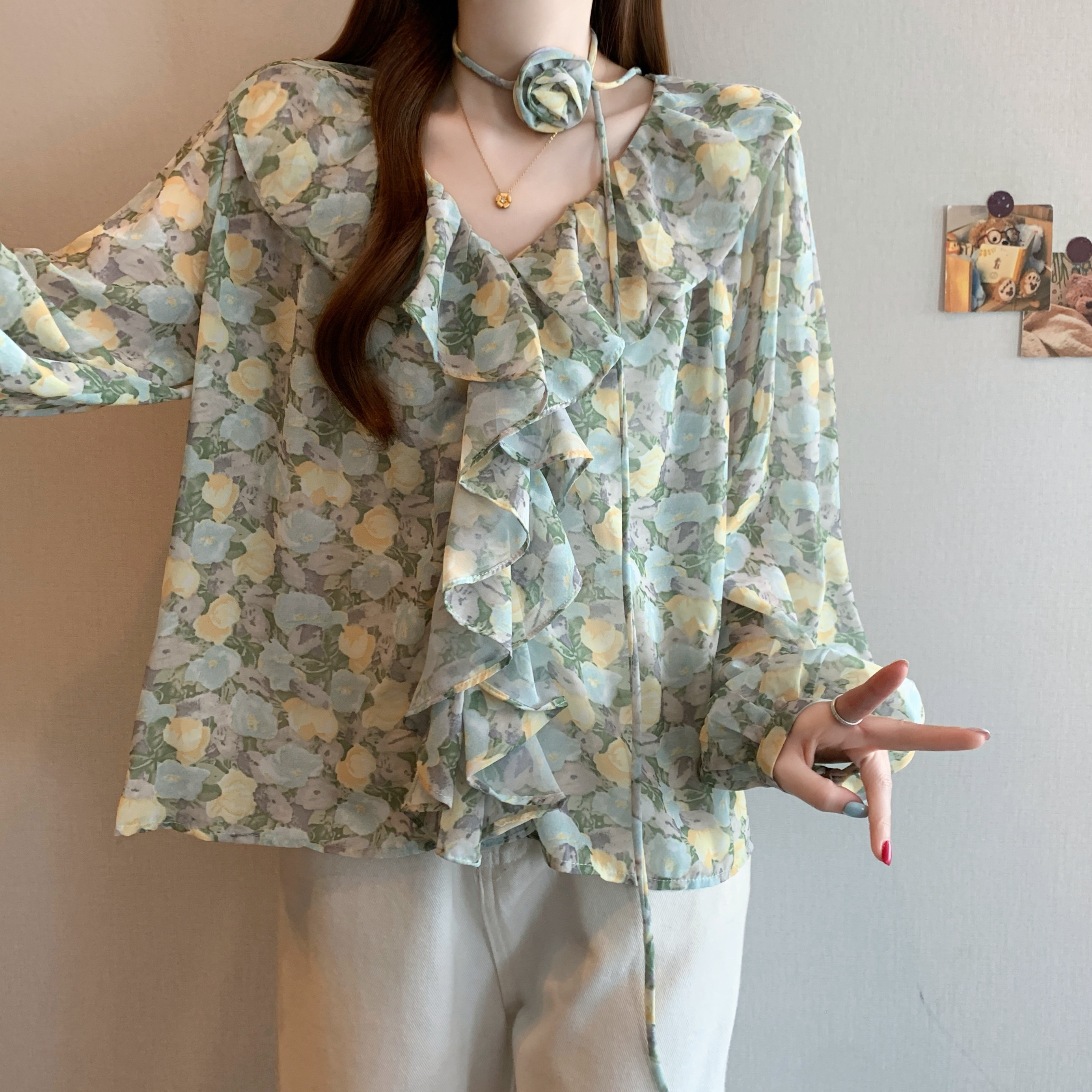 BY12412# 春装法式田园风荷叶边花朵衬衫女V领长袖雪纺衫 服裝批發女裝批發服飾貨源