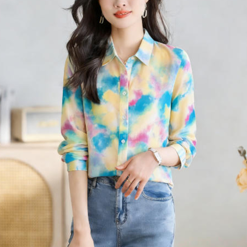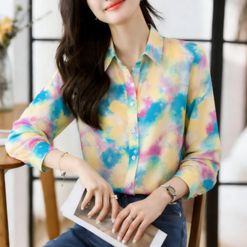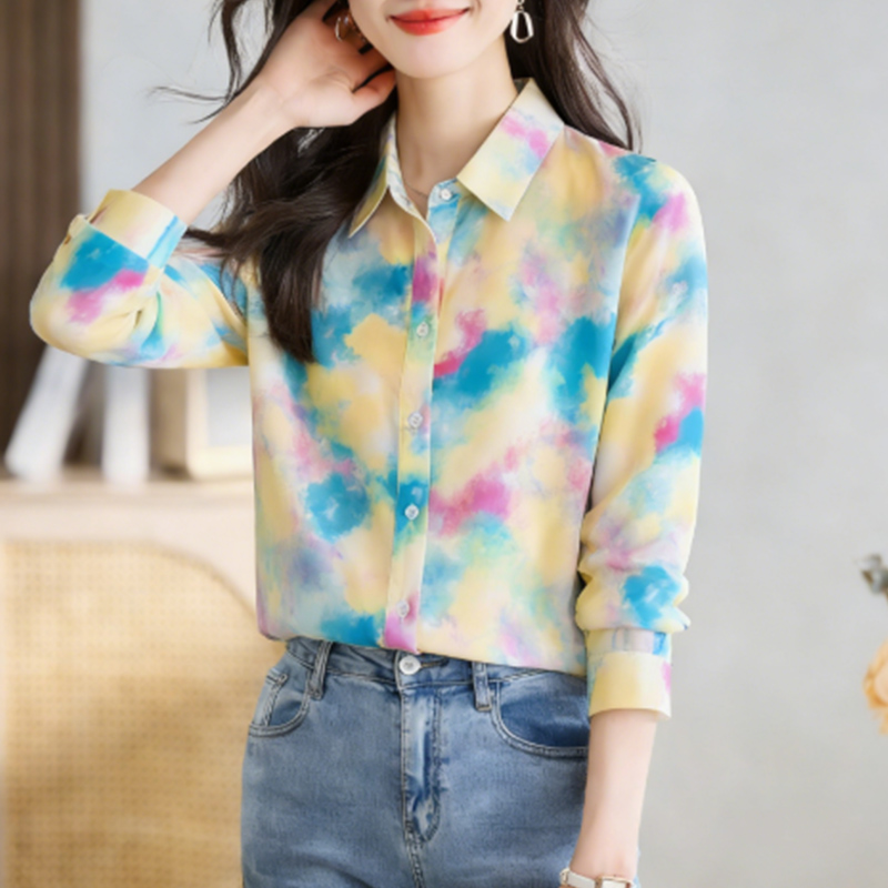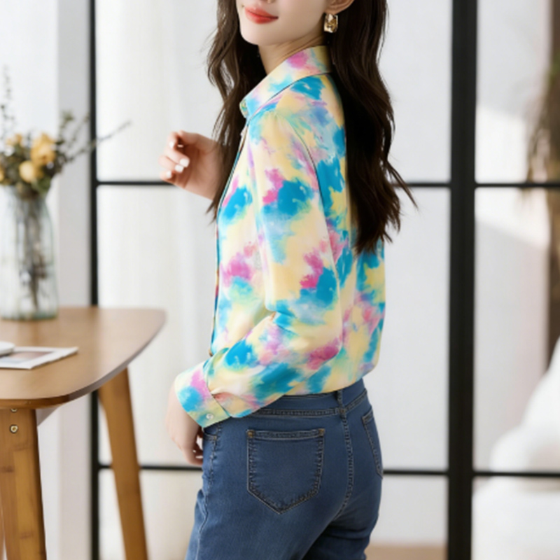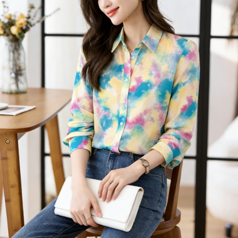 BY12414# 洋气秋季新款女装翻领彩色涂鸦雪纺衫上衣开衫衬衫打底衫衬衣 服裝批發女裝批發服飾貨源