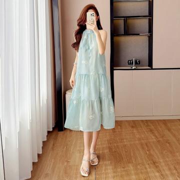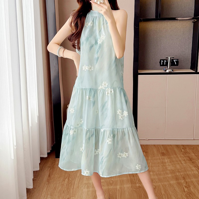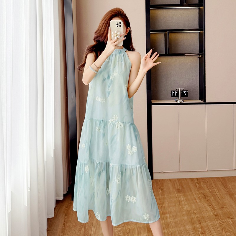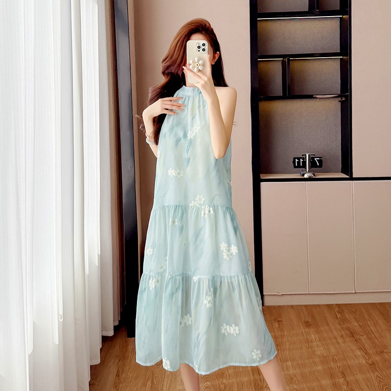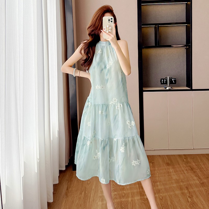 BY12458# 薄荷连衣裙温柔刺绣扎染印花挂脖短裙超仙度假拍照 服裝批發女裝批發服飾貨源