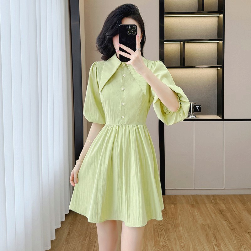 BY12461# 法式温柔甜美风翻领泡泡袖衬衫连衣裙女春季新款收腰显瘦短裙 服裝批發女裝批發服飾貨源