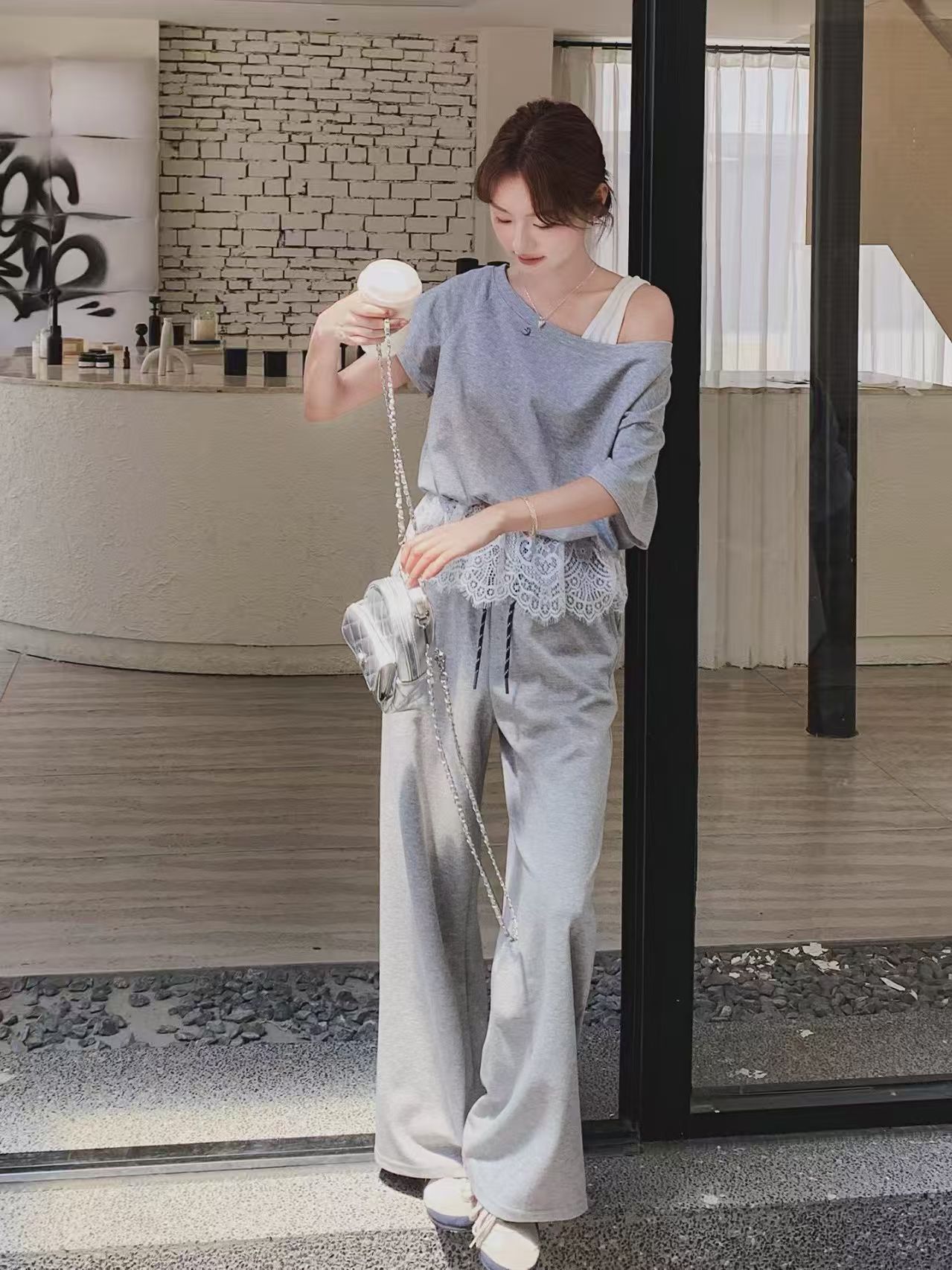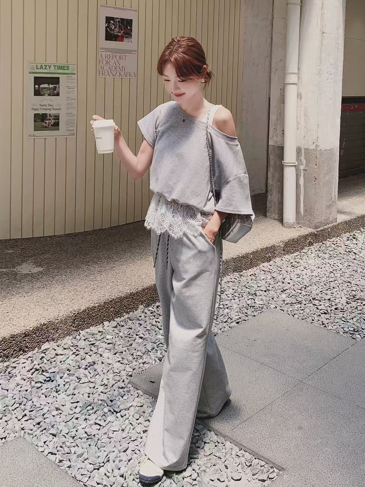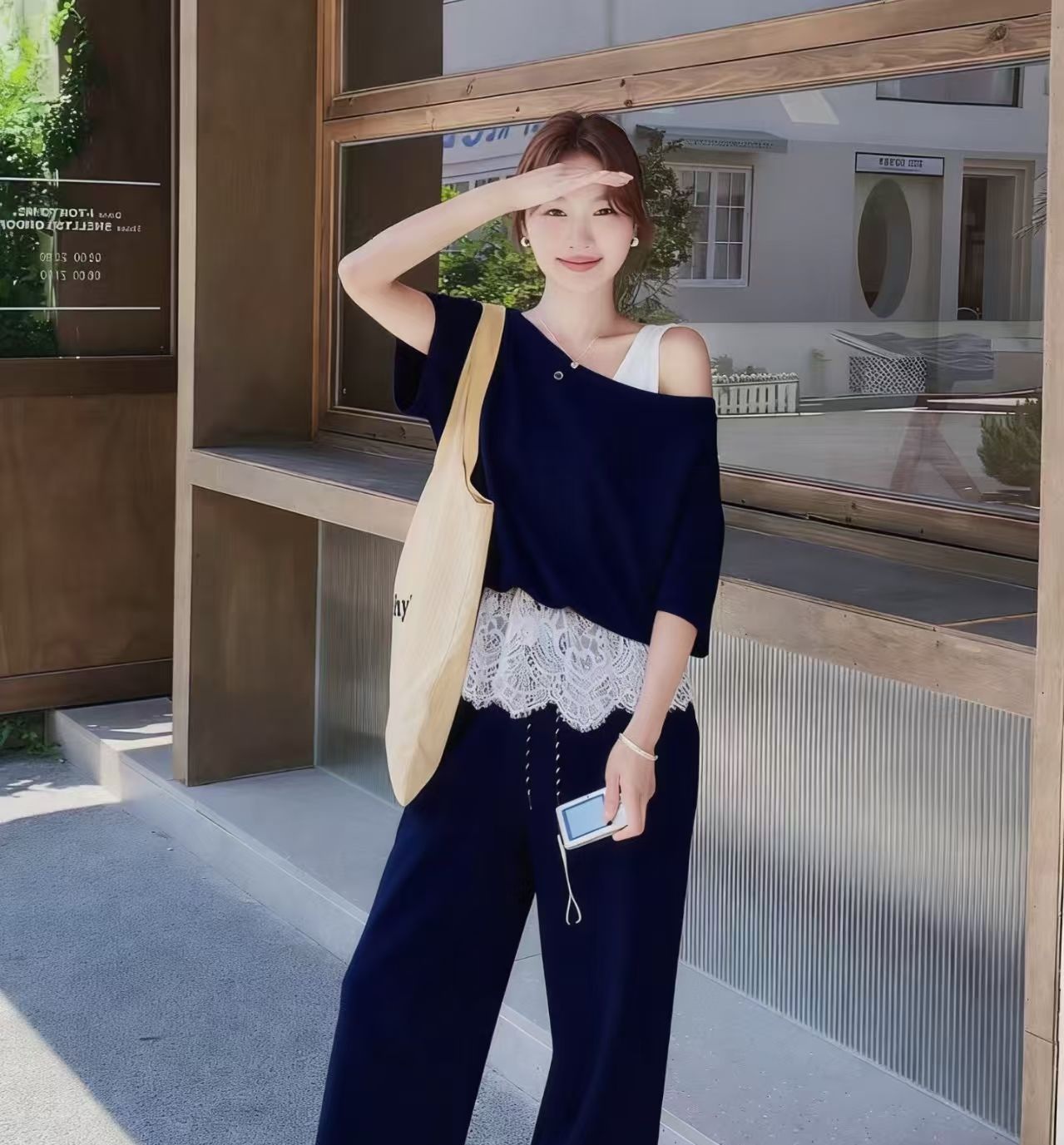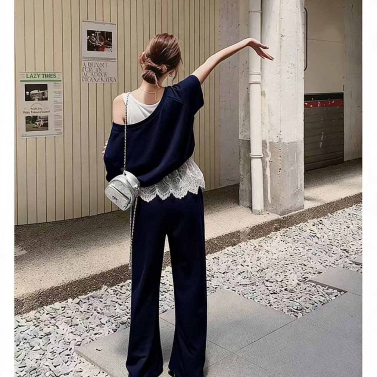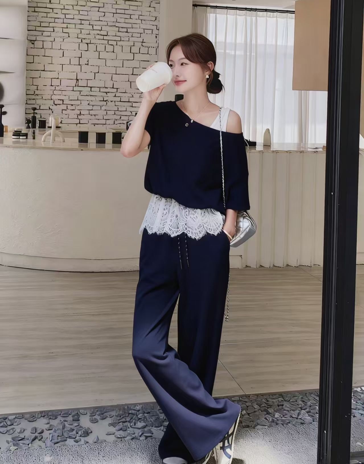 BY12620# 新款假两件上衣蕾丝阔腿裤套装时尚休闲百搭通勤日常 服裝批發女裝批發服飾貨源