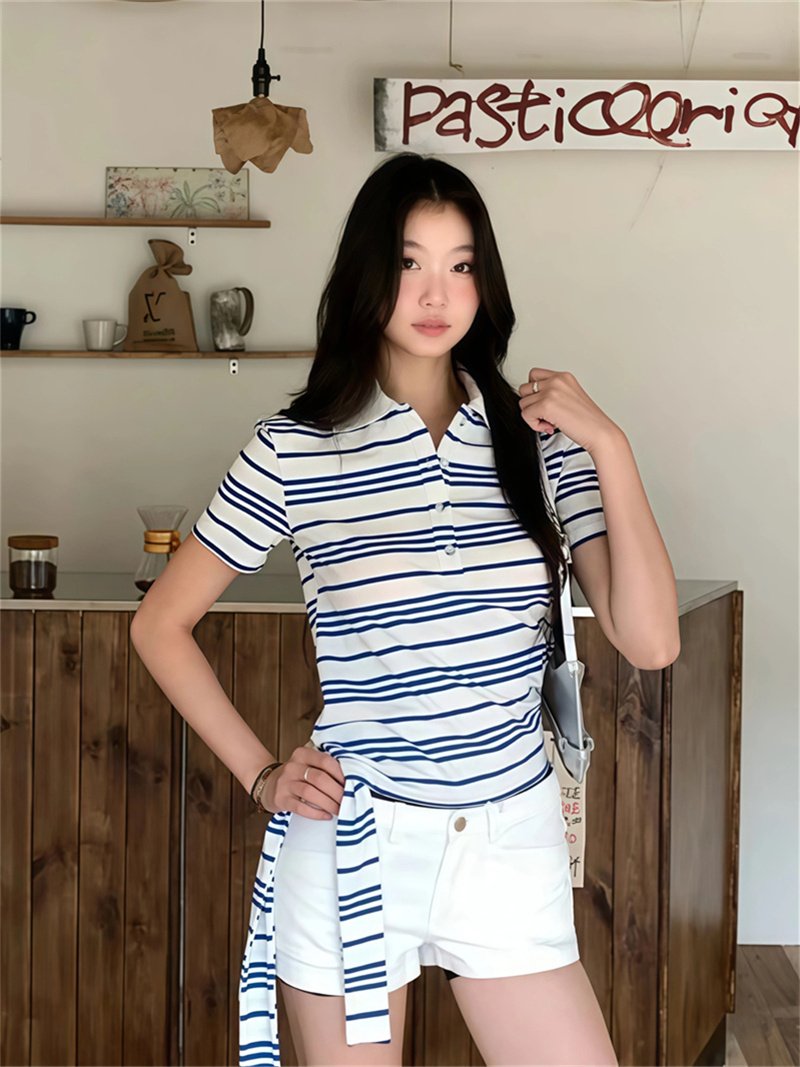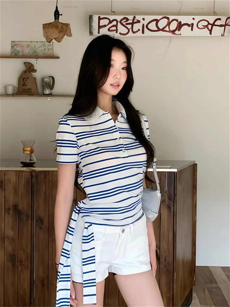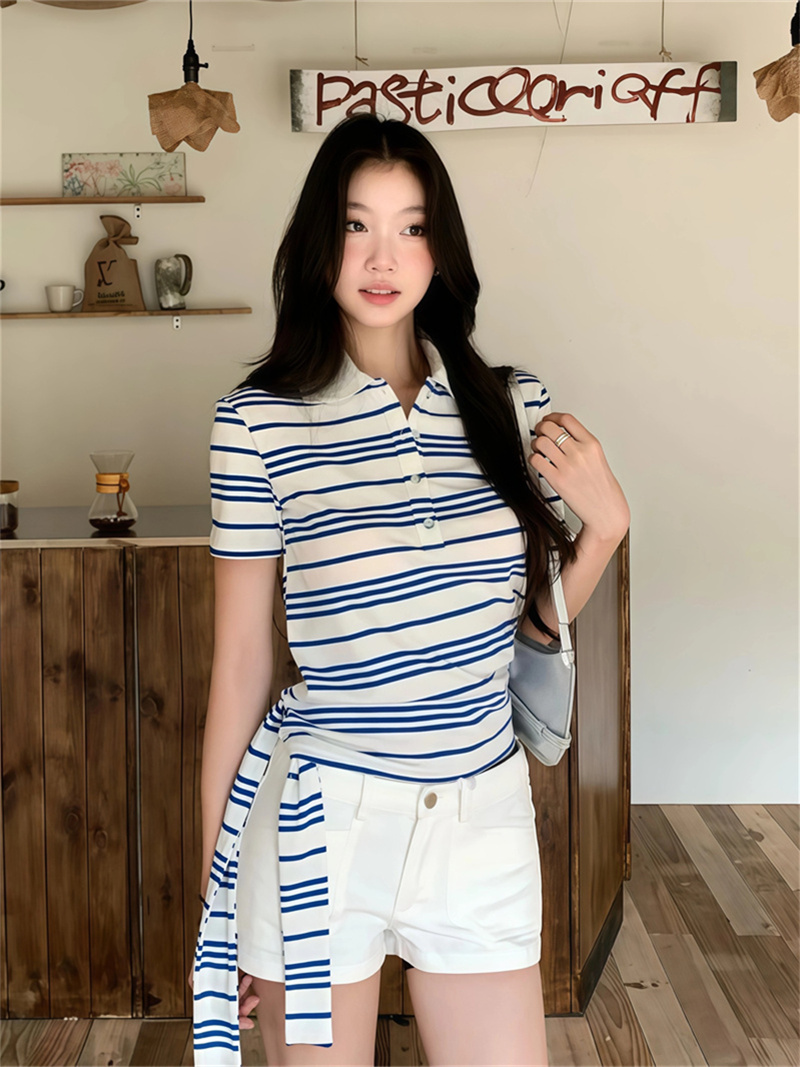 BY12683# 原版品质蓝白条纹绑带Polo衫短袖T恤女休闲百搭正肩短款上衣 服裝批發女裝批發服飾貨源