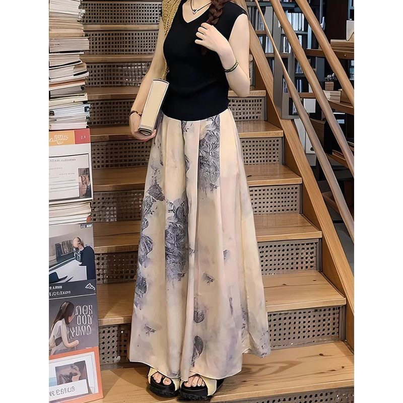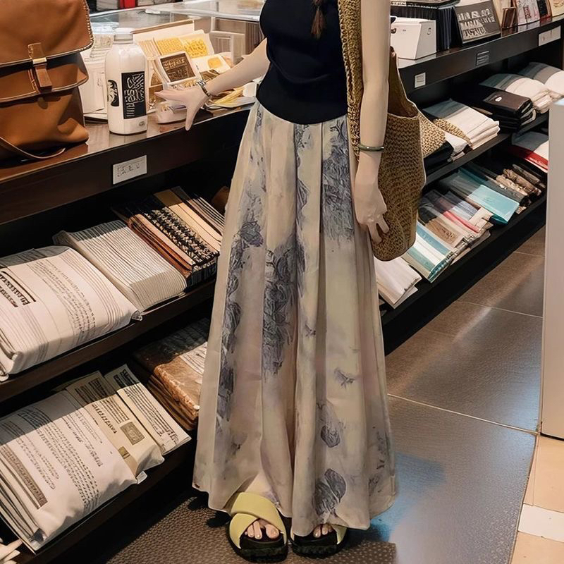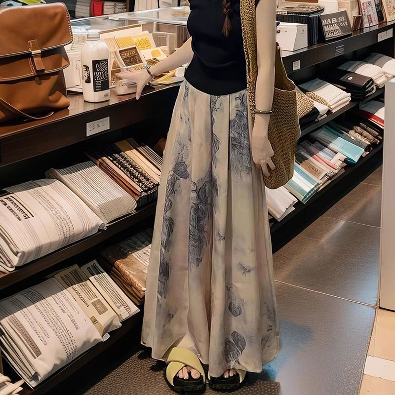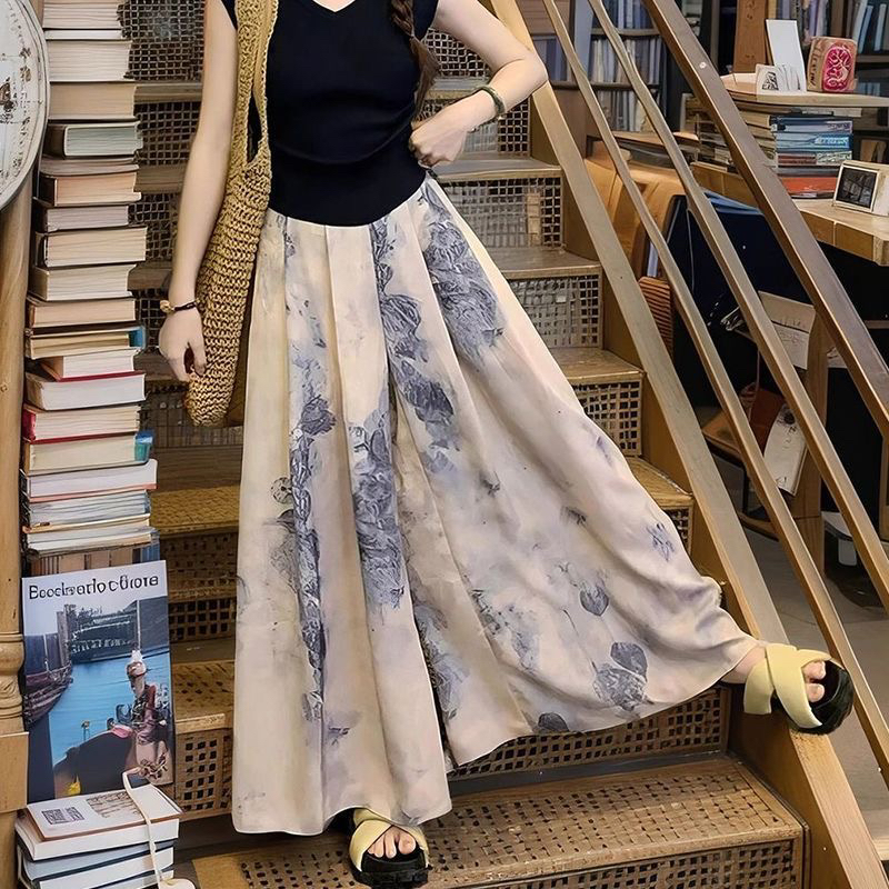 BY13755# 冰丝水墨阔腿裤裙子女夏季薄款显瘦垂感大码休闲直筒九分半身裙裤 服裝批發女裝批發服飾貨源