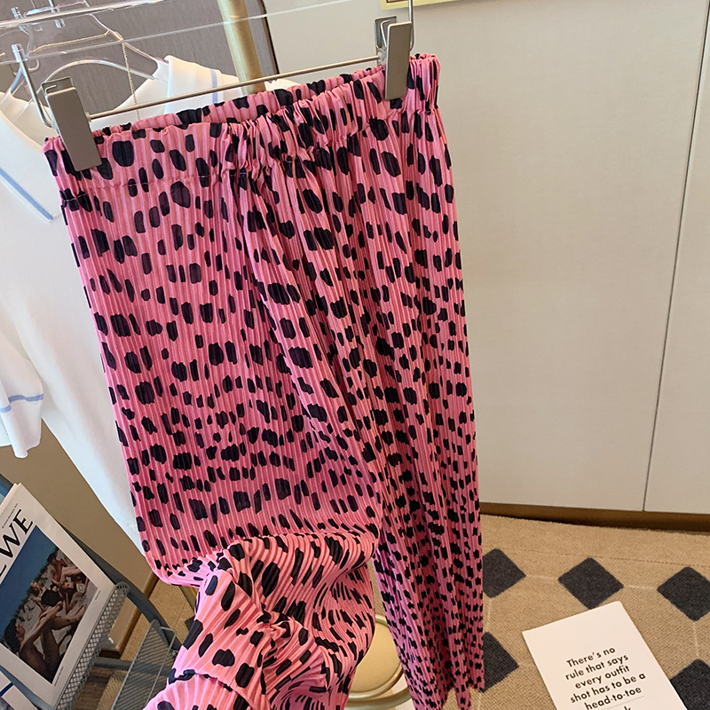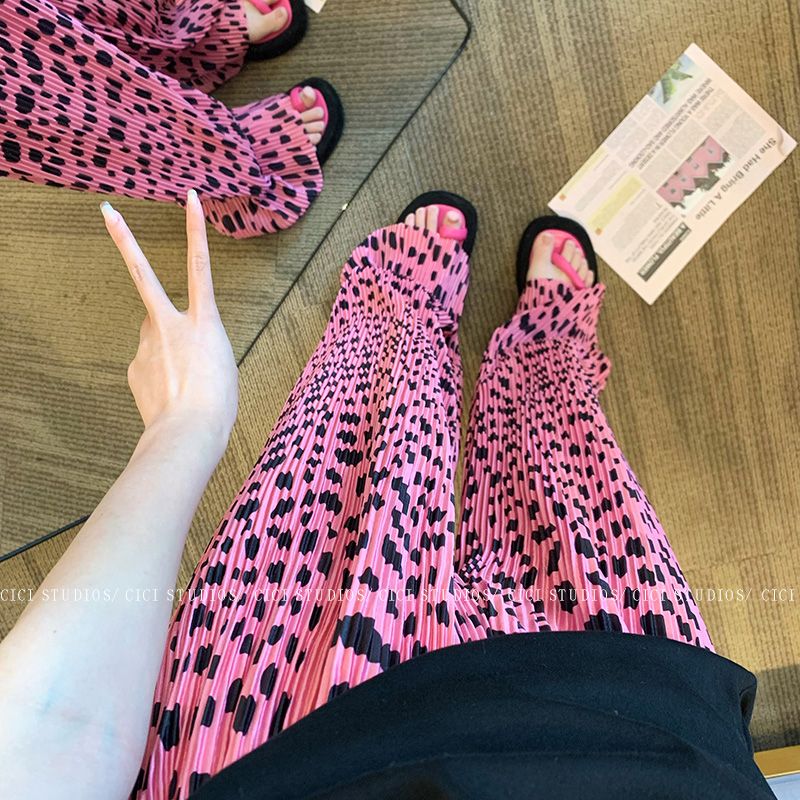 BY13795# 夏新款粉色豹纹性感时尚阔腿裤女百搭休闲裤高腰垂感拖地长裤 服裝批發女裝批發服飾貨源