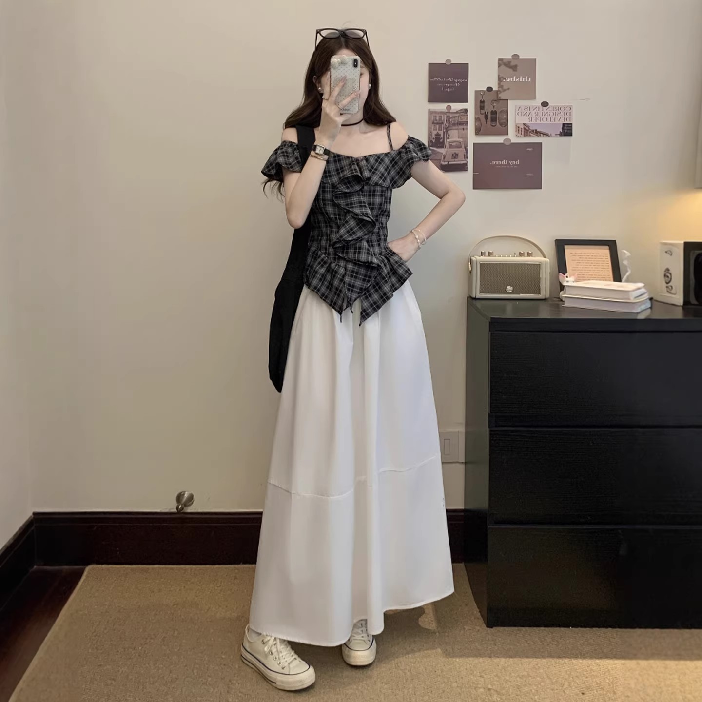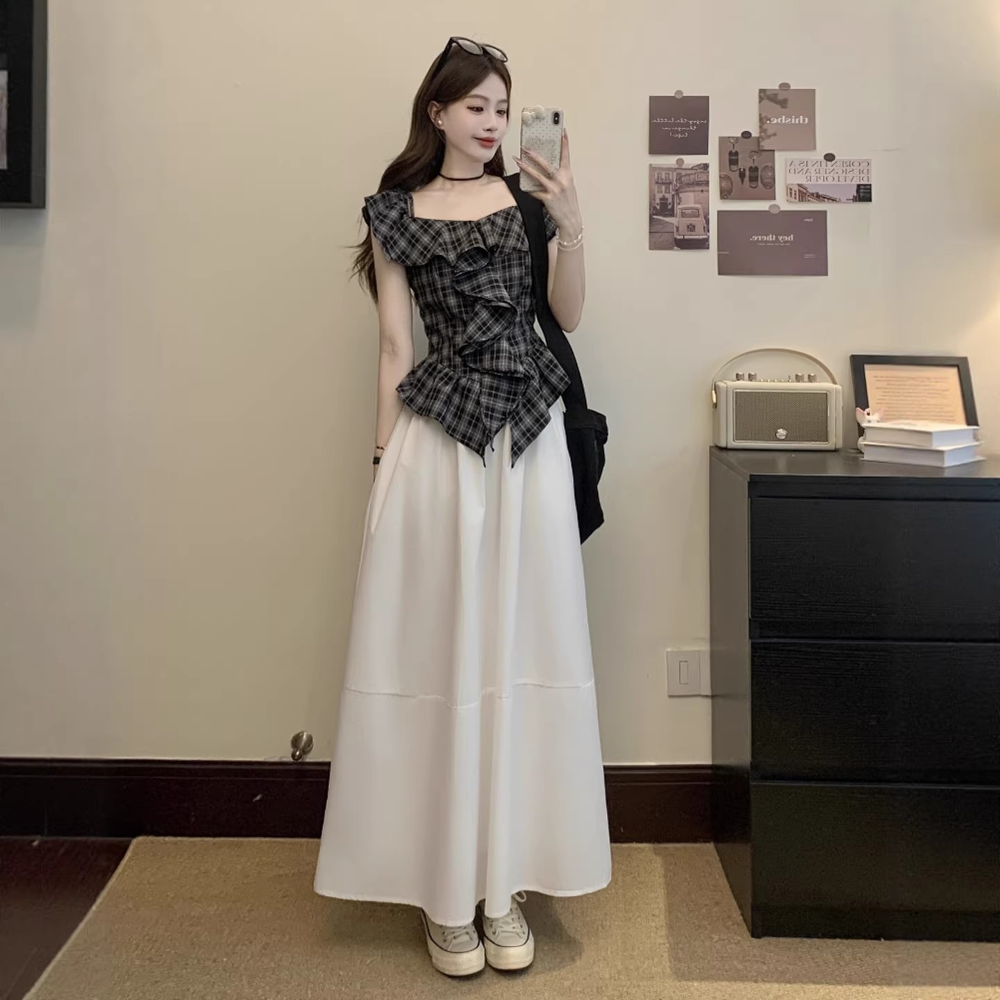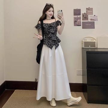 BY14438# 格纹一字肩短袖T恤女夏季甜美露肩木耳边上衣设计感露肩吊带上衣服裝批發女裝批發服飾貨源