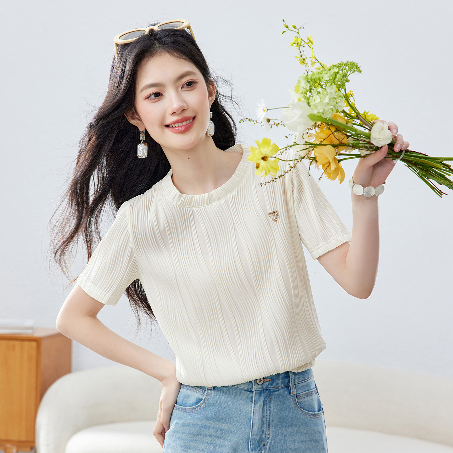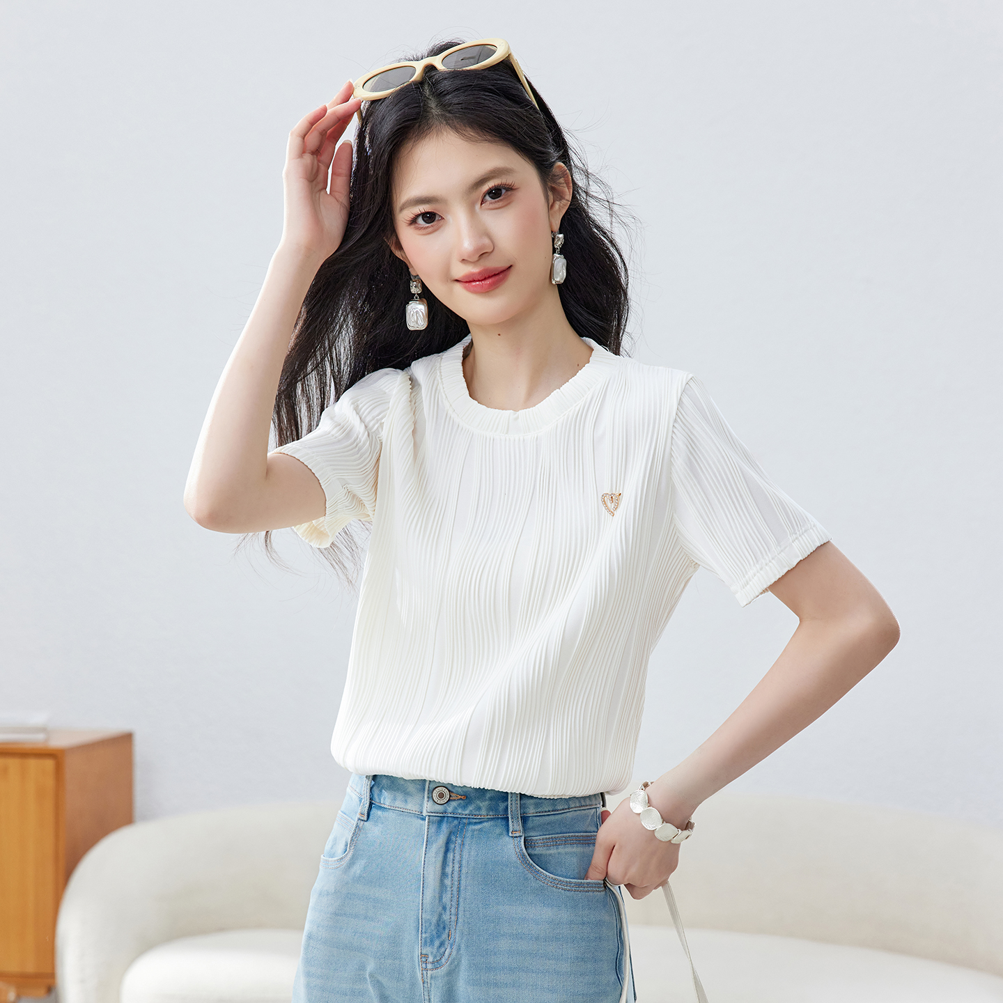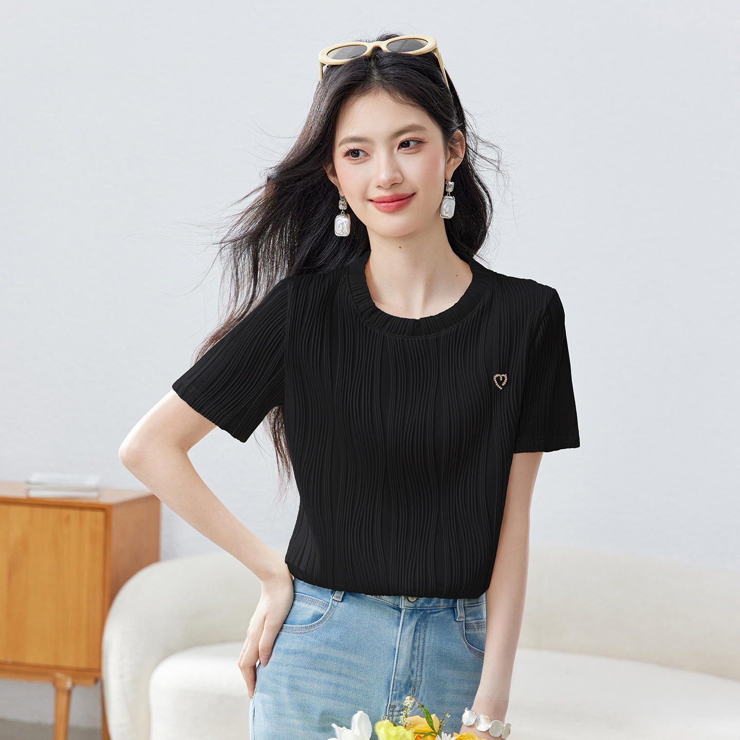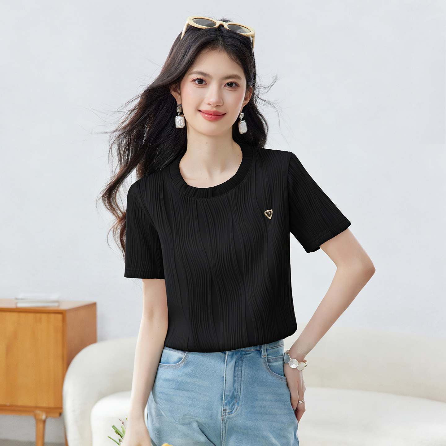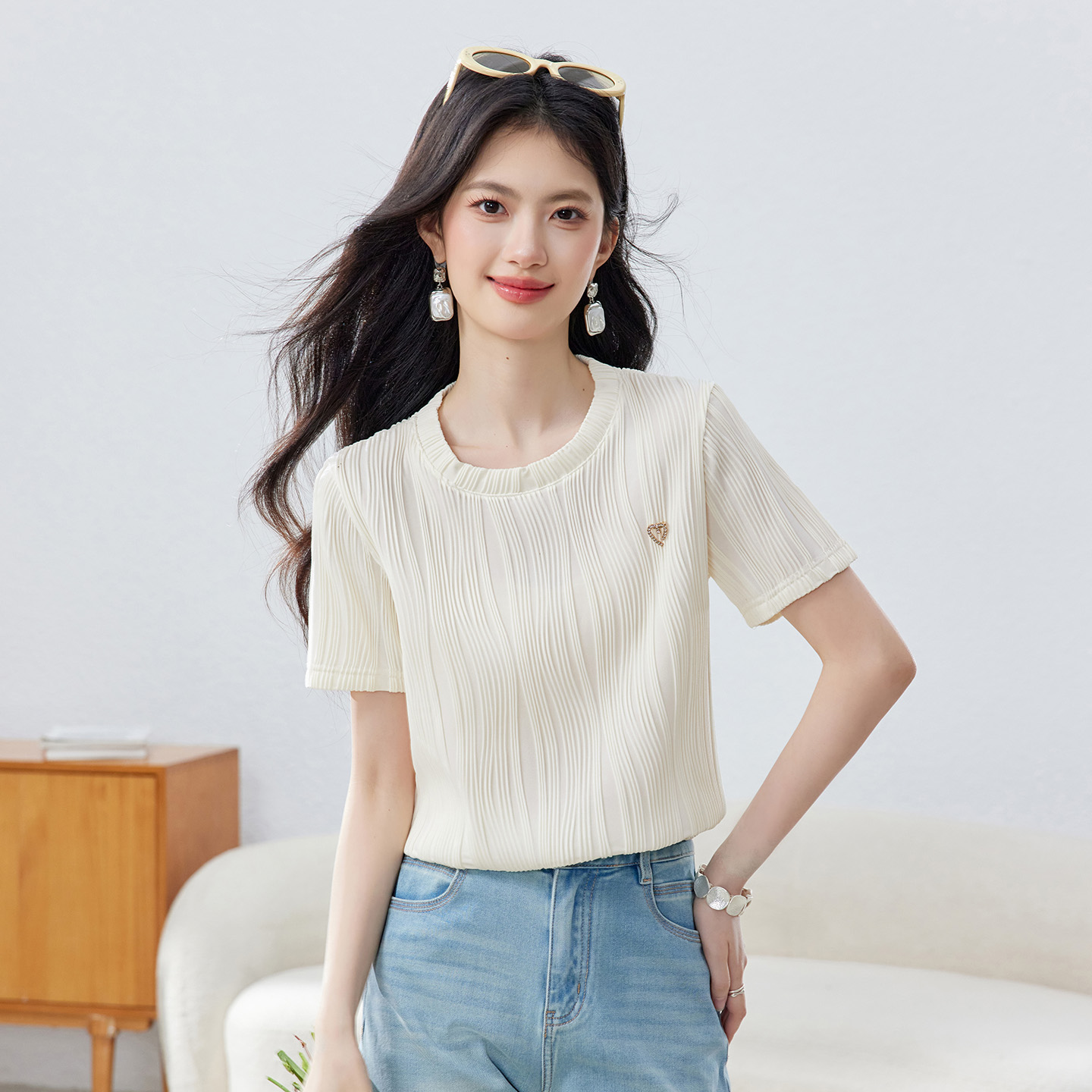 BY14441# ·优雅气质高级感超好看上衣夏季圆领短袖肌理感质感纯色T恤服裝批發女裝批發服飾貨源