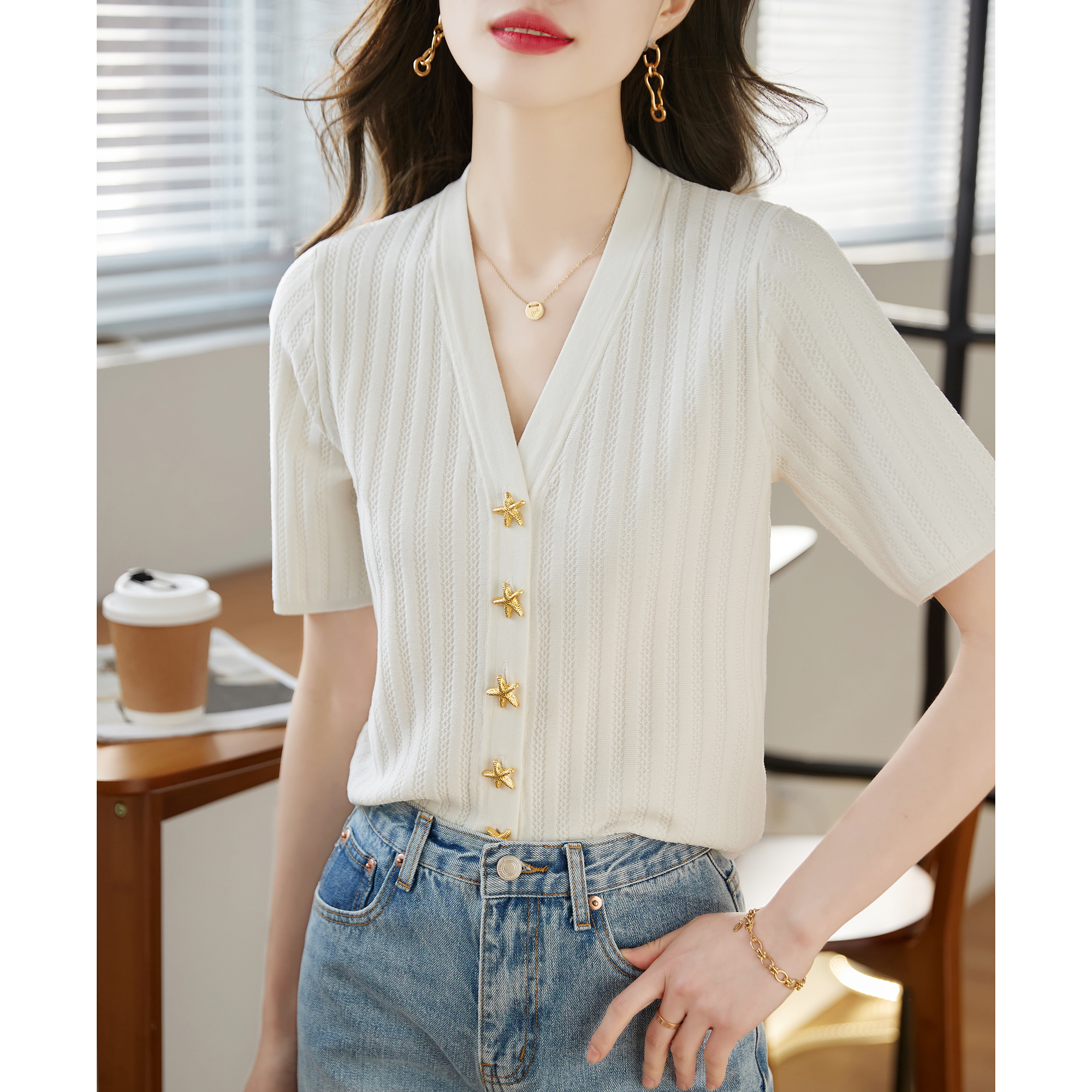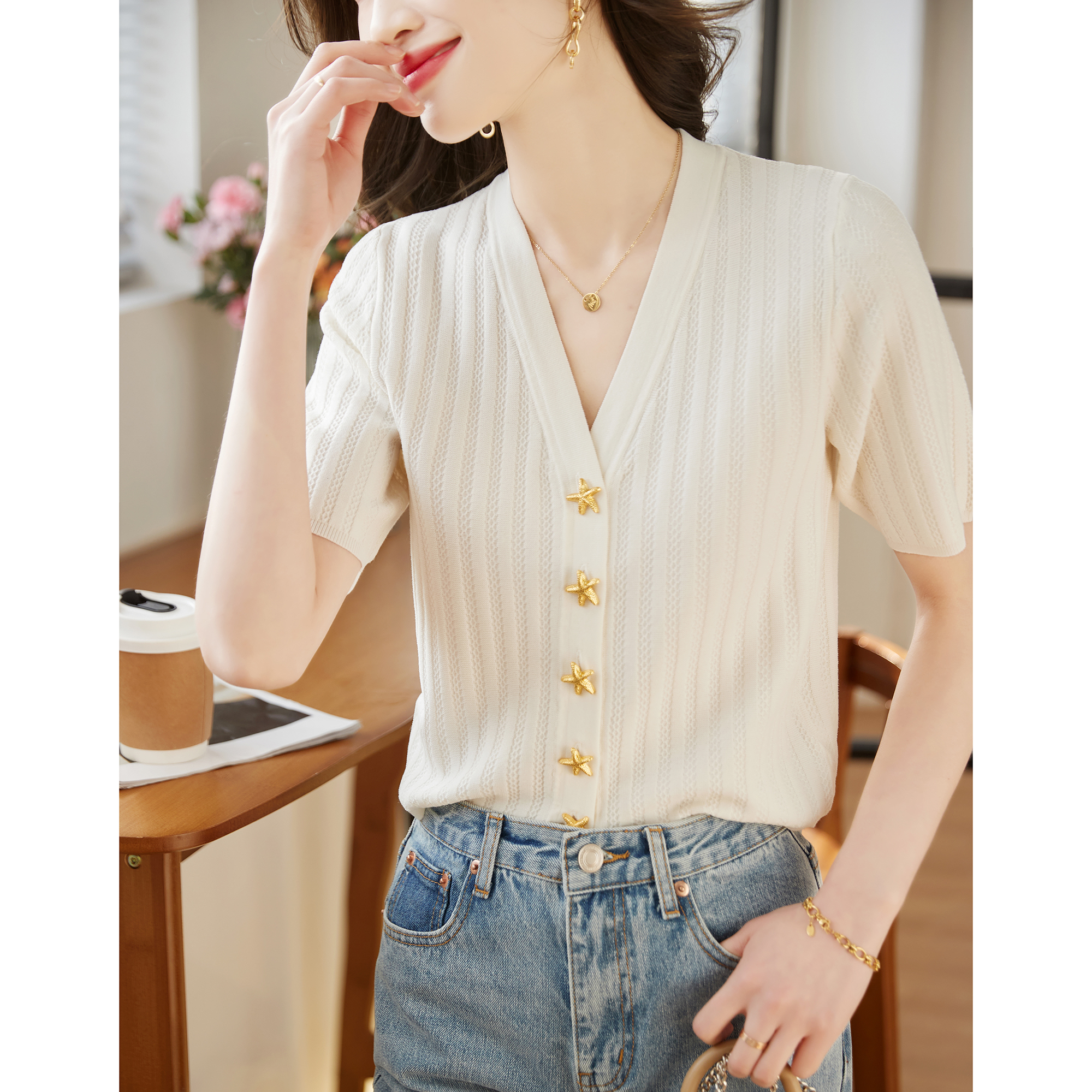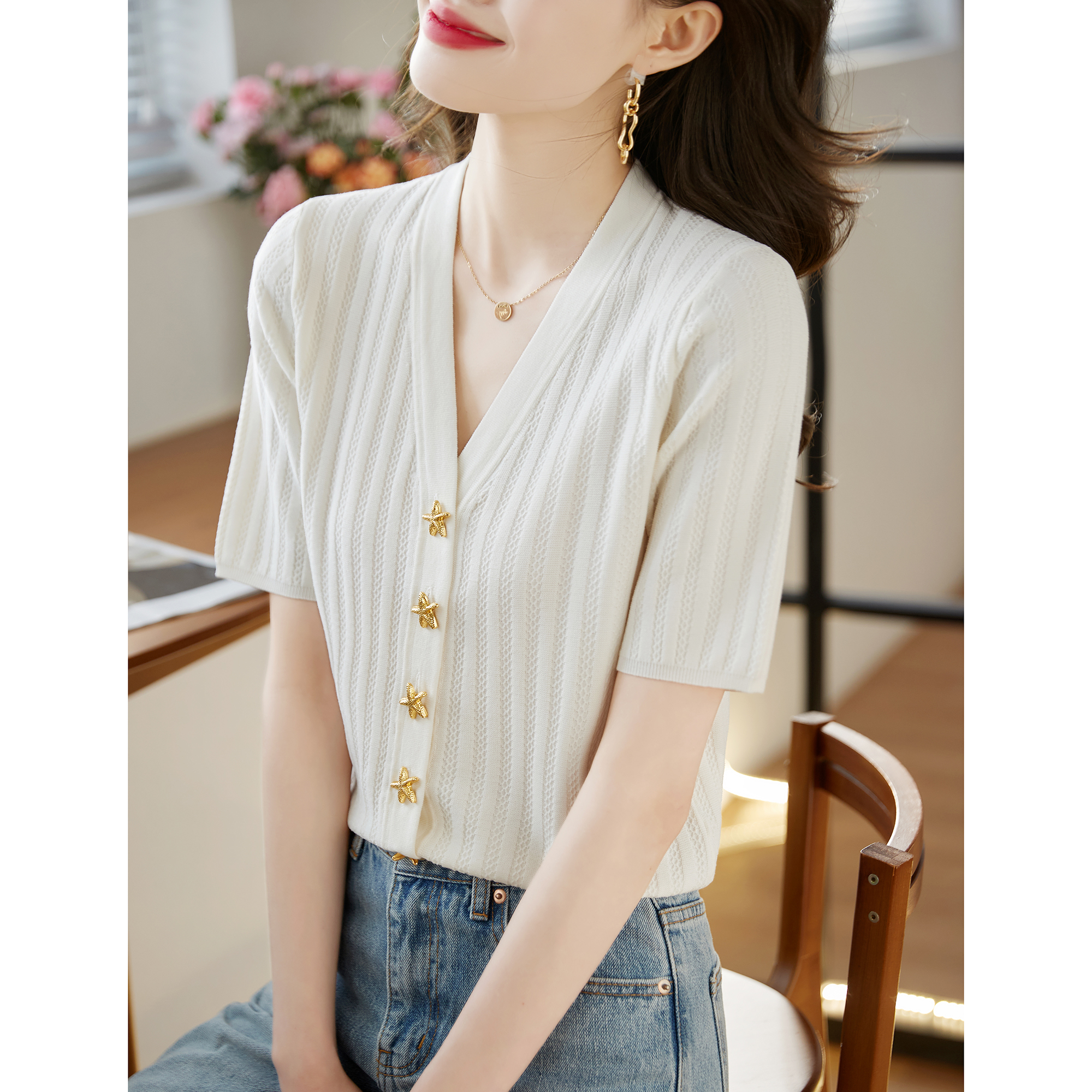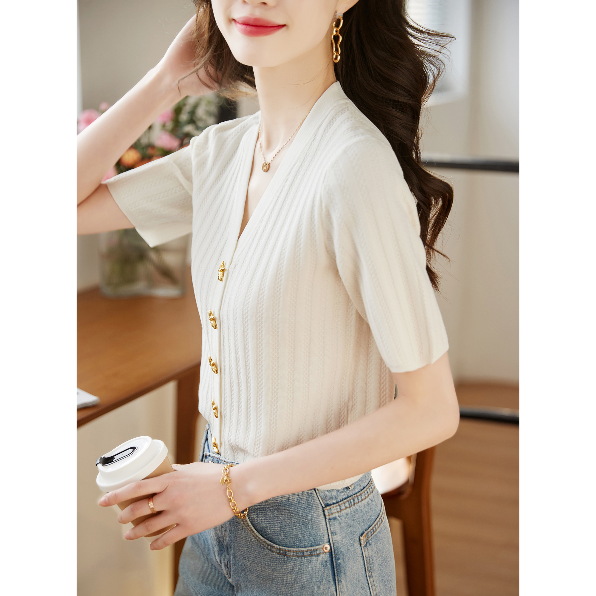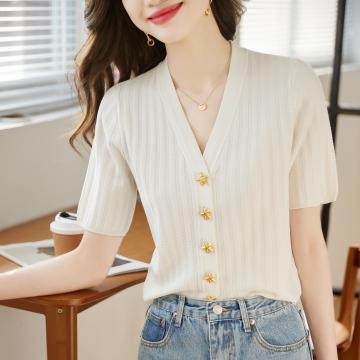 BY14451# 法式高级感小香风开衫短款上衣女夏薄款别致V领冰丝短袖针织小衫服裝批發女裝批發服飾貨源