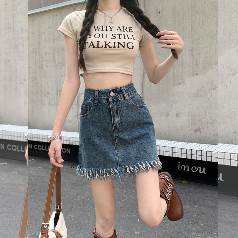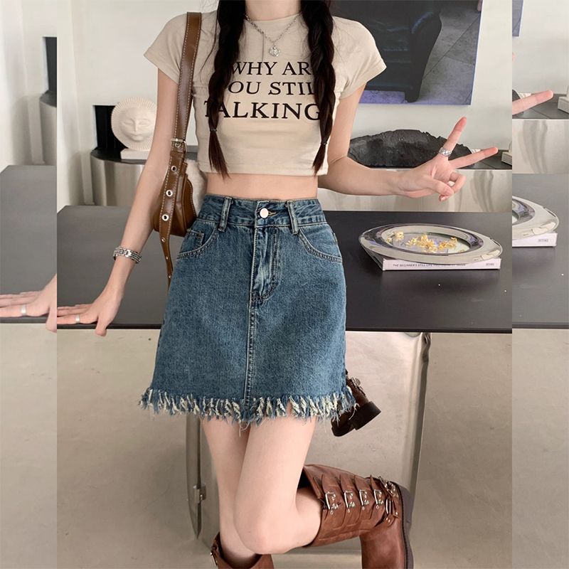 BY14641# 时尚设计感毛边流苏牛仔短裙女夏季新款百搭包臀a字型复古半身裙 服裝批發女裝批發服飾貨源
