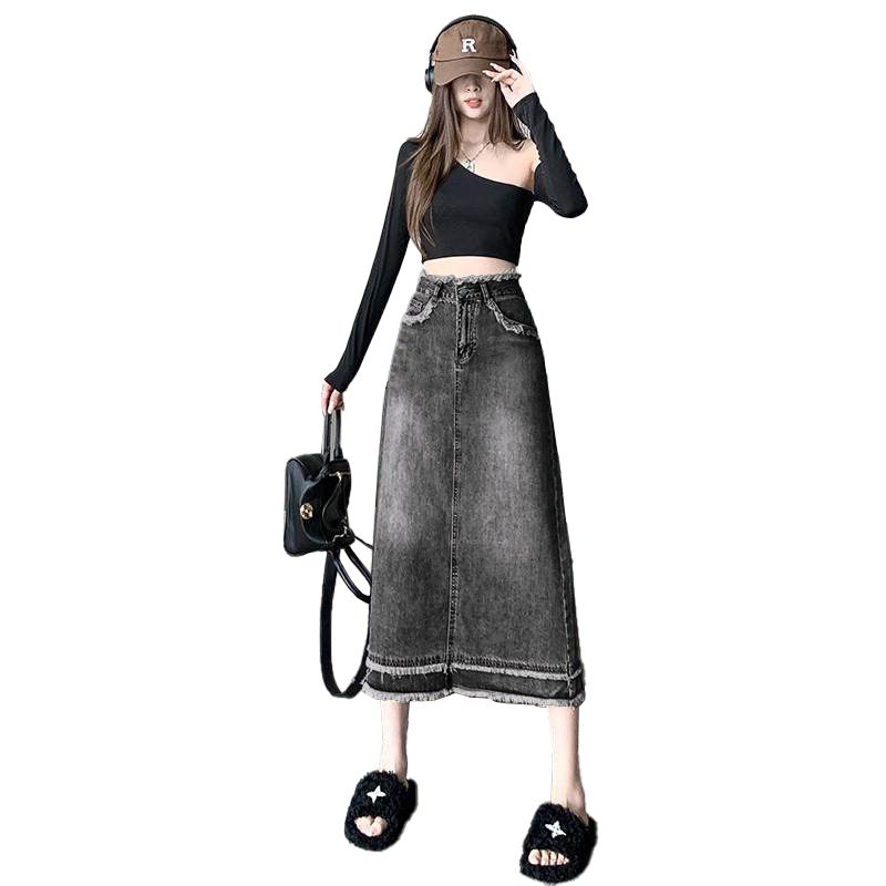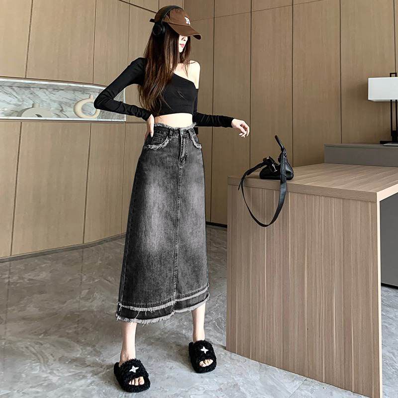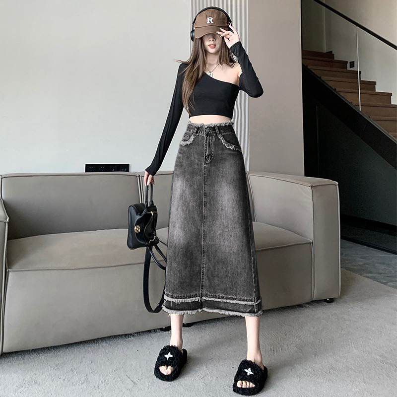 BY14642# 毛边设计感ins风a字牛仔裙女夏季新款高腰直筒中长半身包臀裙子 服裝批發女裝批發服飾貨源
