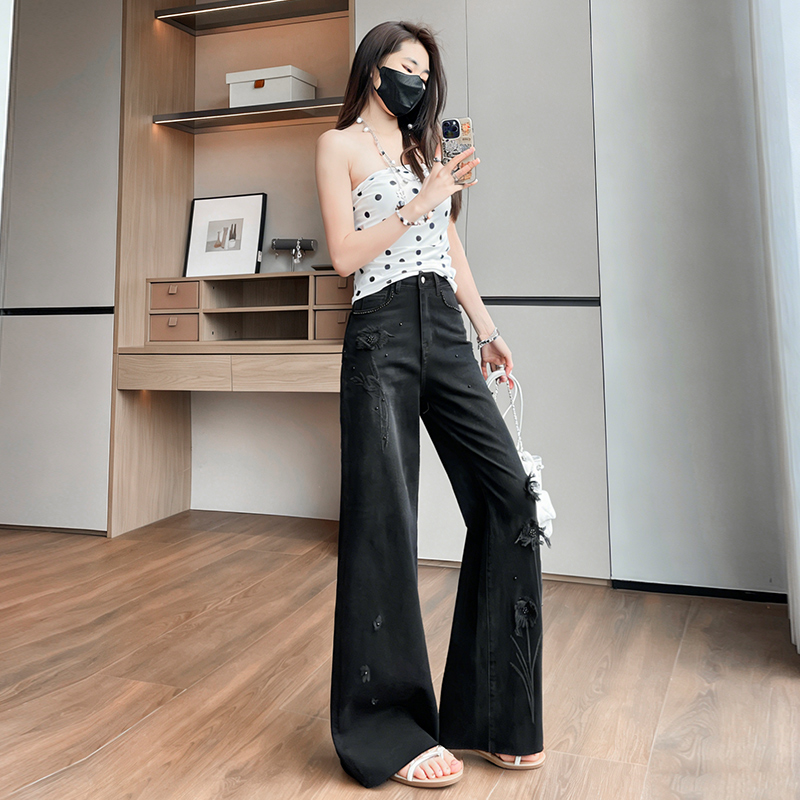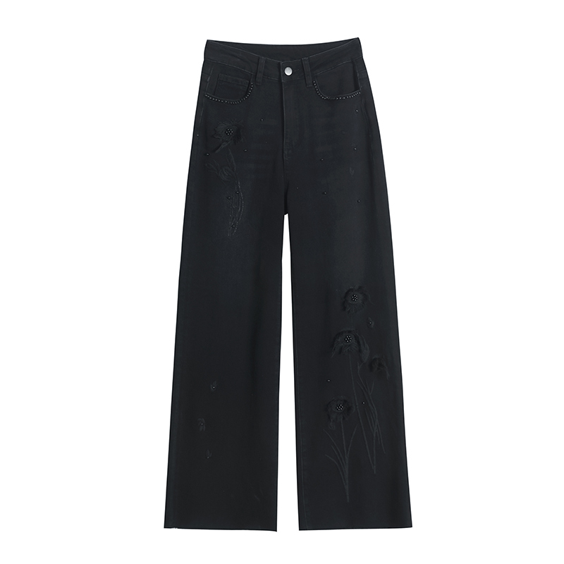 BY16320# 黑色复古直筒牛仔裤女新款钉珠刺绣时髦窄版阔腿牛仔裤女 服裝批發女裝批發服飾貨源