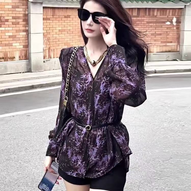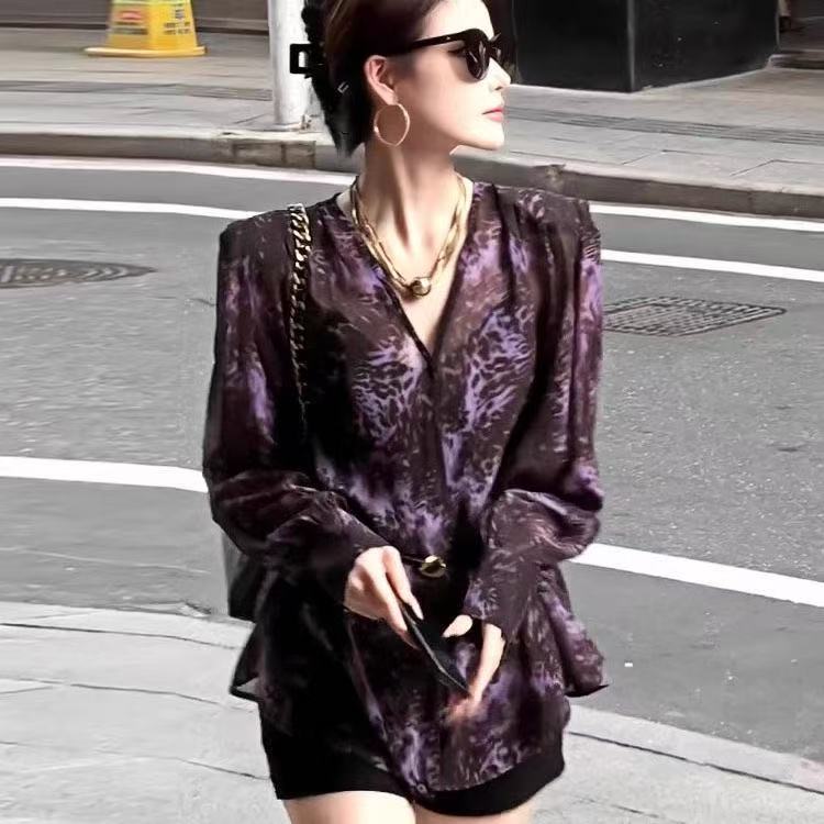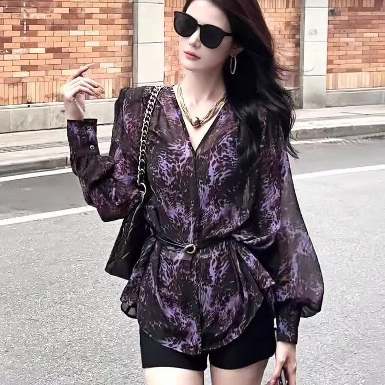 BY16344# 法式轻奢高级豹纹印花紫色衬衫女春夏新款时尚洋气百搭气质上衣 服裝批發女裝批發服飾貨源