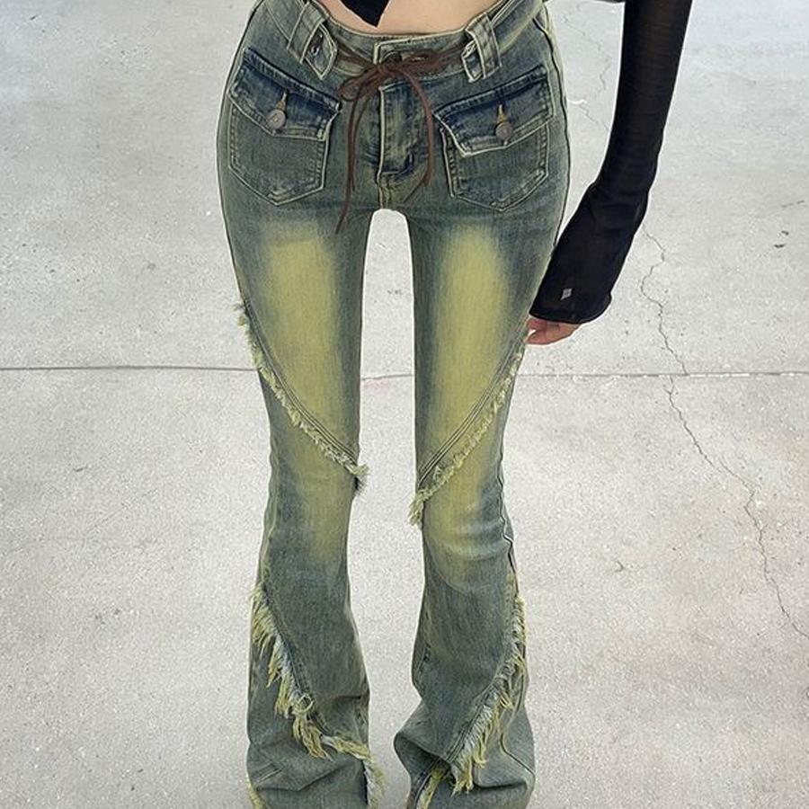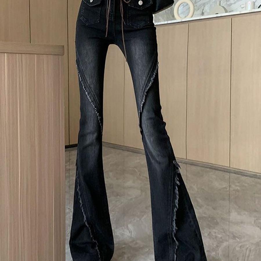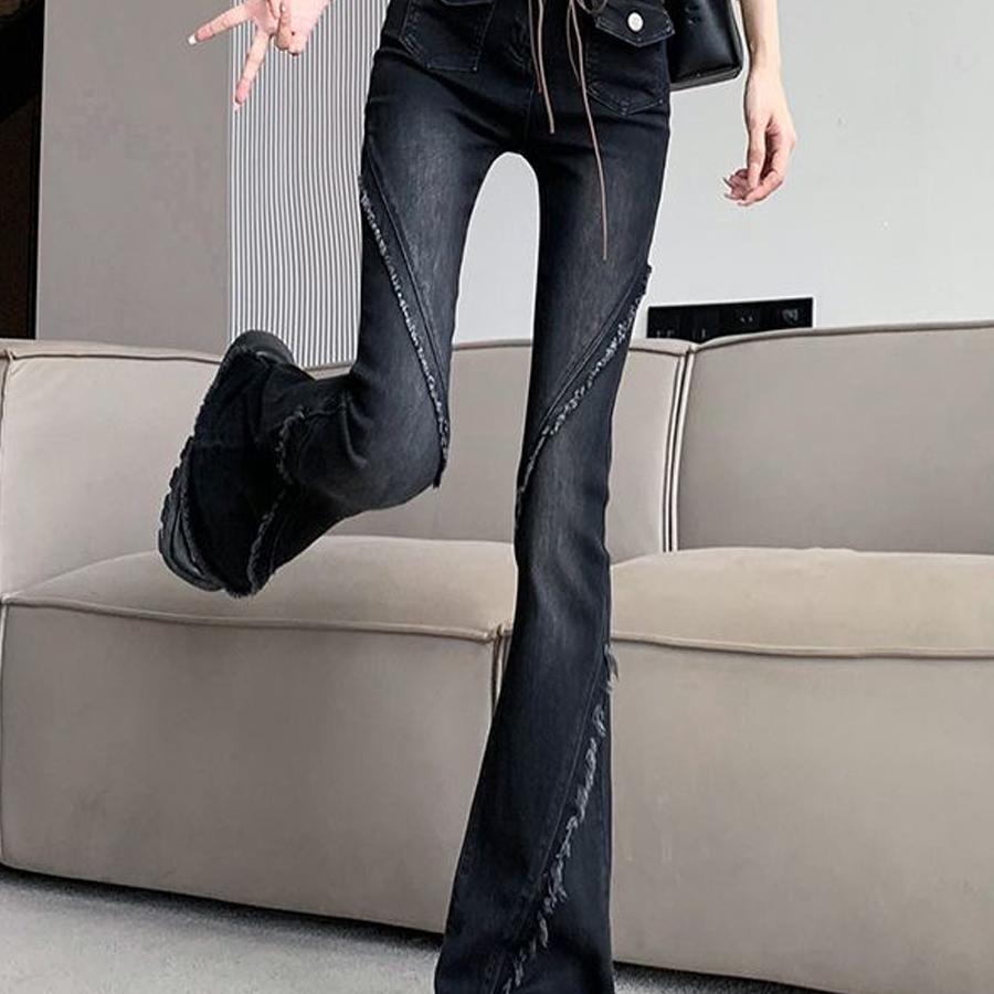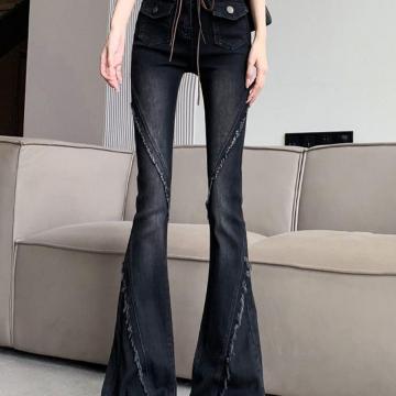 BY16531# 复古毛边微喇牛仔裤女新款高腰显瘦修身黑色马蹄喇叭长裤 服裝批發女裝批發服飾貨源