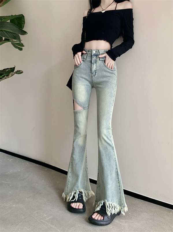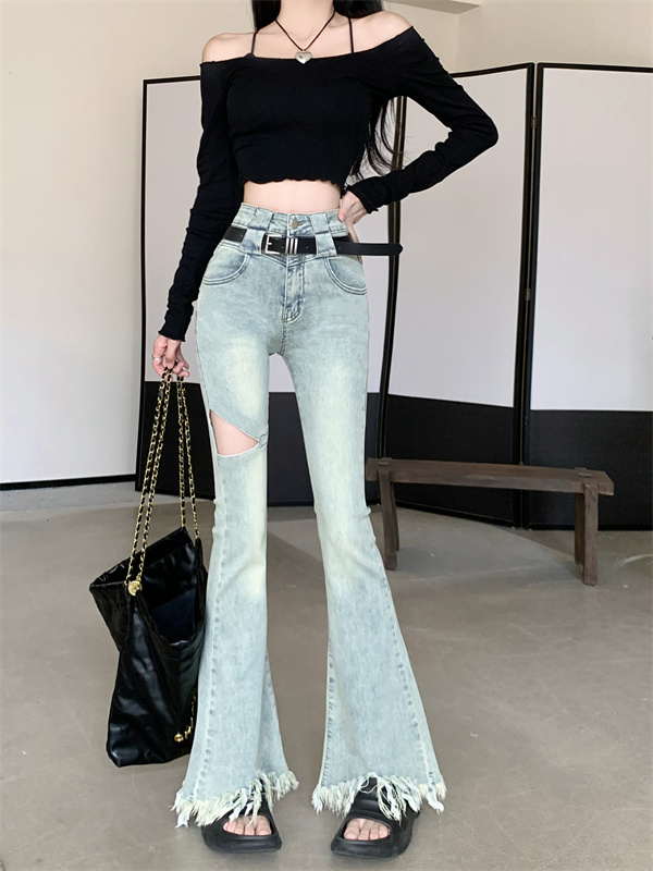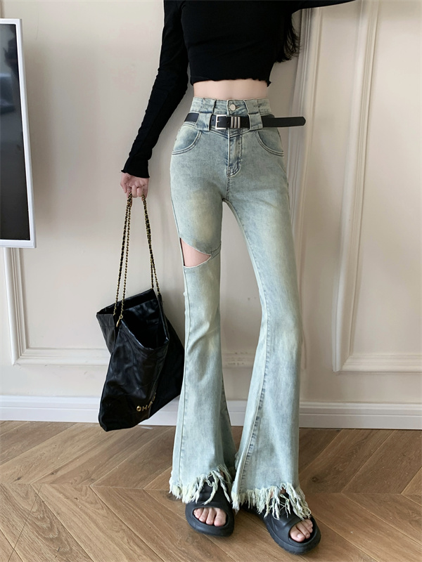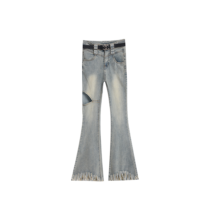 BY16533# 高腰显瘦毛边牛仔裤直筒长裤修身复古破洞裤子微喇叭裤女新款 服裝批發女裝批發服飾貨源