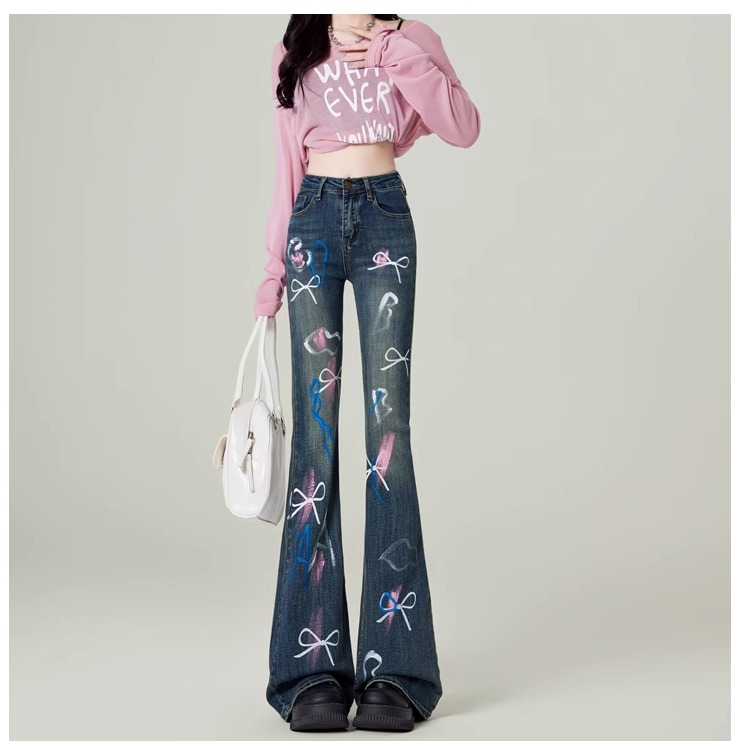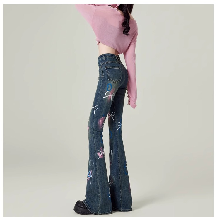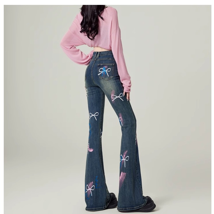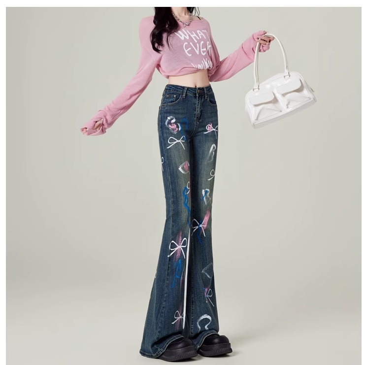 首页 > 牛仔裤、长裤 > BY16540# 辣妹蝴蝶结涂鸦微喇叭牛仔裤女新款美式深蓝修身高腰马蹄裤子 服裝批發女裝批發服飾貨源