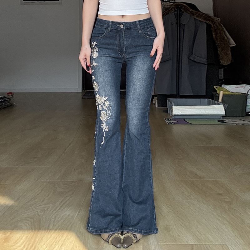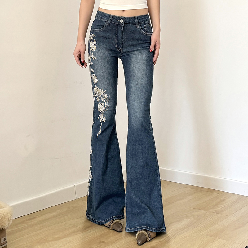 BY16541# 中古风玫瑰刺绣蓝色牛仔裤修身显瘦喇叭裤女 服裝批發女裝批發服飾貨源