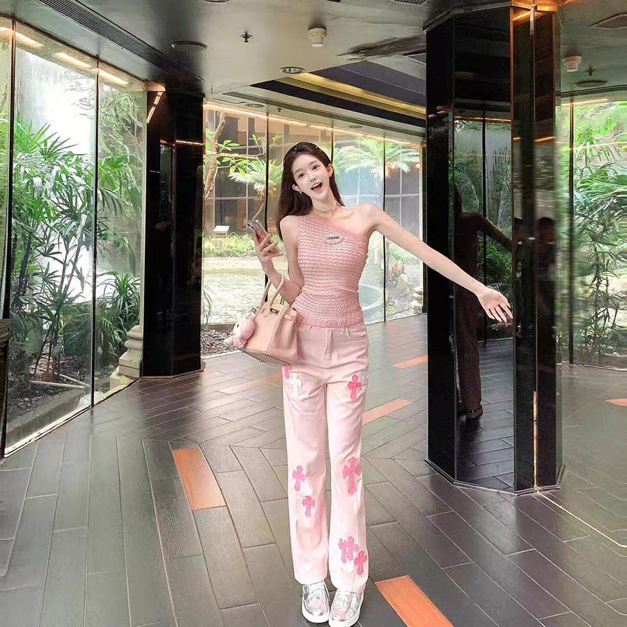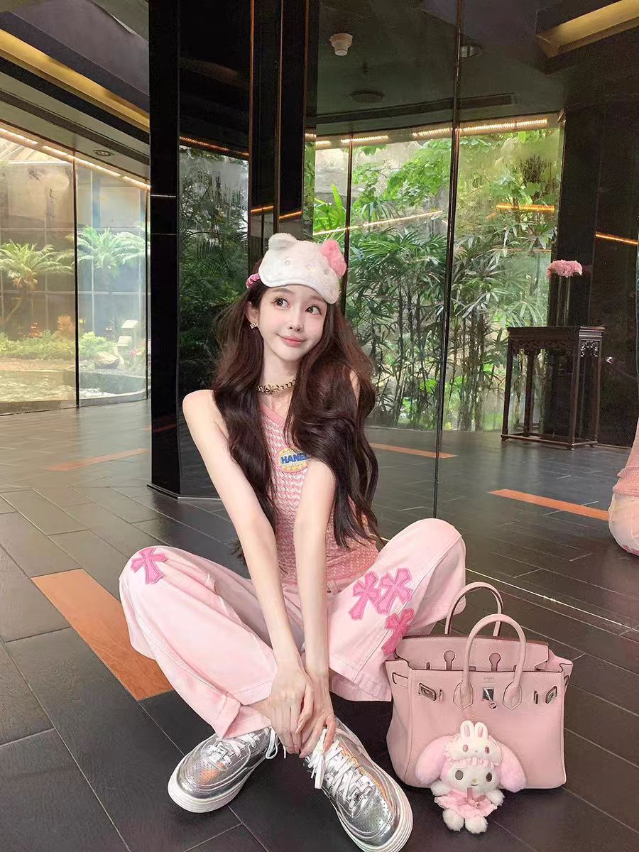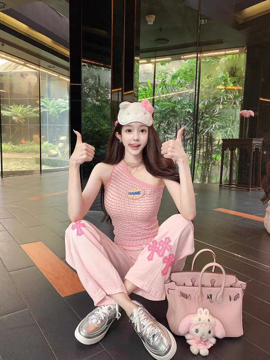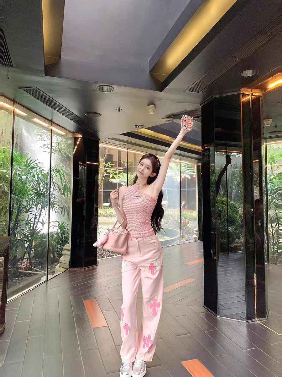BY16542# 美式重工粉色刺绣高腰直筒牛仔裤女新款宽松阔腿裤长裤 服裝批發女裝批發服飾貨源