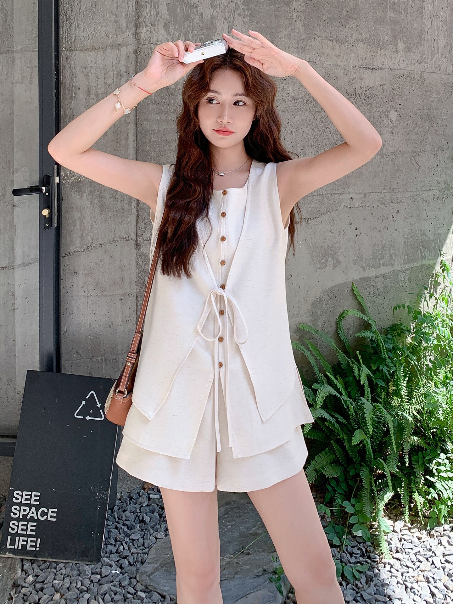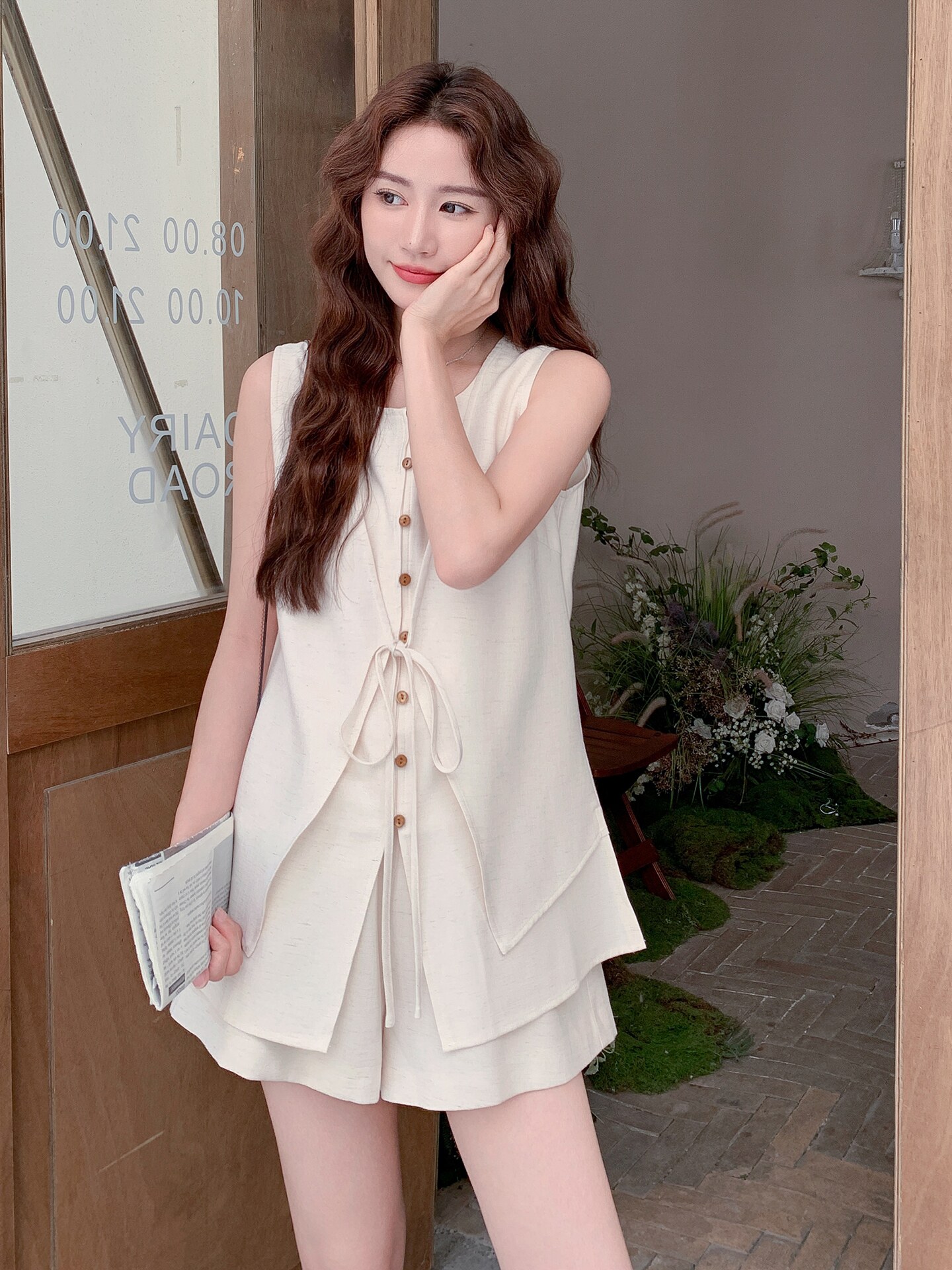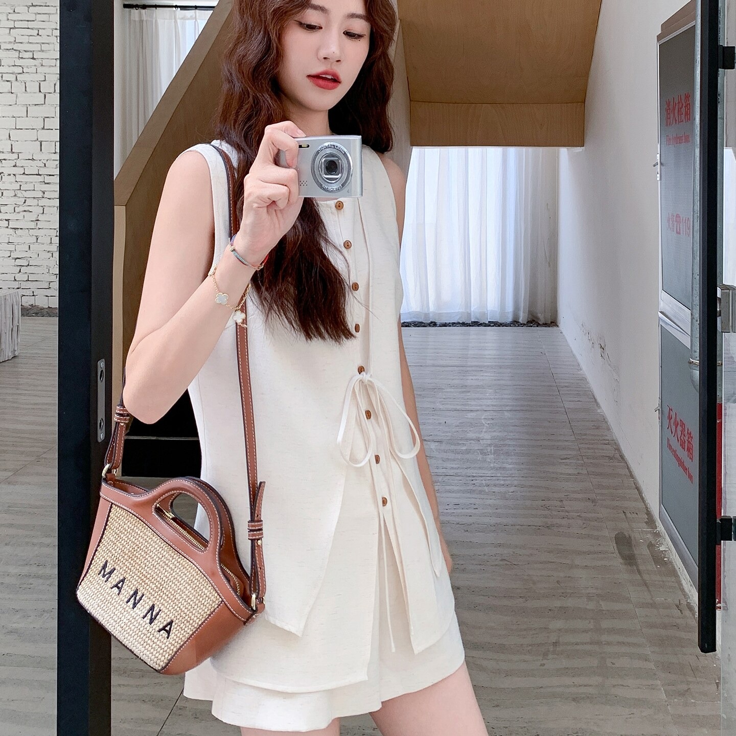 BY16561# 休闲无袖运动风套装女夏新单排扣系带马甲上衣短裤显瘦两件套 服裝批發女裝批發服飾貨源
