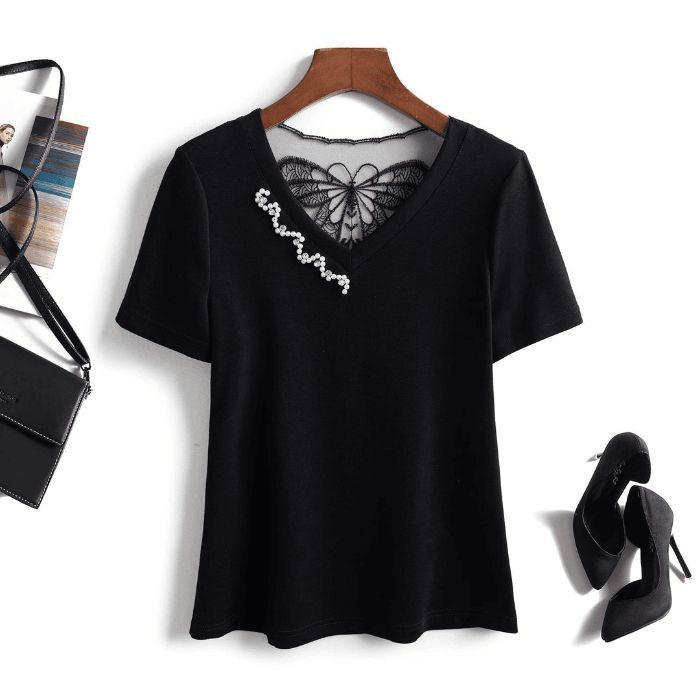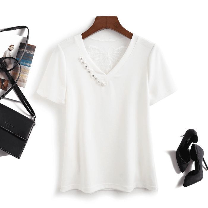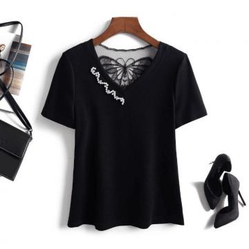 BY16577# 网红v领气质铆钉显瘦新款夏季短袖洋气美背蝴蝶减龄百搭小衫上衣 服裝批發女裝批發服飾貨源